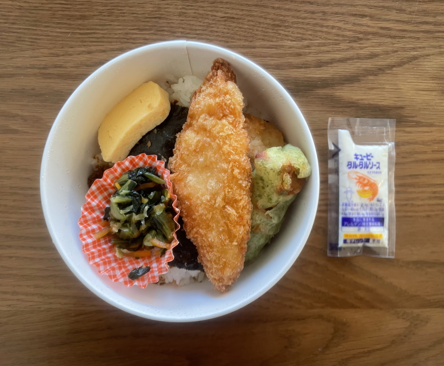 同コンビニにおける「店内手作り」バージョンのほうののり弁が新しいものに変わっていたので買ってみた。定価税込321円、熱量700カロリー。製造者は株式会社オネストで、添付調味料はキューピーのタルタルソースが一袋。コンビニのり弁ではめずらしいご飯の上にすべてのおかずが載る一体型で、容器はなんと丸形! おかずの種類は、白身魚フライ、ちくわ天、卵焼き、唐揚げ、小松菜炒め。で、その下に名刺上の海苔が2枚、さらにその下におかかというラインナップ。当ブログで200種近いのり弁を食べて続けてきたが、初遭遇の丸形のり弁にやや興奮しながらの実食。白身魚フライは、「手作り」を表明しているだけあって、柔らかくて美味。その食感がタルタルソースとすごく合う。ちくわ天は、青海苔の量多めで磯の味。これも良い。卵焼きはひどく甘く、「手作り」ではなさそうな工場製っぽいもので感心しない。唐揚げは、竜田揚げふうの衣で、生姜が効いていて悪くない品。小松菜炒めは、しょっぱすぎず、箸休めとしてちょうどいい。人参も入っているのが好印象。一方、ご飯のほうは、海苔の風味もよく及第点だが、ご飯の量はやや少なめかもしれない。というわけでの総合評価は、7点(10点満点中)。とにかく丸い容器に虚を突かれた感あり。これで税抜300円以下。十分満足できるのり弁だ。