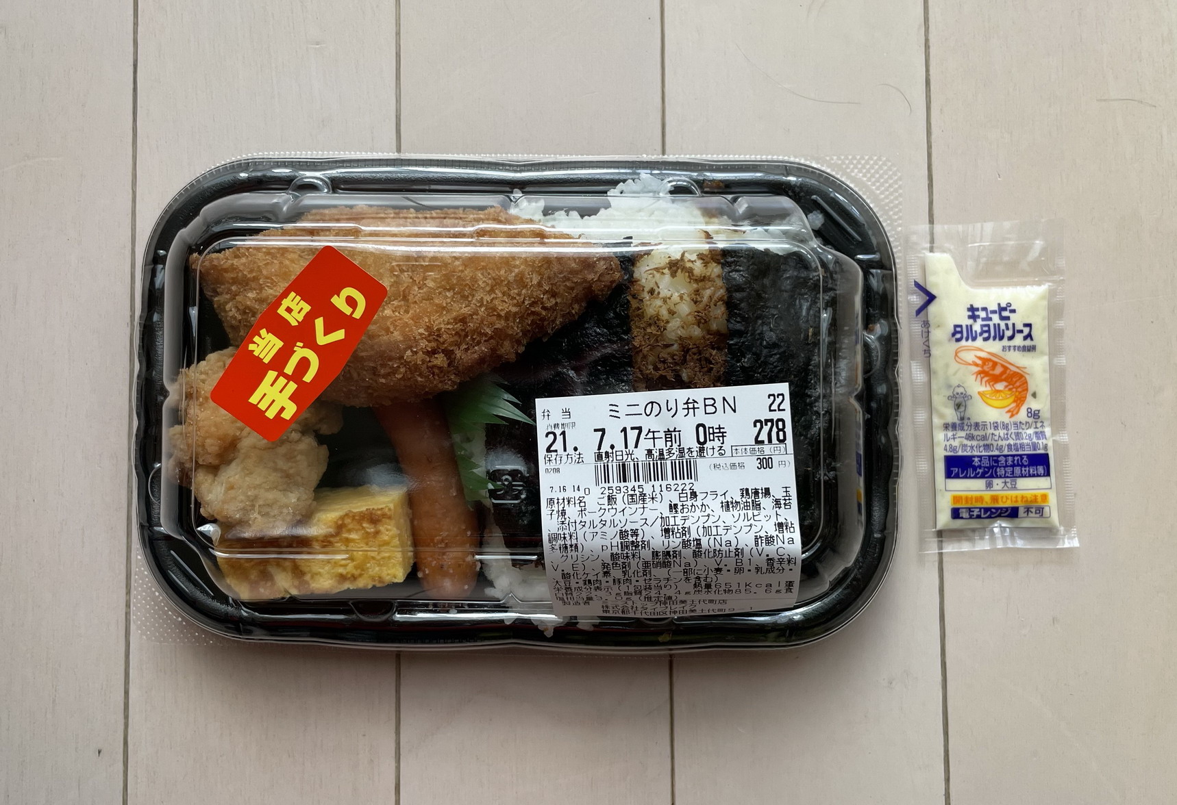 ミニストップには工場で生産された弁当のほかに、「店内手づくり」の弁当を販売している店舗がある……というのは以前書いたとおりだが、その手作りのり弁のミニ版を発見したので購入。定価税込300円、熱量651㎏カロリー。製造者はミニストップ神田美土代店 株式会社タイブレイク。添付調味料はキューピー製のタルタルソースが一袋のみ、だったが、弁当の横に「ご自由にお持ちください」の中濃ソースと醤油の小袋があった。おかずの一部(白身魚フライ)がほんの少しだけご飯の上の浸食している半セパレートタイプで、おかずの種類は、白身魚フライ、卵焼き、唐揚げ、ソーセージ。一方、ご飯サイドのほうは名刺大の海苔が2枚とおかか、という布陣。「ミニ」なのに、こんもり盛られたご飯にやや驚きながらの実食。まずメインおかずと思われる白身魚フライからいってみると、まあ冷凍品であろうが、通常のコンビニのそれよりはジューシーで「店で揚げた感」が多少感じられる品。卵焼きも手作り風のルックスで、特に焦げが「ちゃんと焼いた感」を醸し出している。唐揚げは、衣の形状からどちらかというと「竜田揚げ」に見える。割と内部まで醤油が染みていて美味しい。ソーセージは、噛むとパキッと割れる粗挽きでクオリティは高い。ケチャップがほしくなった。ご飯のほうは、前述のようにミニにしてはご飯が多めで面食らったものの、真ん中部分に振りかけられている大量のおかかに助けられて完食できた。結果、結構食べごたえのあるのり弁だったという印象で、評価は7点(10点満点中)。目立つように貼られている「当店手づくり」のラベルに洗脳させられたせいかもしれないが、同コンビニの、手作りではないのり弁よりは、明らかに食後「身体に悪いものを食べた感じ」が少なかった。