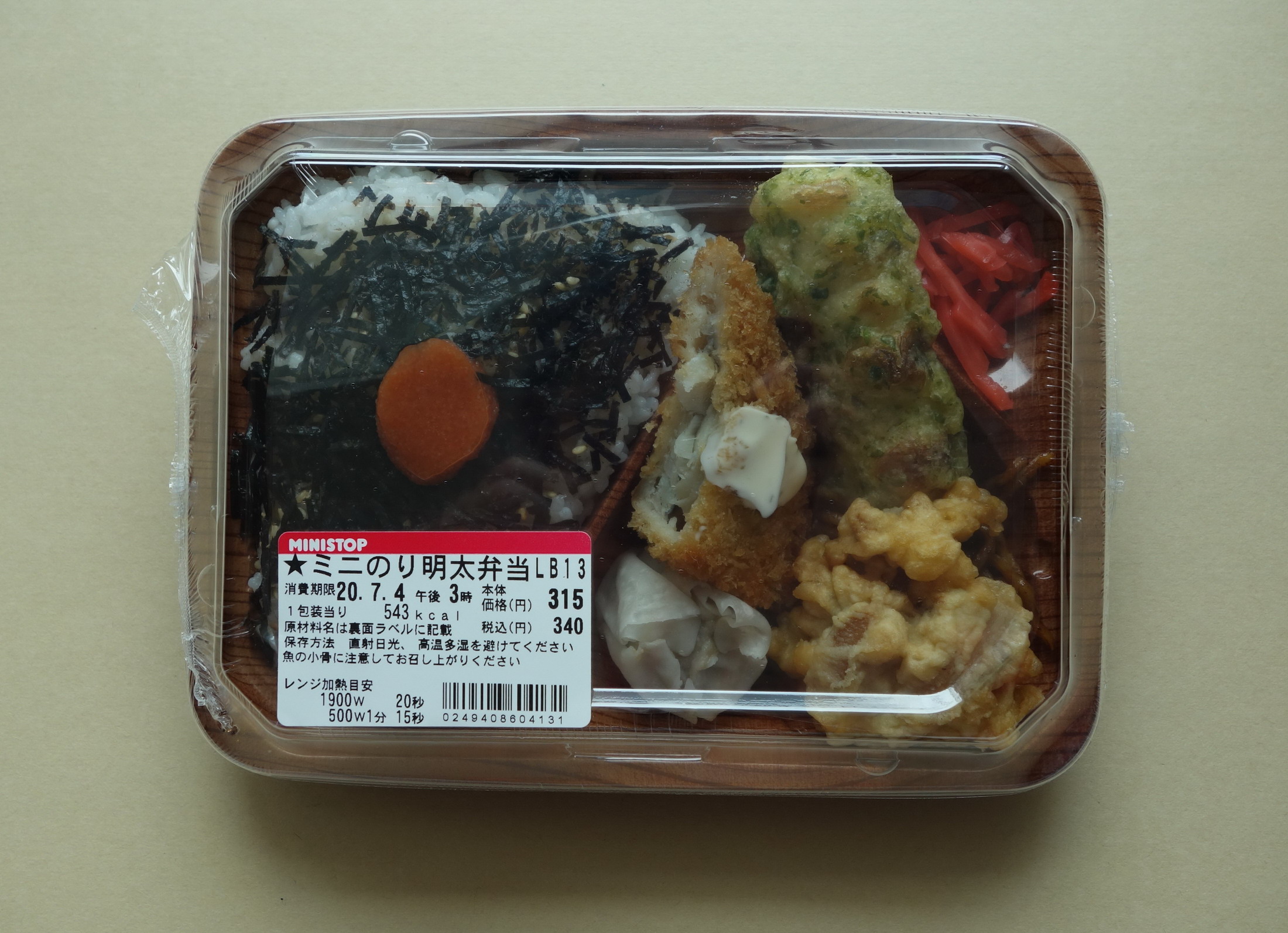 同コンビニで二度目となるミニサイズののり弁を購入。そのときのミニ弁当同様、普通のコンビニ弁当よりもふたまわりくらい小型の形状となっている。定価税込340円、熱量543キロカロリー。製造者は株式会社日本デリカフレッシュ千葉工場。おかずとご飯が分かれた位置にあるセパレートタイプで、添付調味料はなし。おかずの内容は、白身魚フライ、ちくわ天、鶏の唐揚げ、焼売、つけ合わせの具なし焼きそば、そして、紅しょうが。ご飯のほうは、のり弁としては極めてめずらしい、刻み海苔の載ったご飯、それからひとさじの辛子明太子という布陣。まずは、白身魚フライからいってみると、半切れでボリューム感がないのがやや寂しく、そのうえ、かけられているタルタルソースの量もたりないのも感心できない。ちくわ天もなぜだか化学的な味わいが前面に出ていて、はっきり言うと美味くない。過去のミニストップののり弁のちくわ天はこんなではなかったはずだが……? 唐揚げはほぼ90%が衣という代物で、これもかなりよろしくない品。焼売も同様に衣が厚く、餡は少量。焼きそばはやたらしょっぱく、紅しょうがある意味もよくわからなかった。一方、ご飯サイドのほうは、刻み海苔という新しいのり弁の可能性を感じさせてくれた点はまず評価したい(板海苔よりも食べやすく、しかも海苔の風味が強く感じられる)。明太子の量が少なくないのもまあまあよかった。しかし、点数は辛めの2点(10点満点中)。おかずに関してははすべてNG。ご飯のほうだけややかろうじて評価できるというのり弁であった。