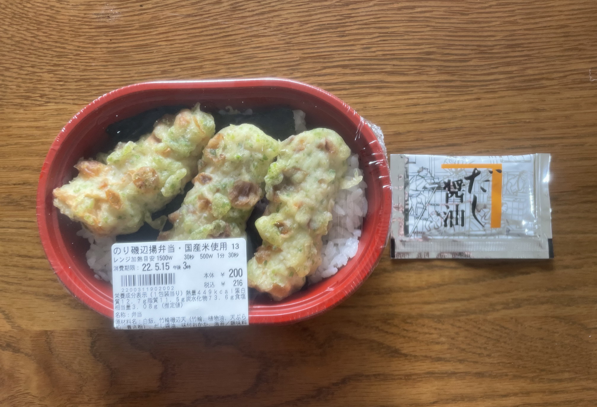同店の「だけ弁当」シリーズ第3弾となる本品。「だけ弁当」とは、弁当にはたくさんのおかずが入っているという常識を覆し、たった1品だけのおかずで構成された超ミニマムな弁当シリーズで、第1弾の「ウィンナー弁当」は83万食、第2弾の「ミートボール弁当」は32万食を売ったという。定価は税込216円。まぁ要するに究極の貧乏人向け激安コンビニ弁当である。すべてのおかず、ではなく、ちくわ天だけがご飯の上に載る一体型で、熱量は449キロカロリー。製造者はミシマデリカ株式会社。「だし醤油」という添付調味料がひとつ付いているという仕様となっている。ウィンナーとミートボールのバージョンは食していなかったので、その嫌味なほど質素なルックスにやや唖然としながらの実食。まずは添付のだし醤油をちくわ天に振りかけて食べてみる。この調味料、かなり甘めの味で、ネットの記事によれば、「さぬきうどんの本場である四国は香川県の鎌田醤油さんが製造する、ぶっかけうどんにも使う醤油」なのだという。確かにうどんに合いそうだが、ご飯とも相性がよく、美味い。3切れあるちくわ天自体は、そこそこというか可もなく不可もなくといった、よくコンビニののり弁に入っているちくわ天にありがちな品。だが、このだし醤油のおかげで味の下駄がひとつ履かせられた感じ。海苔は名刺大のものが2枚。期待はしていなかったが、その下の、ご飯とのあいだにおかかがちゃんと挟まっており、その量も少なくはなかったことには驚かされた。採算はかなりギリギリの商品だと思うのだが、こういうところに手を抜かなかった点は素晴らしい。評価は7点(10点満点中)。こののり弁の存在を知ったときには、おそらく「出オチ」のようなものであり、クオリティは低いであろうと予想したのだが、「国産米使用」も含め、意外とちゃんとつくられていることに感心した。ただし、もちろんこの一品だけでは腹いっぱいにはなれない。