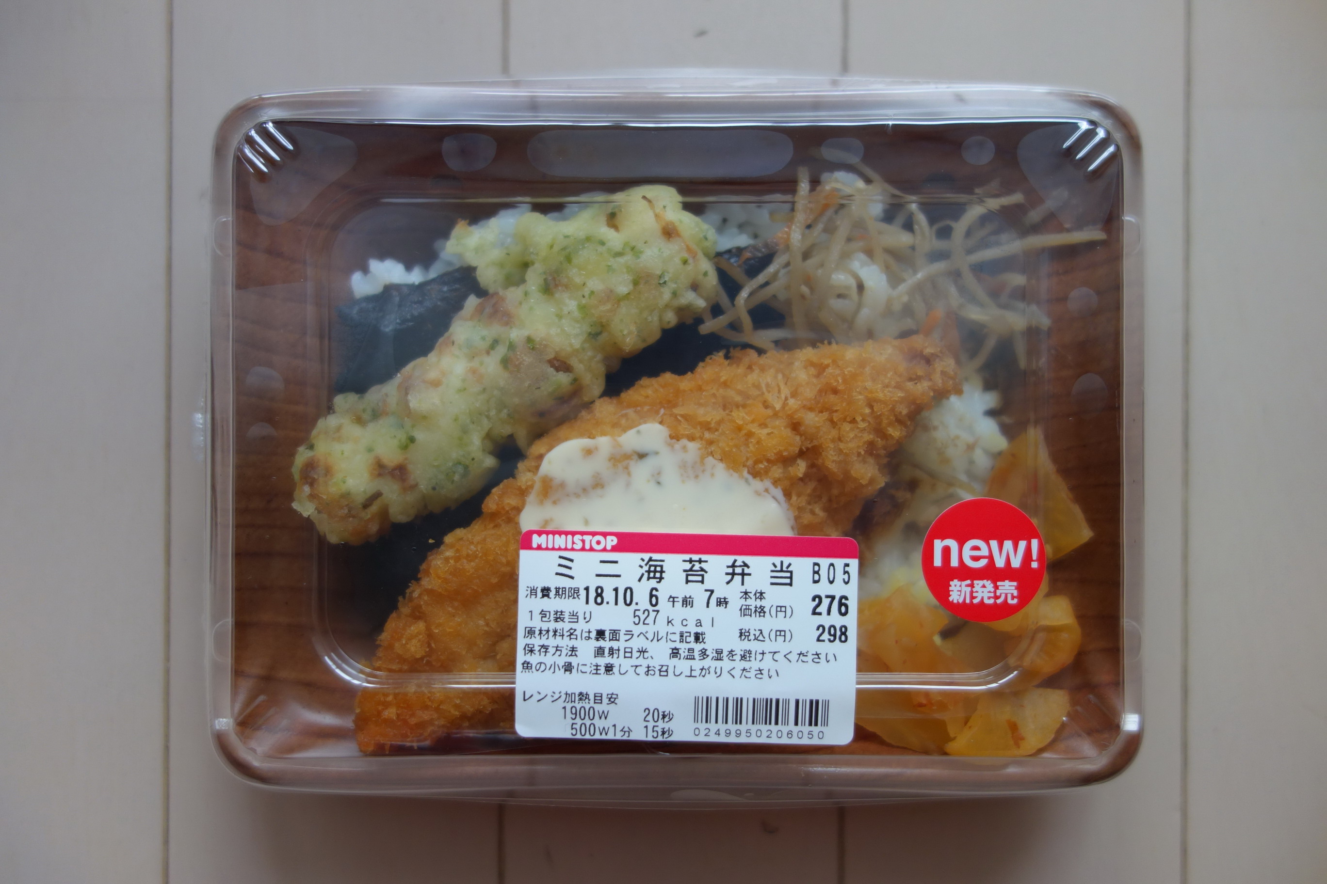 同店の新商品。ミニ海苔弁当の「ミニ」は「ミニストップ」のミニではなく、単に「小さい」の意。普通のコンビニ弁当よりも、ふたまわりくらい小型の形状となっている。定価税込298円。熱量527キロカロリー。製造者は株式会社日本デリカフレッシュ千葉工場(千葉県稲毛区)。すべてのおかずがご飯の上に載る一体型タイプで、白身魚フライ、ちくわ天、きんぴら、漬け物(大根のカツオブシ漬け)のみというシンプルなメニュー構成。添付調味料もなし(フライの上に少量のタルタルソースあり)。海苔はわりと分厚いものが1枚で、海苔とご飯のあいだはおかかオンリー。ボリュームからいって、正式な一食というよりは小腹が空いたときに食べる用なのだろうと思いながらの実食。白身魚フライはわりと小ぶりなもので、中の魚部分がややパサついていて△。ちくわ天は青のりの風味がかなりガツンとくるもので、なるほど、これなら醤油は必要ない。○。きんぴらは、量、味ともに印象が薄いもの。これも△。大根の漬け物はごく普通でコメントなし。ご飯サイドの海苔の質がしっかりしていたのと海苔の下のおかかの量が多めだったのはよかったが、それ以外は特に特徴というものが感じられない美味しくもないが不味くもないのり弁で評価は5点(10点満点中)。ただし、たとえばカップラーメンと一緒に食べるなら、(全体の食がかなり豪華になるという意味で)印象はかなり変わるかもしれない。