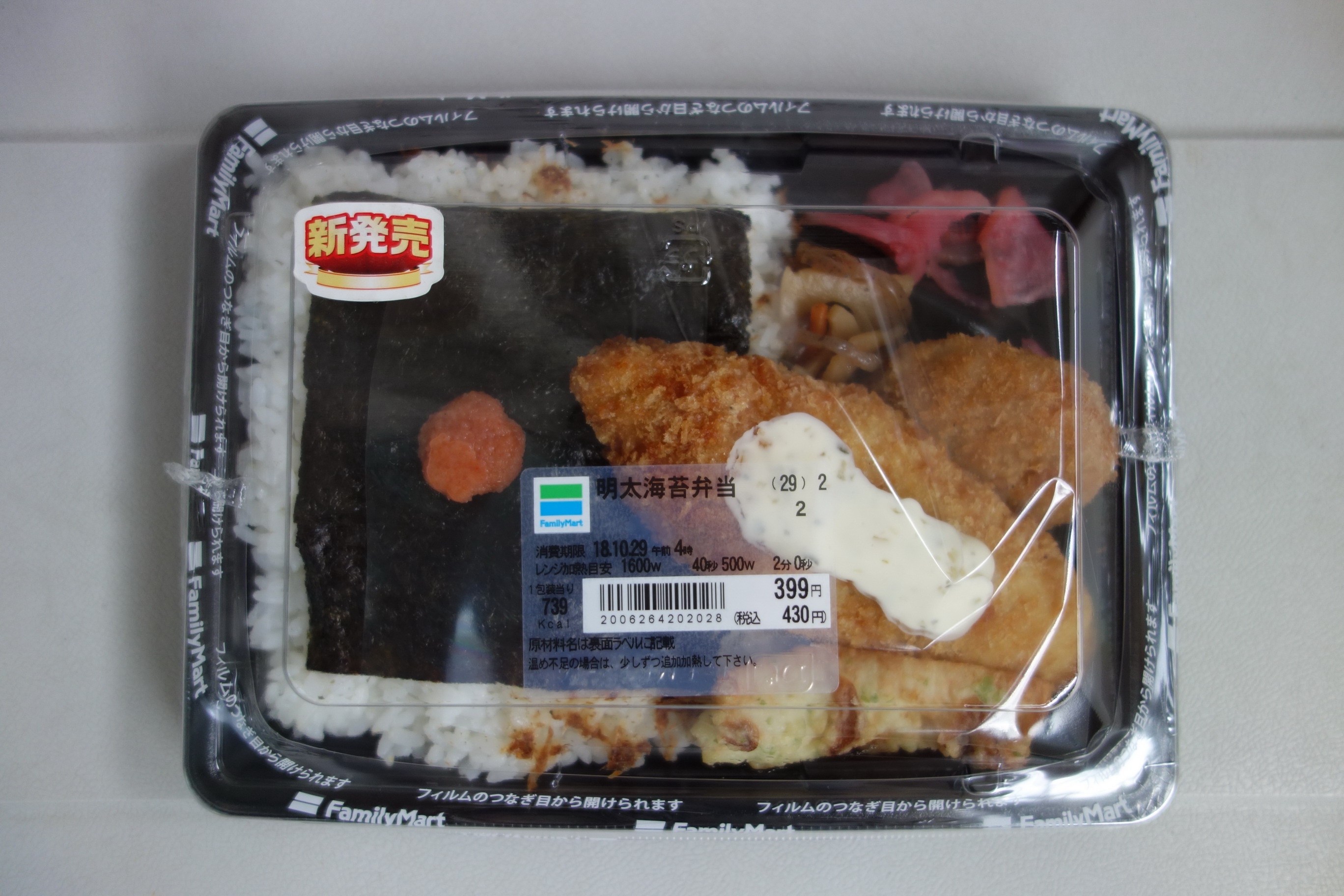 過去に2回(2種類)食べていたことのある同店の同タイトルののり弁が、またまたマイナーチェンジされて新発売ということになった。定価は税込430円で前回、前々回のものより20円安い。熱量は739キロカロリーで前回のものより25カロリー少なく、前々回のものより48キロカロリー多い。製造者は戸田フーズ株式会社戸田工場で、これは前と同じ。ご飯とおかずが分かれた位置にあるセパレートタイプであるのも前と同じ。添付調味料がないのも前回同様。大きく違っているのは、以前までの明太海苔弁当は辛子明太子が海苔の下にあったのに対し、今回、海苔の上にある点。しかもその量もかなり少ないものとなっている。おかずの内容は、白身魚フライ、ちくわ天、きんぴら、コロッケ、大根の桜漬けと、唐揚げもなければ焼売もなく、卵焼きすら消えたという、これまででもっとも貧相なラインナップとなっている。たった20円のディスカウントでこんなに差があるとは……とやや愁嘆しながらの実食。タルタルソースの載った白身魚フライは、身が厚くて食べごたえがあるもの。タルタルソースも酸味抑えめで美味しい。ちくわ天は青海苔が少なく、上品だが手応えにかける味。ここは醤油をかけたかったところ。一方、コロッケは少しだけソースが付着していたので安心して食べられた。味は普通。きんぴらは、人参、レンコン、コンニャク入り。前回のは唐辛子の味付けでやや辛かった記憶があるが、優しめの味に変更されていた。大根の桜漬けは特に感想なし。で、ご飯部門のほうは、辛子明太子の少なさがやはり悲しく、弁当名につけるのならこれまで同様もっとボリュームがほしかった。ちなみにおかかの量も決して多くはない。というわけで、総合評価は3点(10点満点中)とし、次回の新作に期待したい。