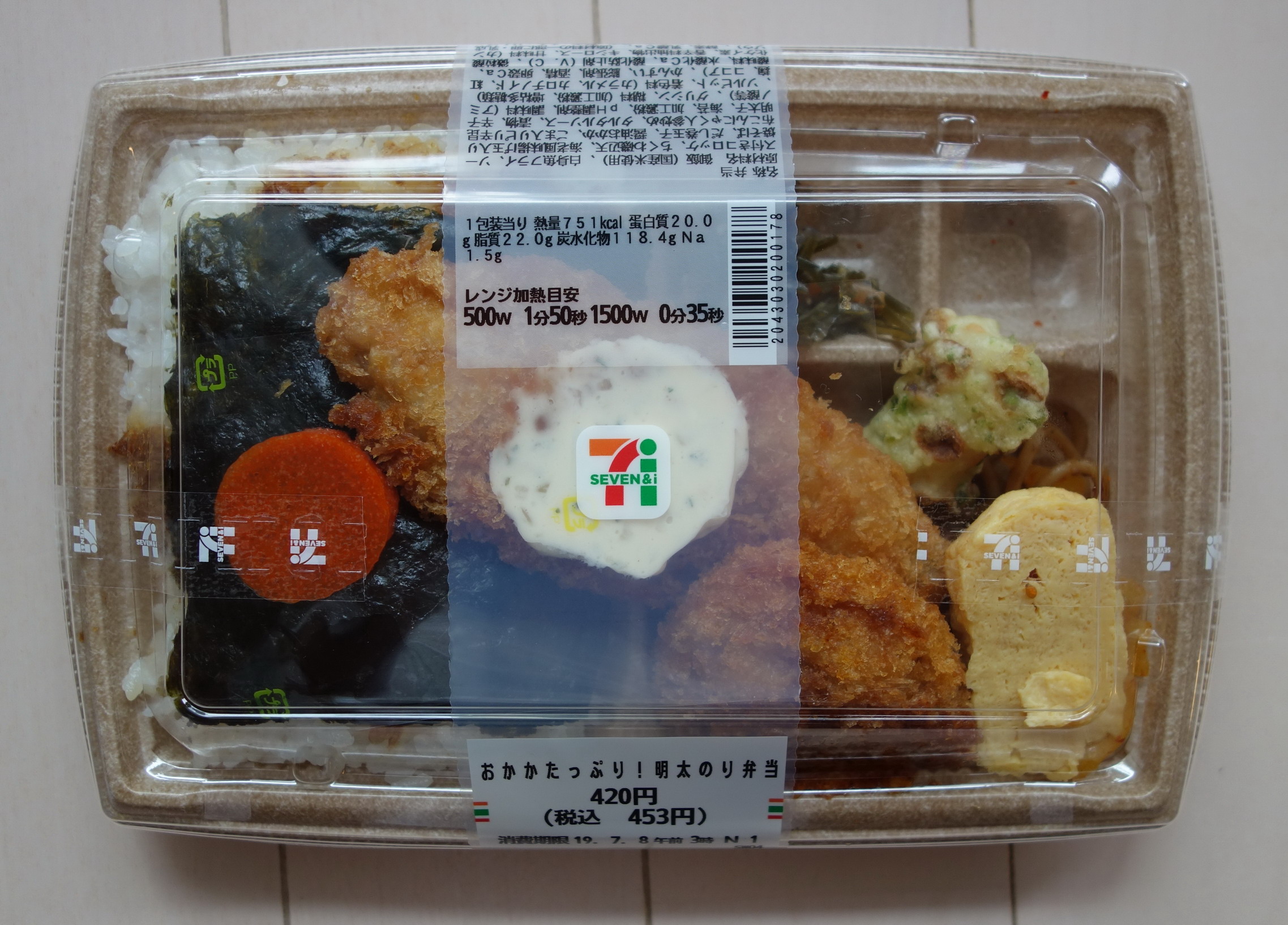 同店の「おかかたっぷり」シリーズがかなりひさしぶりにリニューアル。定価税込453円、熱量751カロリーと、それぞれ前回の「おかかたっぷり海苔弁当」よりも微増。製造者は株式会社武蔵野埼玉工場で変わらず。添付調味料なしも変化なし、おかずとご飯が分かれた位置にあるセパレートタイプであることも変わらない。リニューアルの内容としては、弁当名にあるように明太子が加わった点と、ヘルシー路線を中止し麦飯をやめ、普通のご飯になった点の2点が大きいといえるだろうか。おかずの布陣は、白身魚フライ、ちくわ天、コロッケ2分の1、卵焼き(原材料名には、「だし巻玉子」とあり)、焼きそば(同、「海老風味揚げ玉入り焼そば」)、昆布とコンニャクと野菜を煮たようなもの(同、「ごま入りピリ辛昆布こんにゃく人参炒め」)、大根の漬け物の7種。ご飯のほうはわりと多めの辛子明太子+海苔+おかかという構成。チンしてもなぜかほとんど加熱されなかった不思議な明太子にやや驚きながらの実食。白身魚フライはよくあるコンビニのり弁のそれで、美味くもなく不味くもない品。タルタルソースの量がもっとほしかったかもしれない。ちくわ天は、青海苔多めだが風味はそれほどでもなく醤油をかけたかった。あらかじめソースが付着しているコロッケは、チンしたらやわらかくなりすぎてマッシュポテトみたになってしまった。卵焼きは工場製品で味気ないが、たしかにほんのり出汁の味がした。焼きそばはピリ辛、昆布とコンニャクと野菜の煮物もピリ辛、大根の漬け物もピリ辛で、まあアクセントにはなっているが、ピリ辛、そんなにたくさんは必要ない。ご飯部門のほうは、明太子の量も多く、おかかの量も多い(前回の「おかかたっぷり海苔弁当」は「たっぷり」と言っておきながら、かなり少なくてがっかりした)ところを評価したく、総合的な点数は6点(10点満点中)。セブンイレブンののり弁の海苔はいつも箸で切れやすく食べやすい点も付記しておきたい。