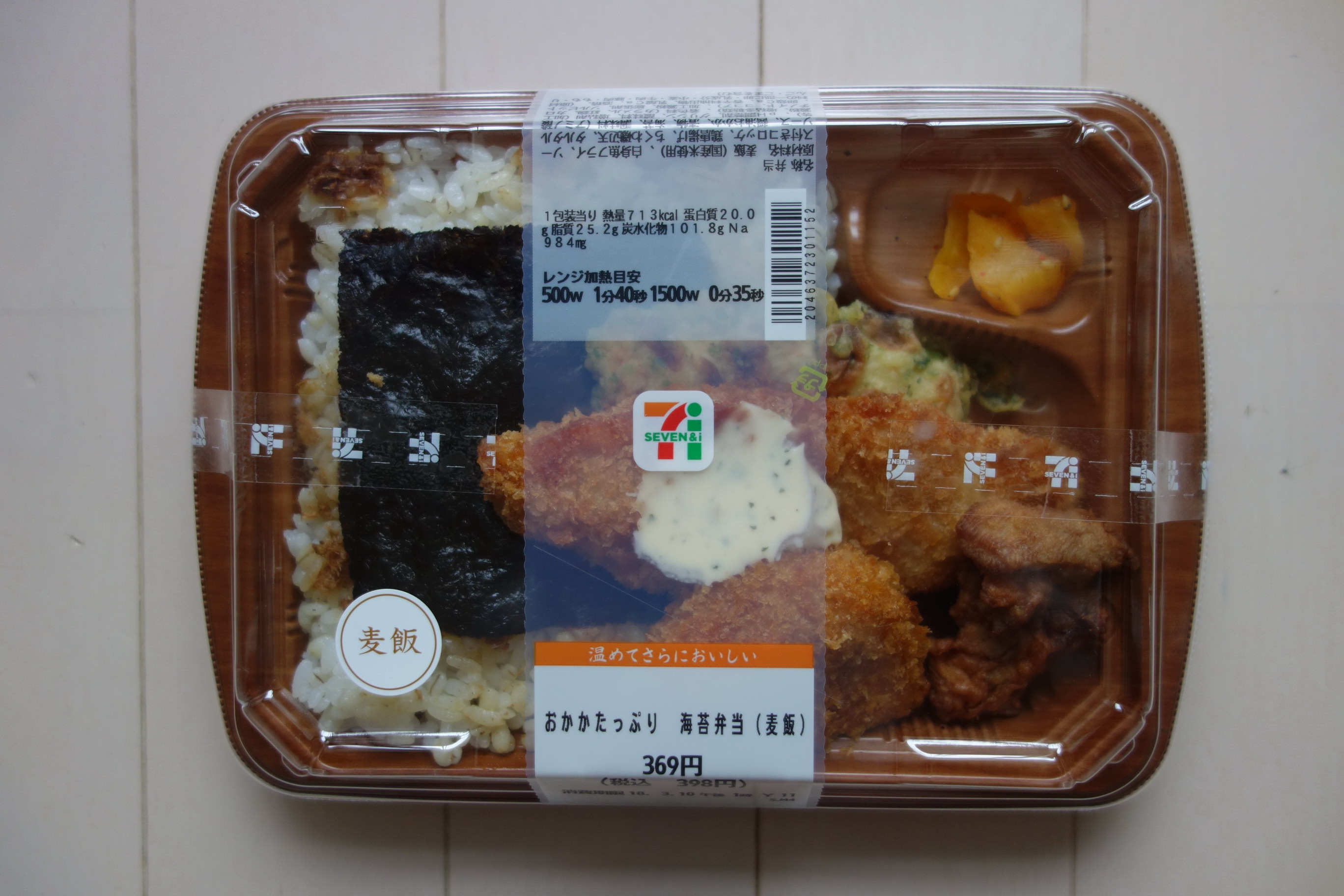 油断をしていたら、同コンビニ店ののり弁が新しいものに替わっていた。定価税込398円、熱量713キロカロリー。製造者は株式会社武蔵野埼玉工場。ご飯とおかずが分かれた位置にあるセパレートタイプで、なにもかけられていないコロッケがあるのに、添付調味料はなし。ご飯に麦を混ぜているというのがウリのようで、もともとジャンクなのり弁にヘルシー志向を強引に採り入れたチャレンジングな一品といえるかもしれない。おかずの布陣は、タルタルソースの載った白身魚フライ、ちくわ天、コロッケ2分の1、唐揚げ、沢庵……とのり弁としてはオーソドックスなもの。たしかに麦が混ざっているご飯の上には、正方形の海苔が1枚。というわけで、初めての麦飯のり弁に期待しながらの実食。白身魚フライは大きいのはいいが、衣が厚く身が小さくてがっかりさせられるもの。タルタルソースの量もかなり足りない。ちくわ天は青海苔が多くて香ばしい。これなら醤油なしでもイケる。コロッケも衣が厚く、中身はフニャフニャでポテトサラダ状態。しかもソースなしだと非常に辛い品だった。そうかと思えば、唐揚げも衣が厚いもので、というかほぼ衣といってもいい状態でこれはだいぶいただけない。沢庵はごく普通。で、問題の麦飯だが、たとえ少量であっても麦が混ざることの付加価値は高く、米100%より味も食感も大幅アップした感じ。健康になった気がする精神的充足感も大きい。しかしながら全体の評価は低く3点(10点満点中)。麦飯はいいのだが、おかずのクオリティがダメダメなので、もう少し頑張ってほしかった。「おかかたっぷり」と謳っていながら、それほどでもなかったのもマイナスポイント。