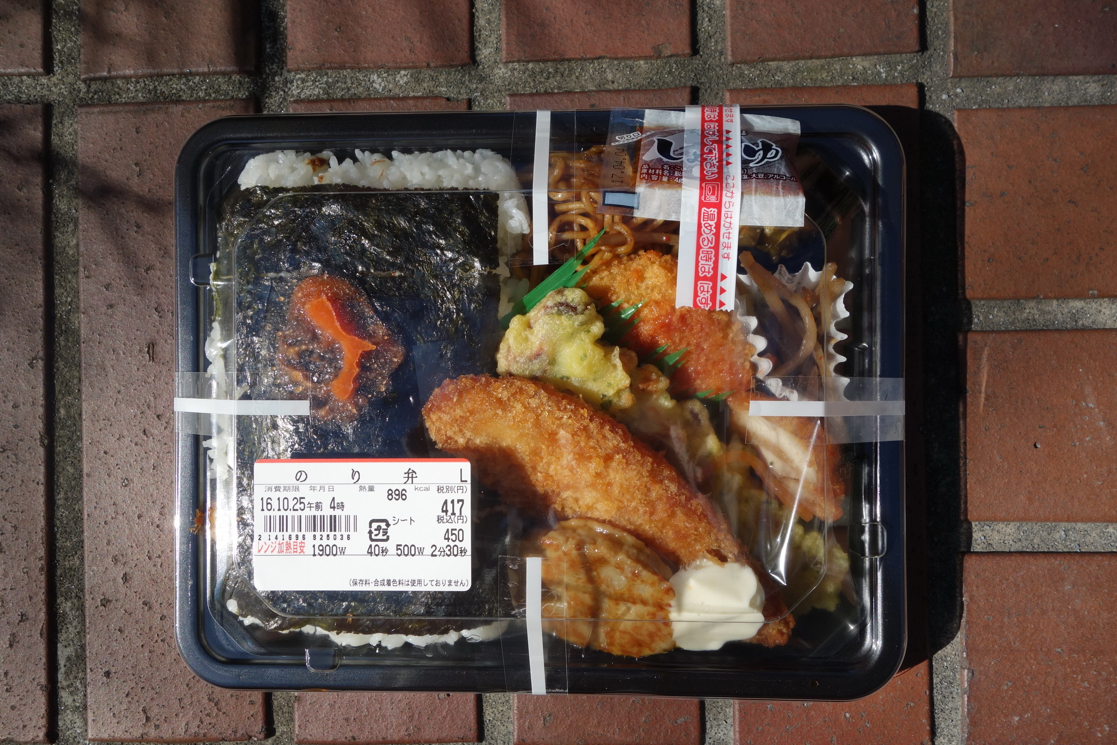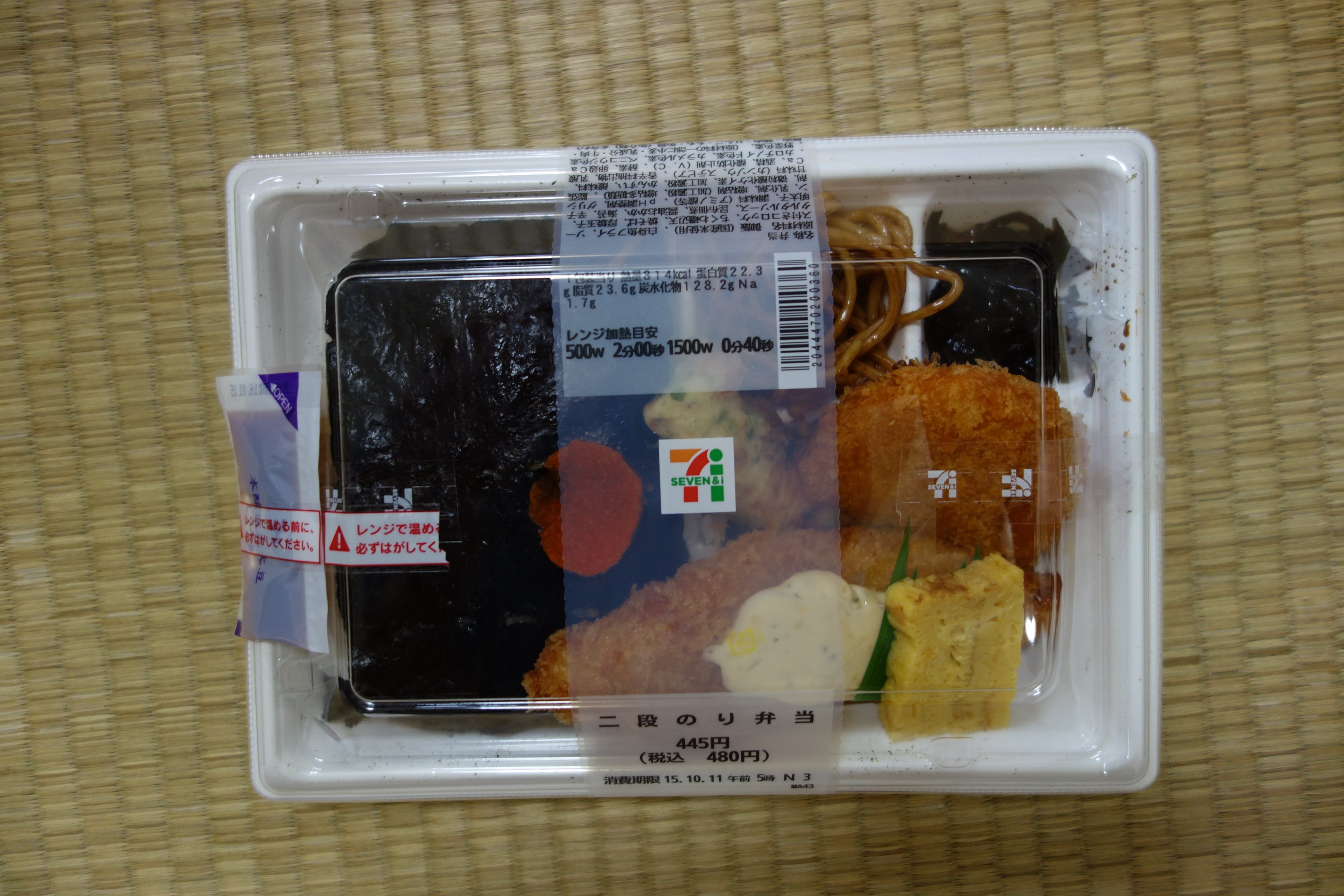 前は単なる「のり弁当」として販売していたものを、海苔部分を「二段」にすることでバージョンアップした、という経緯らしい。それにより定価は税込450円→480円に。熱量はなぜか(二段になったにもかかわらず)877→814カロリーと減少。製造者は株式会社武蔵野・埼玉工場で変わらず。ご飯部分は、普通ののり弁に比べてこんもりと盛りあがっている形状をしており、以前より見た目のボリューム感がアップしている。おかずは、白身魚フライ(多めのタルタルソースつき)、ちくわ天、コロッケ、焼きそばが前と同様で、鶏の唐揚げ、牛肉煮がなくなり、代わりに卵焼き、昆布のつくだ煮が追加された。添付調味料が醤油だけなのも前回同様。あと、海苔の上に小さじ一杯ほどの辛子明太子が載っている点が新味。食べてみる。白身魚フライは、前に感じたジャンクさと油っぽさがなくなり食べやすくなったように感じた。ジューシーで柔らかくて美味い。コロッケは、なにもかかっていないと思い醤油を大量にかけてみたが、ひっくり返してみたら裏にべっとりとソースが塗られていた。しょっぱくなってしまって失敗。ちくわ天は普通だが、前回よりやや小さくなった印象がある。おかずの一品として加わった昆布のつくだ煮は、できればご飯の下に入れてもらって、このスペースにはなにか別のおかずがほしかったところ。で、問題の「二段のり」だが、海苔の下のおかかが極めて少量なこともあり、海苔が二段になっていることで逆にモソモソして食べづらい。海苔の量を増やした点は評価したいが、それがあまり功を奏してはいない感じがした。ちなみに後半、扱いに困っていた昆布のつくだ煮をご飯に混ぜて食べたら美味かった。だから、やはり海苔を二段にするなら海苔の下の素材をもっと充実させてほしかったと思う。あと、扱いに困ったといえば、辛子明太子。最後までどう使えばいいかわからず、昆布と同様にご飯に混ぜて食べてみたが釈然としなかった。このように海苔の上に辛子明太子が載っているのり弁は最近よくあるが、どのように食すのが正解なのだろうか。評価は6点(10点満点中)。