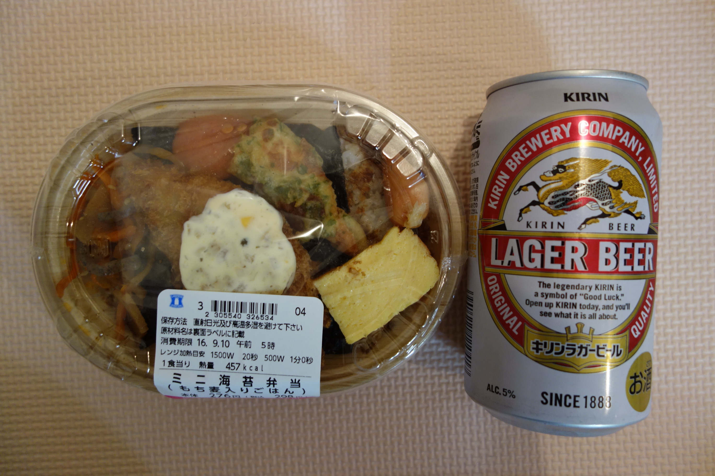 同店の弁当コーナーをのぞいてみたら、のり弁が前に食べたのと違っていたようだったので買ってみた。調べてみると、定価は税込450円で同じだが、熱量は1048キロカロリーから896キロカロリーにややダウン。製造者もカネ美食品株式会社から株式会社ナガイ馬絹センターに変更、それ以前に見た目がかなり違っている。前は海苔ご飯の真上に白身魚フライがドンと載っていたが、今回海苔の上にあるのは辛子明太子だけで、白身魚フライはおかずコーナーへ移動し、のり弁のタイプとしてはおかずの一部が海苔ご飯の上に載る半セパレートタイプとなった。そのほかのおかずは、ちくわ天、コロッケ半分、かなり小さい鶏の唐揚げのさらに半分、ハンバーグ、きんぴら、焼きそば、キュウリのキューちゃんみたいな漬け物という内容。添付調味料が醤油のみなのは前と同じ。なるほど……と思いつつの実食。白身魚フライの味は普通。ちくわ天は、前回同様大きくて食べごたえがあるが、味はやはり普通。コロッケはケチャップみたいな味のソースがあらかじめかけられているもので、味はやっぱり普通。唐揚げは硬くてパサついていていまいち。一方、きんぴらにコンニャクが入っているのは面白った。それから特筆すべきはご飯の量の多さ。前もこんなに多かっただろうか。こんもりと盛り上がっていてかなりのボリューム感。評価は5点(10点満点中)。辛子明太子は不要だったと思う。