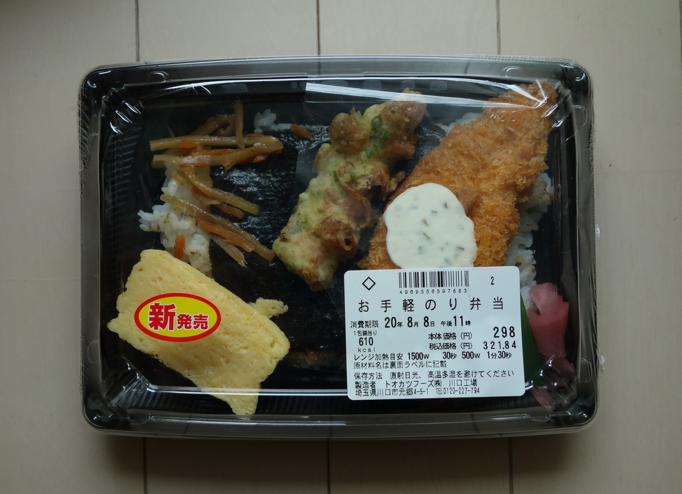 同店の通常の弁当類よりひとまわり小さいサイズでリリースされたのり弁。定価税込321円。熱量610キロカロリー。すべてのおかずがご飯の上に載った一体型で、製造者はトオカツフーズ株式会社川口工場。白身魚フライにタルタルソースがかけられているため、添付調味料は存在せず。おかずの種類はシンプルで、白身魚フライ、ちくわ天、きんぴらの「のり弁三種の神器」のほか、卵焼き、大根のさくら漬け。おかず群の下は海苔、さらにその下はおかか、そしてご飯という層になっている。そのちょっと寂しいルックスに萎えながらの実食。白身魚フライは、やや小さめだがのり弁によくある感じの形状のもの。不味くはないが、タルタルソースの量が圧倒的に足りない。ちくわ天も小ぶりで貧相な印象。だからかあっという間に食べ終わってしまい、美味しかったのかどうかもよくわからなかった。きんぴらも僅少。もうちょっと量が入っていてもいいのではないだろうか(味は極めて普通)。卵焼きは、ファクトリーメイドな代物で科学の結晶のような味。やたら甘いのが特徴的。大根の桜漬けも二切れ程度と非常に寂しい。海苔とご飯のあいだのおかかの量が少なくなかったことだけが及第点で、評価は2点(10点満点中)。なにか全体的に作り手の愛情がまったく感じられないのり弁で、期待していなかった期待値をさらに下回る結果の食事となった。