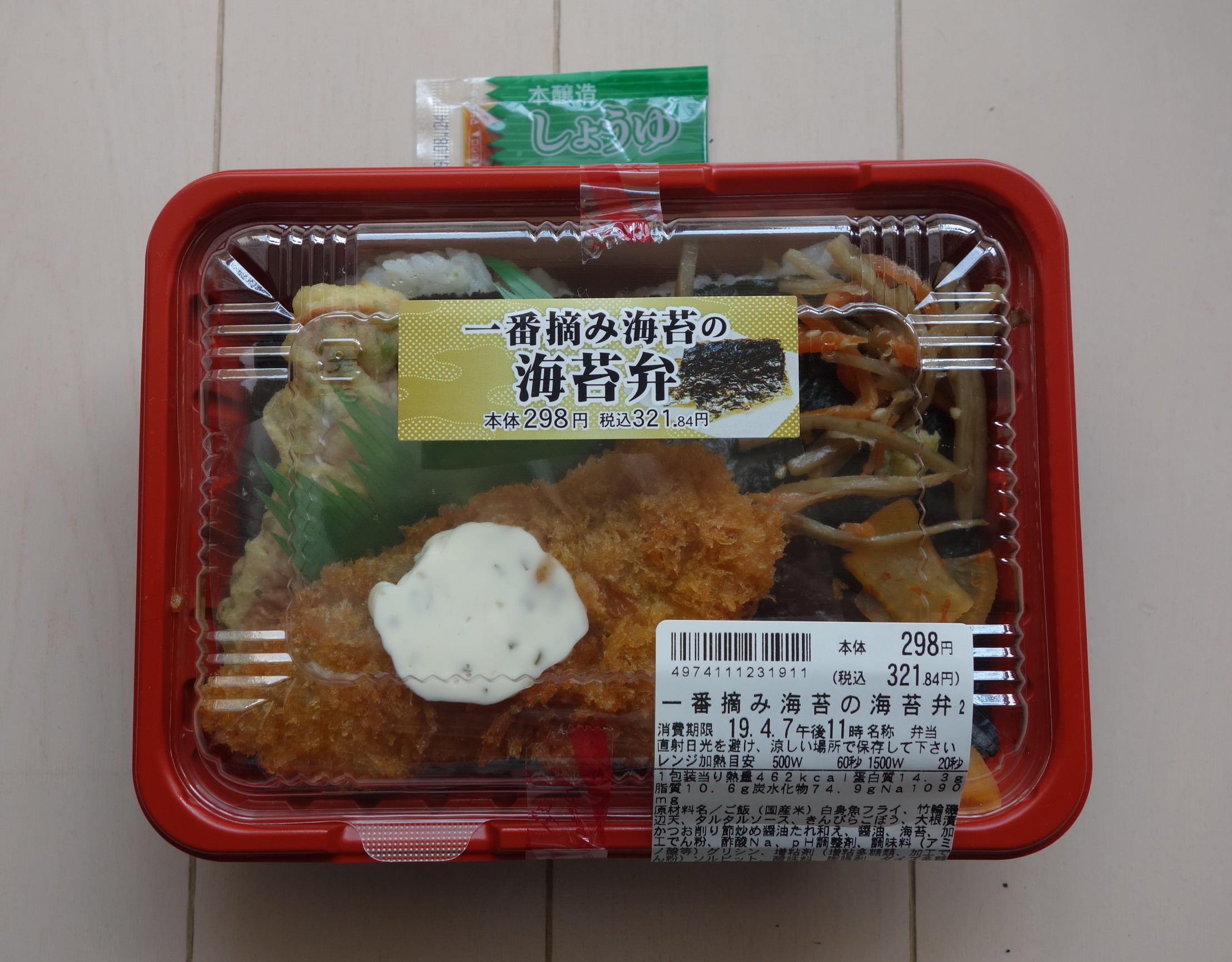 先日食べたばかりの同名ののり弁から早くもスピンオフ商品?が登場。前回よりもひと回り小さいサイズで、定価と熱量もそれぞれ税込397円→321円、603キロカロリー→462キロカロリーと微妙にダウン。製造者はシノブフーズ株式会社千葉工場で同様、添付調味料が「本醸造醤油」1袋のみであるのも同様。おかずは、前回のものから唐揚げと卵焼きがリストラされ、タルタルソースの載った白身魚フライ、ちくわ天、きんぴら、沢庵の4種だけとなっている(タイプとしてはご飯の上におかずが載る一体型)。実食したが、おかずの感想は前回同様なので割愛、ただし白身魚フライもちくわ天も前より若干小さくなっていたことを付記しておきたい。潮の風味を感じる海苔の品質の高さはあいかわらずよかったが、おかずが少なくなったことによる寂しさはどうにも拭えず、全体的になぜわざわざこんな小さめサイズに変える必要があったのかが謎の一品であった。評価は4点(10点満点中)。成人男性ならカップラーメンとともに食べることをお勧めしたい。