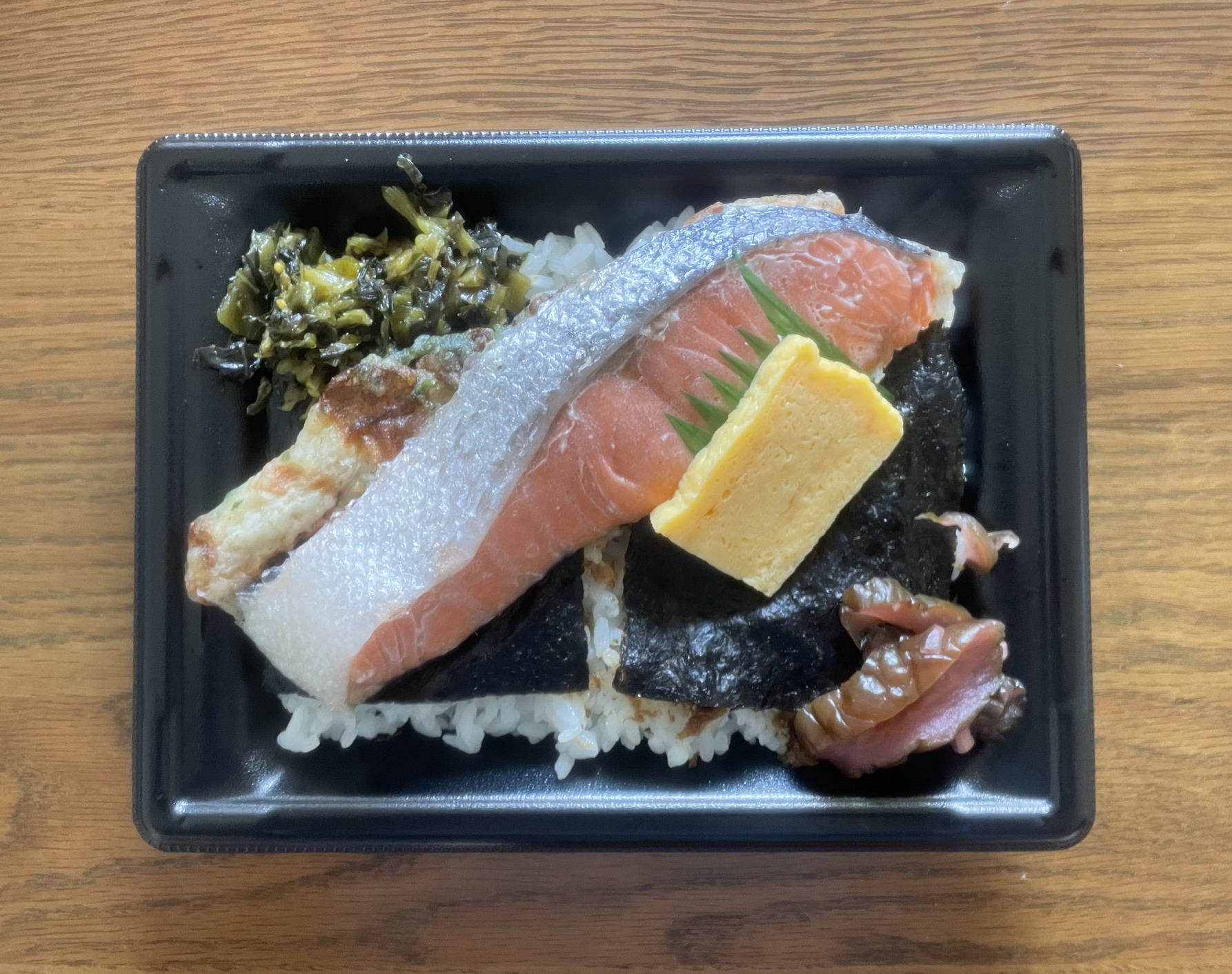 4年前の夏、基本形ののり弁を買ったスーパーに、新しいのり弁がリリースされていたので購入。定価税込430円、熱量564キロカロリー。製造者は株式会社よしや(舟渡生鮮センター)。すべてのおかずがご飯の上に載る一体型で、添付調味料はなし。おかずは焼き鮭、ちくわ天、卵焼き、高菜漬け、キュウリの柴漬け。ご飯のほうは、トランプ大の海苔が2枚におかか、という布陣。弁当名にも冠された迫力ある大きさの焼き鮭に目を奪われながらの実食。で、その焼き鮭、なにかの間違いかと思うほど柔らかく、いわゆる「脂がかなりのっている」品。これは良い。ちくわ天は、長さは20センチほどあるが、縦半分で、揚げすぎたのか細くて頼りない。味つけ濃いめ。卵焼きはファクトリーメイドなもので「甘い」意外に特にコメントなし。ずいぶんな量の高菜漬けは激しょっぱい味でご飯が進む。高菜漬けほどではないが柴漬けも結構しょっぱい。ご飯のほうは、おかかの量が多めなので、やっぱりライスも相当しょっぱ状態に。というわけで食べ終わり、以上を踏まえたうえので評価は6点(10点満点中)。量は少なめだが、焼き鮭のクオリティと全体的なしょっぱさのせいで結果的に満足感があった。塩分を必要とする夏にはぴったりののり弁だったかもしれない。
