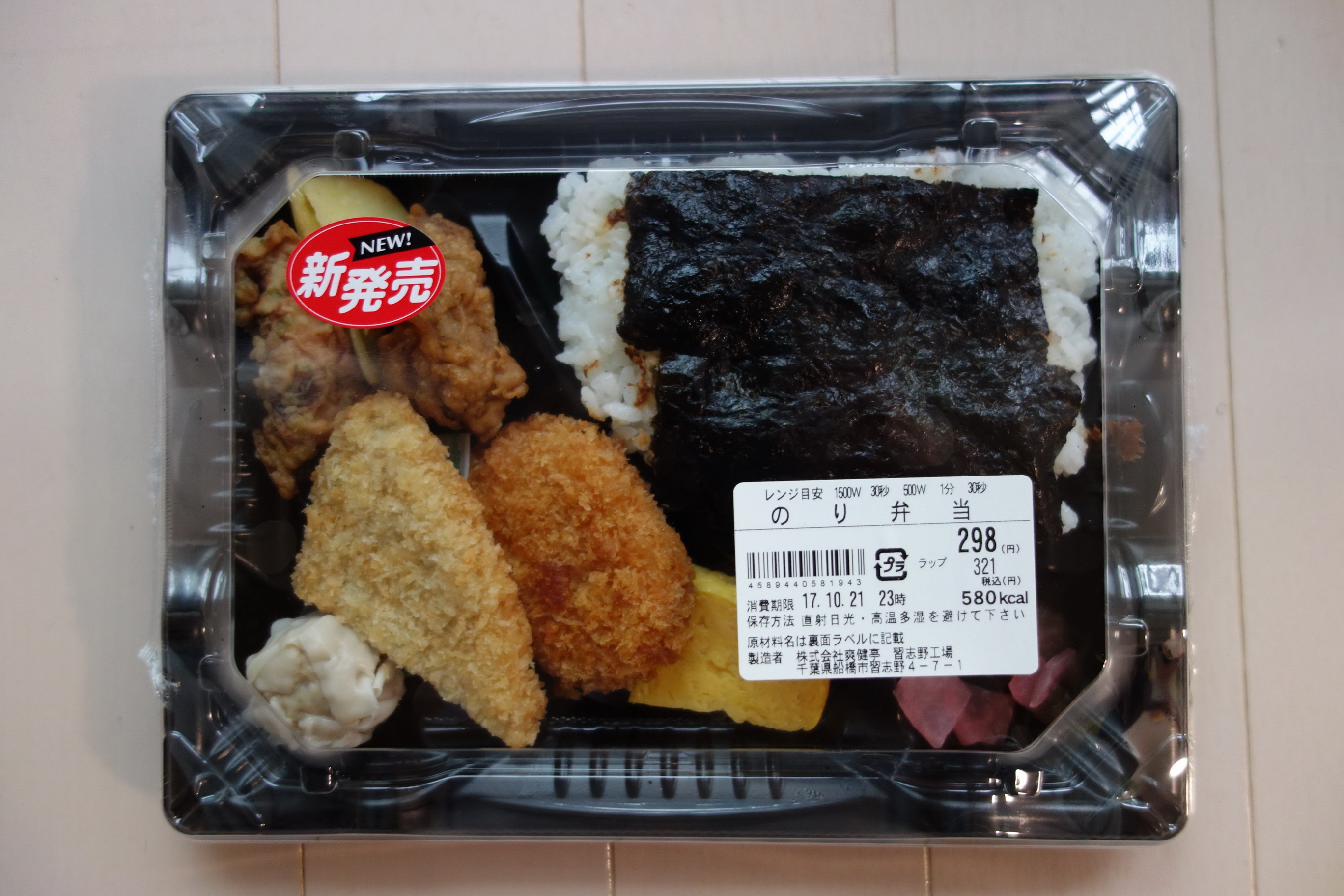 アコレの弁当売り場をのぞいてみたら、のり弁がリニューアルされたようで「NEW! 新発売」のシールが貼られたものが陳列されていた(表記はなぜか「海苔」→「のり」に変更)。定価税込321円。熱量580キロカロリー。製造者は株式会社爽健亭の習志野工場。ご飯とおかずが分かれているセパレートタイプで、おかずは、白身魚フライ、ちくわ天、コロッケ、ポテトフライ、卵焼き、鶏の唐揚げ、焼売、キュウリと大根の漬け物。海苔の下にはおかかのみで、添付調味料はなし……と思ってチンしたら、揚げ物の下に醤油の小袋が隠れていて、醤油も温める結果になってしまった。あのときとかこのときとかアコレののり弁ではあまりいい思いをしたことがないので、たいして期待せずの実食。白身魚フライは、衣が分厚く身は薄いという、いつもどおりの“アコレスタンダード”。醤油を大量にかけることでなんとか食べられた。コロッケは添加物の味しかしないが、醤油を大量にかけることで(以下同様)。ちくわ天は、とにかく小さすぎ。かたちも味も消しゴムを思わせる(消しゴムを食べたことはないが)。白身魚フライとコロッケに全部醤油を使ってしまったのが悔やまれた。のり弁では非常にめずらしいポテトフライは、時間が経っているせいでフニャフニャしていてとてもまずい。卵焼きは砂糖入れすぎでお菓子みたいな味。鶏の唐揚げと焼売はまあまあの味に思えたが、それまでがひどすぎたことによる気のせいかもしれない。というわけで、総合的な評価は2点(10点満点中)。おかずはひどかったが、これまで食べたアコレののり弁の中ではご飯が一番美味しかったような気がした(が、これも気のせいかもしれない)。