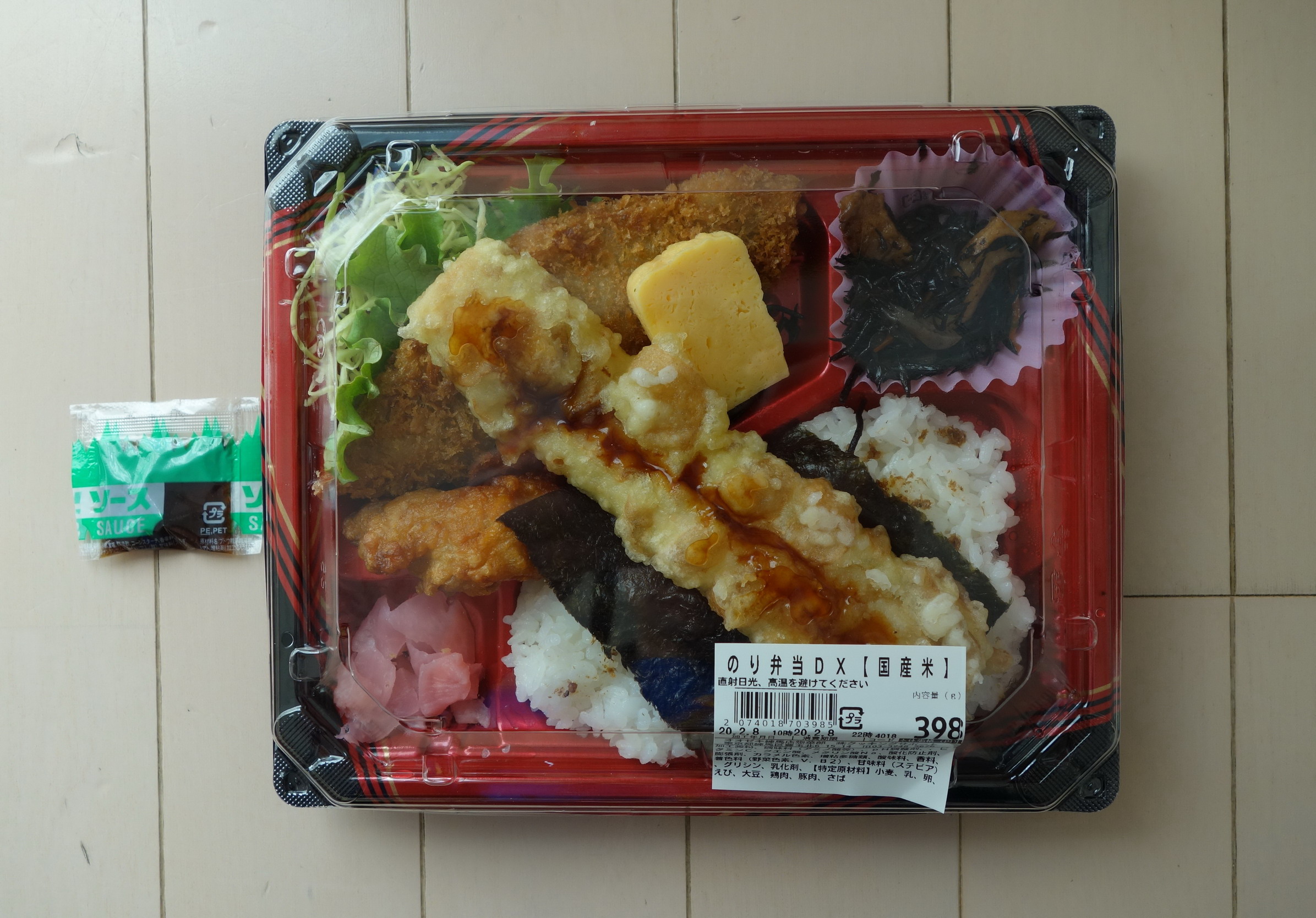 同店は東京都と神奈川県にチェーン展開しているスーパーマーケット。本ブログ用にのり弁を買うのは初となる。定価税込429円、熱量は記載なしのため不明。おかずの一部がご飯の上に載る半セパレートタイプで、添付調味料はソース一袋のみ。製造者はオオゼキ練馬店総菜部。おかずは、白身魚フライ、ちくわ天、唐揚げ、卵焼き、ひじきの煮物、生野菜(レタスとキャベツ)、大根の桜漬けの7種で、ご飯サイドのほうには名刺大の海苔2枚とおかか、という構成内容になっている。「DX」という仰々しい表記に根拠のない期待を抱きながらの実食。白身魚フライは、割合身はしっかりしているがちょっと生臭さが気になる品。添付された少量のソースではそれをカバーすることができなかった。ちくわ天は、タレ付きでずいぶんと軟度の高いもの。「からっと揚げられた」という状態からはもっとも遠い位置にある。フニャフニャしていてあまり美味くない。唐揚げは衣が異様に厚く、1センチ以上はある。中身はほんのちょっとで、どうにもやりきれない品。卵焼きは工場製品で甘いだけ。ひじきの煮物は、「ザ・家庭の味」という味で意外と悪くない。コンニャクと人参、それからちくわまで入っていた。生野菜と大根の桜漬けに対してはコメントなし。で、ご飯のほうは、おかかの量が僅少なのがかなり残念。「国産米」を謳っているがベチャッとしていてあまり品質のよい米には思えなかった。というわけで評価は2点(10点満点中)。「デラックス」と大きく出たが、結果的にはどこがどうデラックスなのかよくわからないのり弁であった。