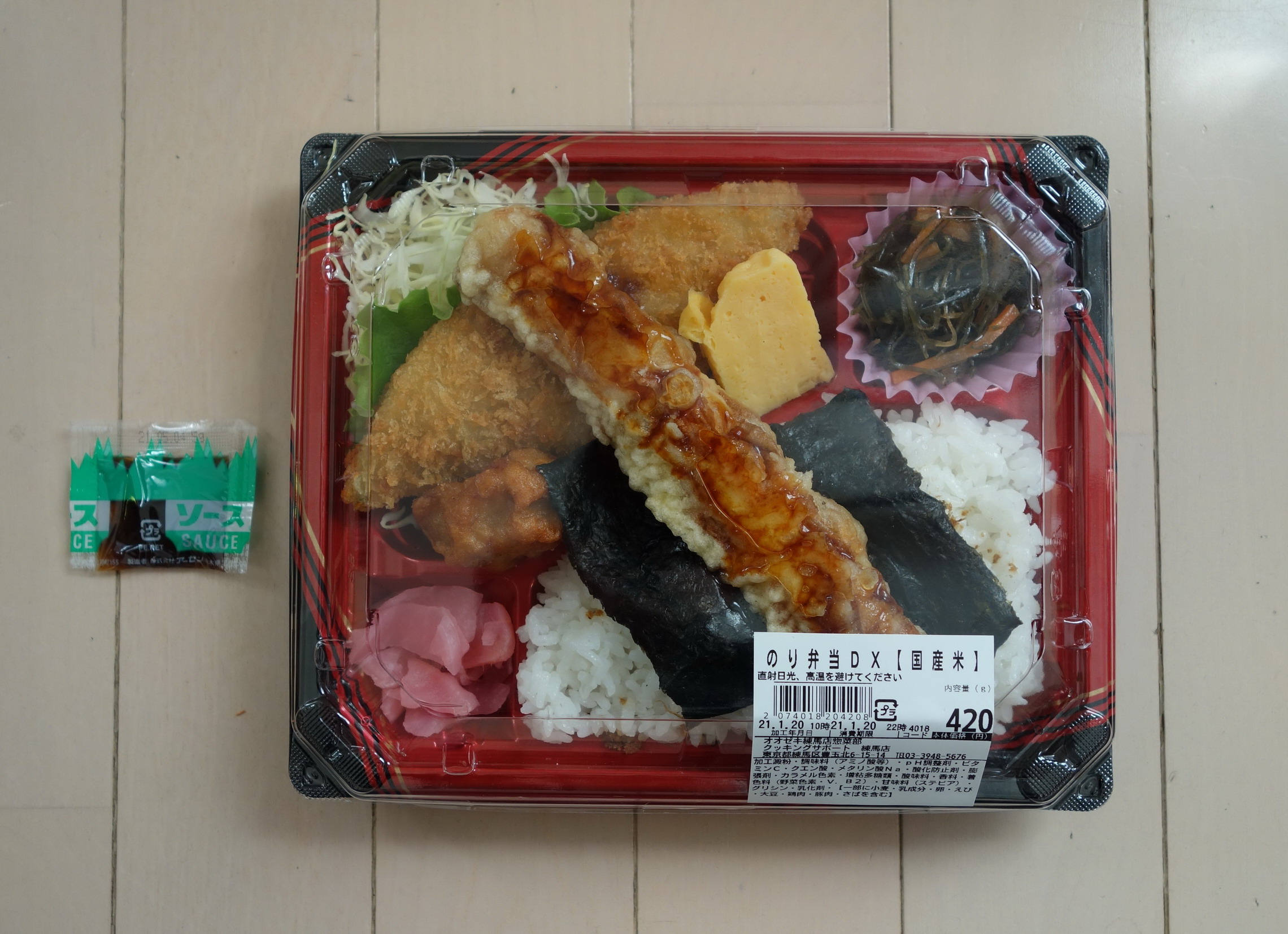 同店のこののり弁は2020年2月にも一度食べているが、内容が一部変わっていたようなので再購入した。定価税込462円(なんと前回のものより値下げ!)。カロリーは不明で、製造者はオオゼキ練馬店総菜部クッキングサポート練馬店。おかずの一部(ちくわ天)がご飯の上に載る半セパレートタイプで、添付調味料は、小ぶりのソース一袋。おかずの種類は、白身魚フライ、ちくわ天、唐揚げ1個、卵焼き、大根のさくら漬け、つけ合わせのキャベツとレタス、そして「切りこんぶ煮」。ご飯のほうは、小さめの海苔が2枚と、その下におかかがほんのちょっぴりという布陣。おかずの数がそれほど多いわけではないのに、なにがどうデラックスなのだろうと前と同じ疑問を抱きながらの実食。白身魚フライは、齧ってみると身がスカスカでちょっとガッカリ。前はこんなではなくもっと肉厚だったはず。長さ15センチ以上あるちくわ天は、ずいぶんと油っぽい品でご飯は進むが、べっとりと全面についたタレも濃く、ちょっと飽きる味。唐揚げはニンニク風味が効いていて前よりも相当美味い。これなら2個ほしかった。卵焼きは、依然ファクトリーメイドな代物で特に感想なし。大根のさくら漬けと付け合あわせの野菜にもコメントはありません。で、今回ひじきの煮物に代わり、新たにメニューインされた「切りこんぶ煮」。素朴な味だが、コンニャクと人参も入っていて箸休めとしては非常に有効。しみじみと美味しく、これはスーパーマーケットならではの一品といえる。一方ご飯のほうは、海苔も小さく、おかかの量も僅少なのが前と変わらずに残念だった。というわけで総合評価は3点(10点満点中)。デラックス感はやはり感じなかったが、33円も価格ダウンをしてきたところを評価したい。
