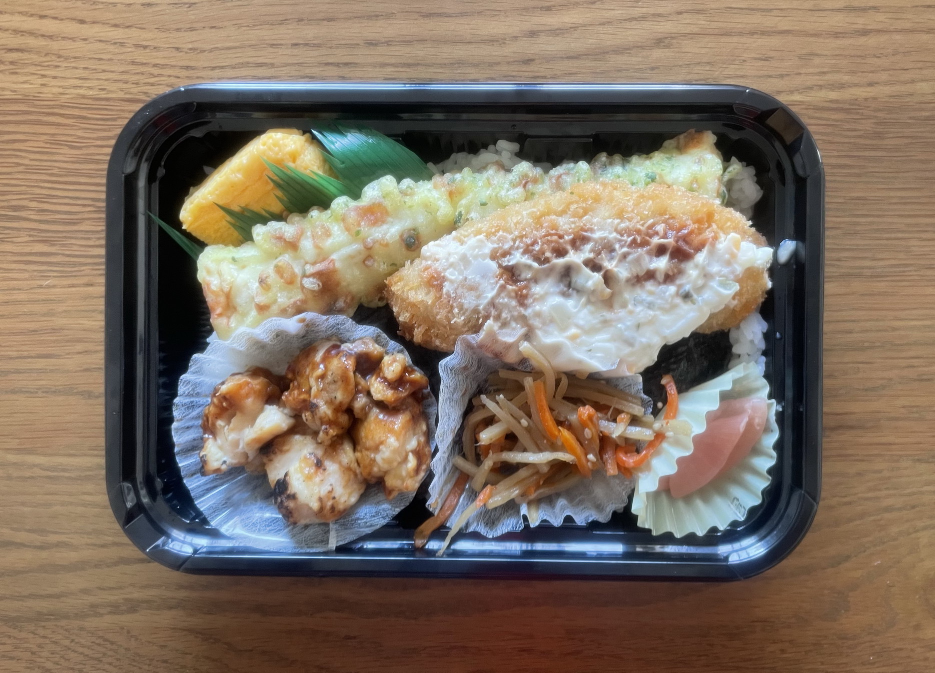以前に、「海苔弁当(鮭)」、「ミックス海苔弁当」、「海苔弁当~焼鳥入り~」というのを食べたことのある同スーパーの新作?のり弁。すべてのおかずがご飯の上に載る一体型で、熱量933キロカロリー、製造者は株式会社コモディイイダ徳丸店。添付調味料はなし。おかずの種類は、白身魚フライ、ちくわ天、きんぴら、焼き鳥、卵焼き、大根の桜漬け。ご飯は大盛りということで、海苔とともに容器一面にびっしり敷き詰められている。白身魚を「鱈」とわざわざ商品名として銘打っているところにこだわりを感じながらの実食。その白身魚フライ、いや鱈カツは衣が薄く、身がぎっしりという品。かかっているタルタルソースの量も多いので、ものたりなさは感じられない。ちくわ天は、尺が結構あるもので青海苔もたっぷり。こちらも食べごたえあり。きんぴらは、人参とゴボウのみの構成だが、ゴボウのシャキシャキの食感が悪くない。弁当名にも冠されている焼き鳥は濃い味でやたらと甘く、ちょっと閉口。その分、卵焼きは甘くなくさっぱりしていてよかった。大根の桜漬けはごく普通のもの。で、ご飯のほうは、「ご飯のタレにだし醤油使用 鰹節、昆布、煮干しの旨味が利いた」というだけあって、ご飯に染みたタレが非常に美味い。海苔とご飯のあいだには鰹節も昆布のつくだ煮も存在していないが、このタレだけで十分にご飯が進む。ライスの量も確かに大盛り。問題なくお腹いっぱいになった。というわけで今回ののり弁、総合的な評価は7点(10点満点中)。全体に可もなく不可もなくのバランス型。ただし、焼き鳥だけが入っている意味を理解できなかった。