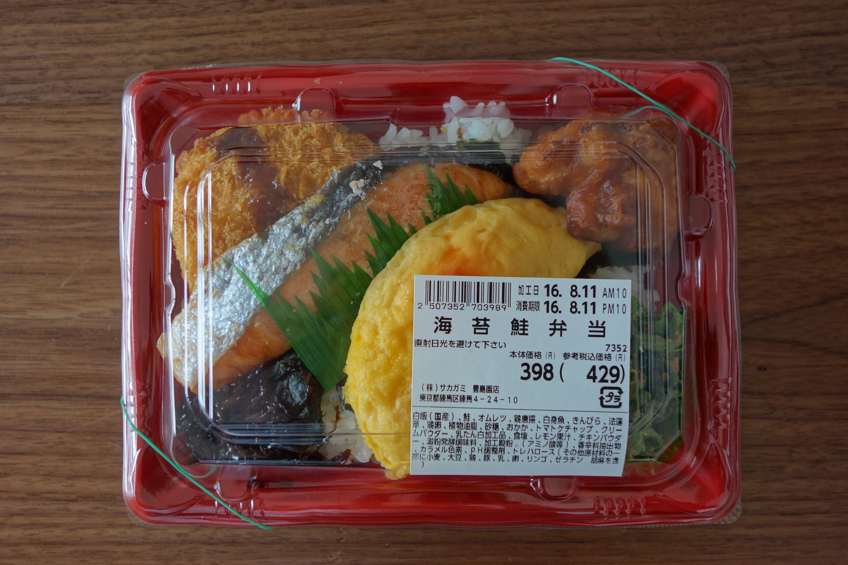 定価税込429円。熱量は不明。サカガミは都内にある高級路線のスーパーで、品ぞろえは明治屋とか成城石井に近い(高価なワインとかチーズなどが豊富)。がしかし、弁当類は意外と普通な感じで、こののり弁のほかにもカツ丼とかハンバーグ弁当のような庶民的な弁当が他スーパーよりやや割高の価格で陳列されている。こののり弁は、海苔オンザご飯の上におかずのすべてが載った典型的な一体型タイプで、内容は、弁当名にも冠された焼き鮭を筆頭に、卵焼き、鶏の唐揚げ、コロッケ半分、ホウレンソウのゴマ和え、昆布のつくだ煮、と品数が多め。実食してみると、どれもがやさしい味つけでレトルト感があまりない。焼き鮭は、身が厚く香ばしいもので塩味控えめ。少しだけケチャップが載せられた卵焼きも薄味。これも化学調味料的な風味は感じられない。鶏の唐揚げも薄味だが、齧ると肉汁が出るほどジューシーでよかった。コロッケはなぜかコーンが大量に入っていて、だからか小さいわりにはお得感がある。ホウレンソウのゴマ和えの量の多さも評価すべき点だろう(そもそものり弁にこういう緑色系野菜が入っているのはめずらしい)。量が多いといえば、海苔の下のおかかも多めでよかった。というわけで、総じてコンビニののり弁のようなジャンク感を期待すると足もとをすくわれるが、毎日でも食べられそうな身体にやさしい弁当であり、通常ののり弁を食べたあとのような後ろめたさはまったくなかった。評価は分かれるだろうが、ここでは比較的高評価の7点(10点満点中)としたい。全体に薄味のわりには食べごたえもある。