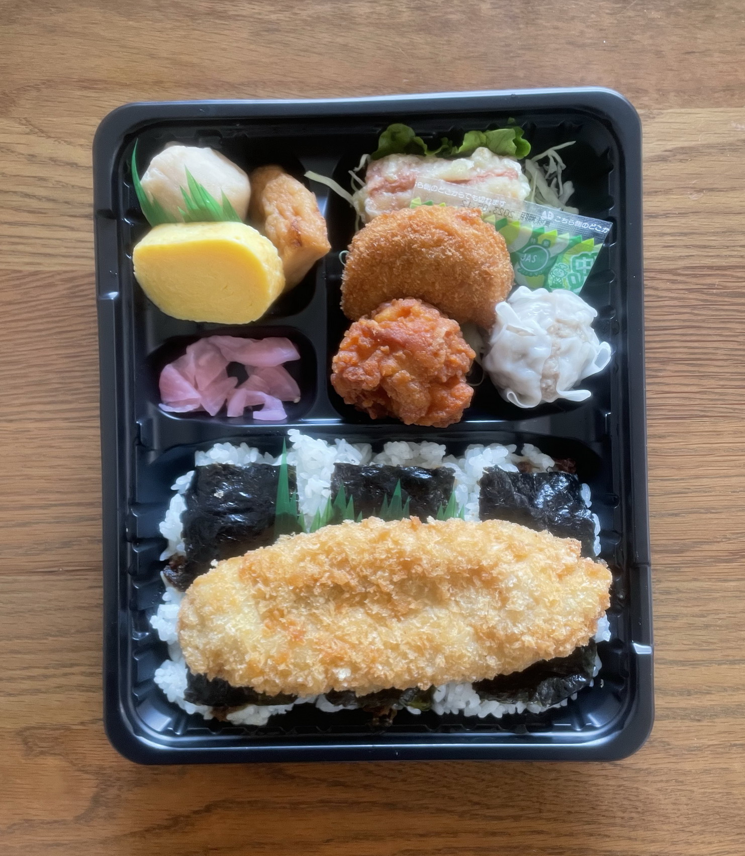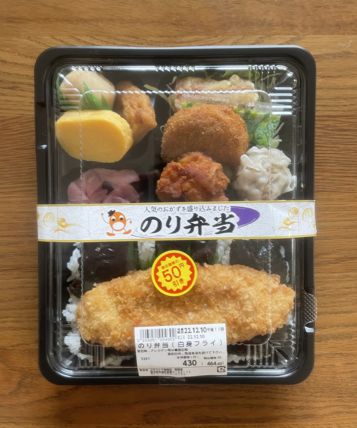新宿区歌舞伎町近くにある同スーパー。調べてみると、創業者の小林平三氏は、1935年に新宿で氷の卸・販売業を創業、1952年にこのスーパーを始めたという(三平の屋号は創業者の名前を逆にしたもの)。そんな店の弁当売り場で販売されたいたこののり弁。定価税込465円、のところが50円引きで415円。製造者は三平ストア新宿店総菜部。熱量は記載なしで不明。おかずの一部(白身魚フライ)がどーんとご飯の上に載る半セパレートタイプで、添付調味料はソース一袋。おかずの種類は、白身魚フライ、ちくわ天、唐揚げ、コロッケ2分の1、焼売、卵焼き、里芋煮、がんもどき煮、大根の桜漬け、つけ合わせのレタス、キャベツという結構豊富なラインナップ。一方、ご飯のほうは、小さめの海苔3枚におかかという布陣。フタを開けるとさらに巨大に見える白身魚フライに期待しながら実食。で、そのフライ、物量としてやっぱりかなり食べごたえのある品。だがしかし、調味料が小さなソース一袋のみというのはずいぶんと心もとない。コロッケにも使用したので、味的には薄目で結果的には迫力のない一品となってしまった(全体としてソースはあと2袋はほしかった)。ちくわ天は、青海苔がいっさいなし。だからこちら用にも醤油袋がほしかった、とまたしても不満点あり。唐揚げは、衣がほぼない、素揚げに近いもの。そのためか、ややパサ気味。次いで、コロッケは普通……と思いきや、粗挽きの挽肉がごろっと入っていて意外にも◎。焼売と卵焼きは、いかにも冷食という感じで感心しない。こちら2品にもやっぱり醤油が(以下略)。漬け物とつけ合わせの感想は省略し、煮物の類は、薄味、だが出汁は効いていて田舎風、ほっこりさせるものがあった。ご飯のほうは、賞味期限切れ間近のわりには海苔のしけ具合がそれほどでもなかったのはよかったが、おかかはもう少し量が必要だったと思う。というわけで総合評価は5点(10点満点中)。老舗たるスーパーの風情は感じられない。だが逆に、それが新宿歌舞伎町らしいといえばらしいといえる、かもしれない。