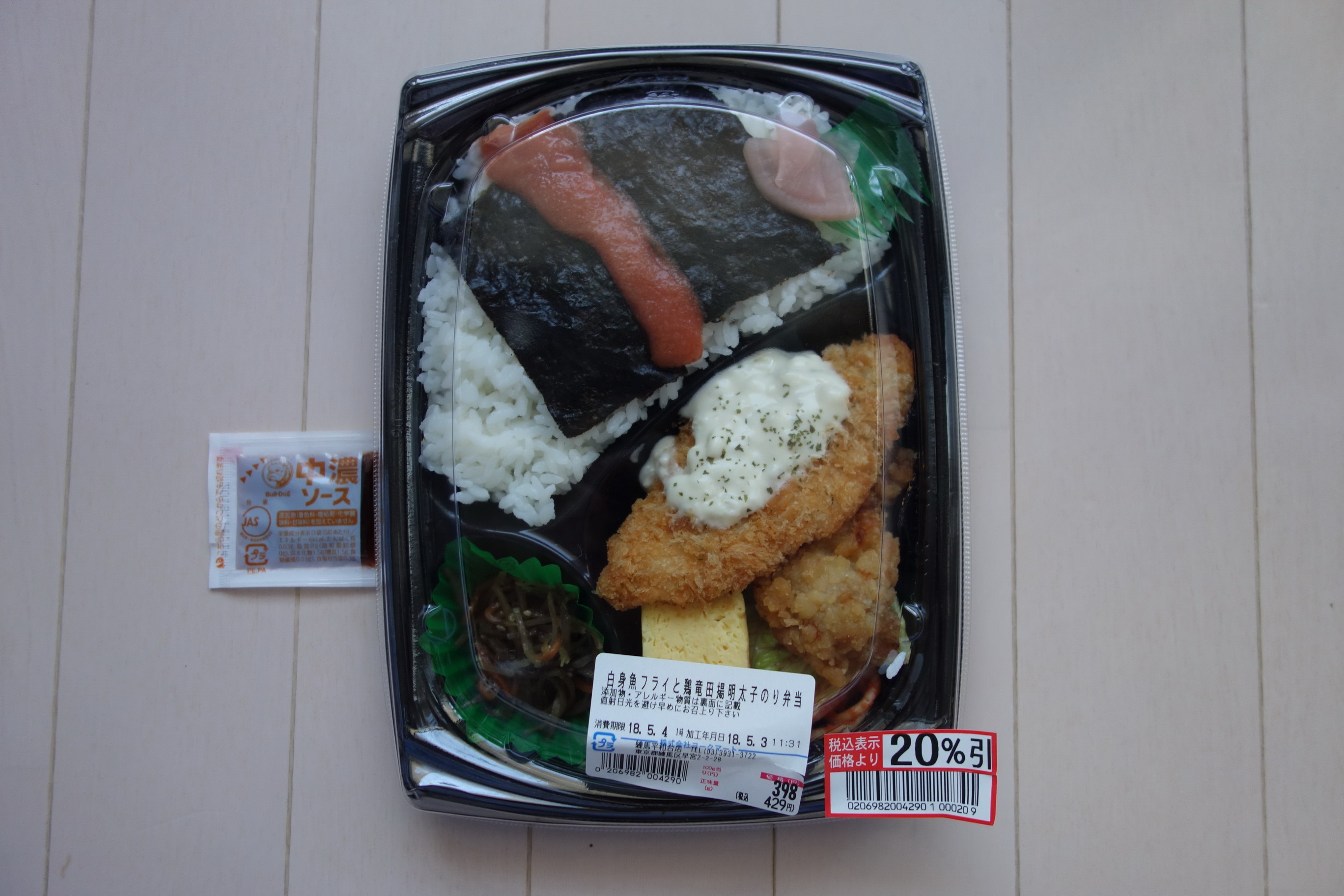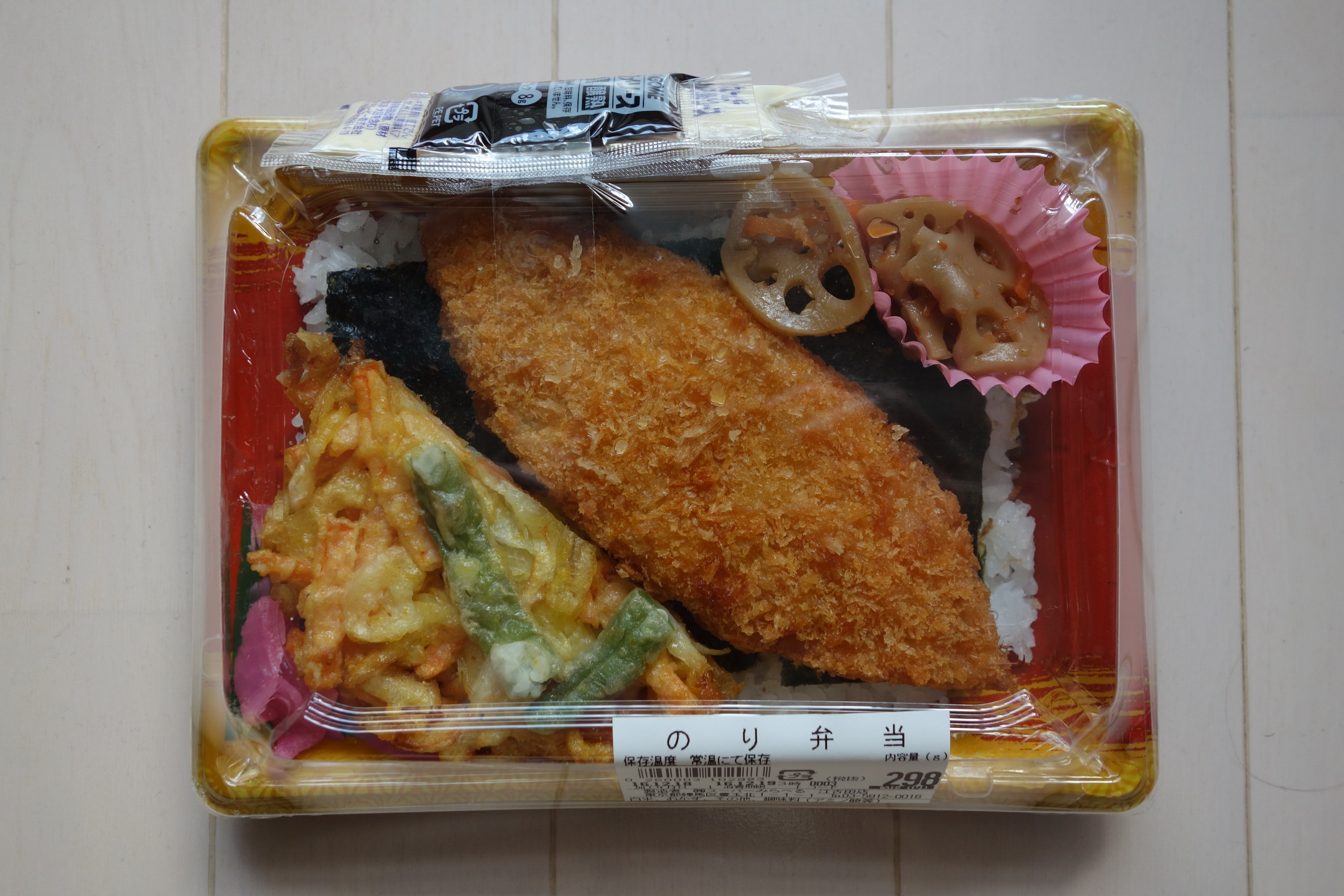 ずいぶん前にこのスーパーののり弁は食べたことがあるが、ひさびさに店頭で商品を見てみたら、以前と違っていたようだったので買ってみた。定価税込322円。熱量は不明。海苔ご飯の上にすべてのおかずが載る一体型で、添付調味料はカゴメ中濃ソースとキユーピータルタルソースの2種類。家に帰って調べてみると(当ブログで確認してみると)、やっぱり前のとだいぶ違う。白身魚フライがあるのは同じだが、鶏の唐揚げとちくわ天がなくなり、その替わりにかき揚げが新規参入。そして前と同様なきんぴらと大根の桜漬けという内容。白身魚フライの味は、前回同様で極めて普通。かき揚げは、インゲンなども入っていて彩り豊かなものだが、まったく味がないのでここはソースではなく醤油がほしかったところ。というか、そもそも白身魚フライ用にタルタルソースがあるのだから、このソースは不要ではないだろうか。仕方なく白身魚フライの半分に使用してみたが、それでも余ってしまって釈然としない。海苔の下のおかかが(前と同じく)かなり多めだったのを前向きにとらえたいとは思うが、それ意外はわりと普通レベル以下な印象ののり弁で、醤油さえ付いていれば……とそれがやっぱり悔やまれる(前はご自由にお取りくださいというかたちでレジに置いてあったのだが)。前回は唐揚げが好印象で高評価だったが、今回の評価は4点(10点満点中)。引っ越しして、みらべるはたまにしか行けないスーパーになってしまったが、また定点観測をしてみたい。