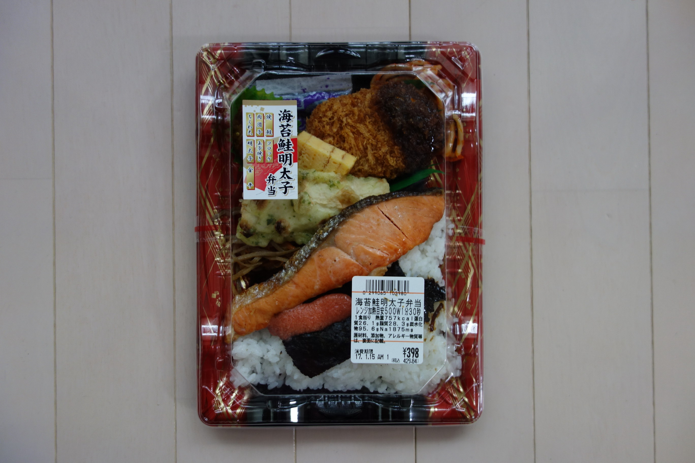 2017年冒頭を飾るのり弁は、以前、当ブログでもとりあげたこともあるスーパー、ライフの新作。先日のサミットほど先鋭的ではないがこれも「縦型」ののり弁だ、とまずそのかたちに目がいった。定価税込429円、熱量757キロカロリー。千葉県船橋市にある株式会社ライフコーポレーション製。添付調味料は醤油のみで、おかずの一部(焼鮭)がご飯の一部に浸食している半セパレートタイプ。そのほかのおかずは、ちくわ天、肉団子、コロッケ、卵焼き、きんぴら、昆布のつくだ煮、つけ合わせの具なしスパゲティ、そして、弁当名にも冠された明太子と、品数が多いのが特徴的だ。焼鮭は、パサついているように見えたが食べてみるとやっぱりパサついていて、塩加減はちょうどいいいものの、メインおかずとしてはイマイチ。ちくわ天は、逆にウエットすぎてゴムみたいで醤油をかけても染みこんでいかないタイプのもの。肉団子は、味薄めでパンチのないおとなしい味。ソースが面積の半分くらいにだけかけられたコロッケは、普通としかいいようがなく、卵焼きは、完全な工場製品、人工的な味。総じるに、おかずたっぷりを謳っていた前回のライフののり弁同様、品数が多く豪華に見えたが、ひとつひとつのおかずのクオリティは高くなく、質より量でごまかしたのり弁という感じであった。評価は4点(10点満点中)。海苔の下におかかがなかったのも個人的には残念。