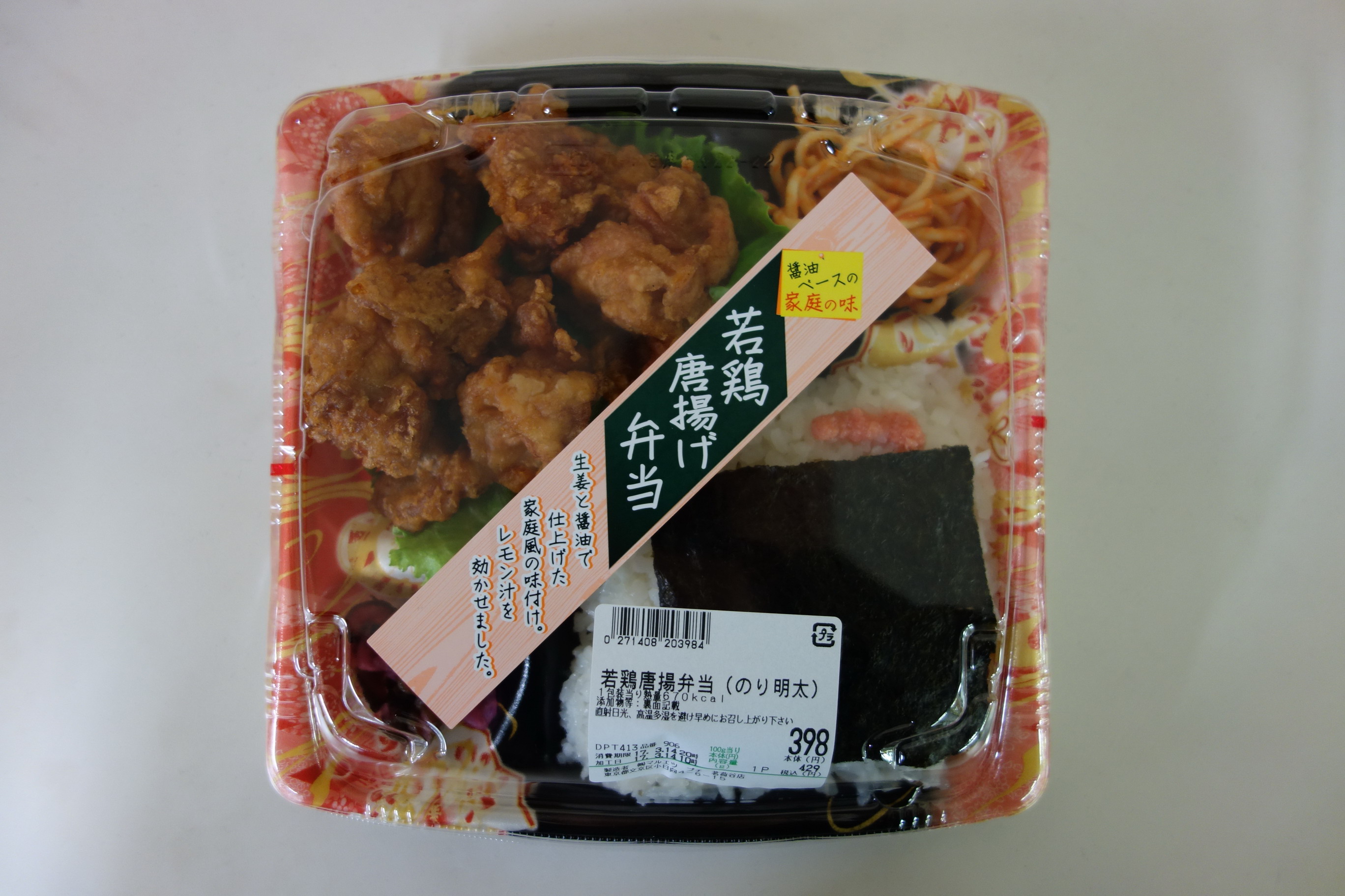 先日「海苔弁当」を買ったマルエツでもう一種類売っていたのり弁。ラベルには「生姜と醤油で仕上げた家庭風の味付け。レモン汁を効かせました。」とある。定価税込429円。熱量670キロカロリー。製造者は株式会社マルエツフーズ茗荷谷。おかずとご飯が分かれたセパレートタイプで、5個入っている唐揚げがおかずのほぼすべてといってよく、ほかはつけ合わせの具なしスパゲッティ、つけ合わせのレタスとキャベツ、柴漬けという内容。ご飯部門は、10センチ四方くらいの海苔とほんのちょっぴりの明太子。海苔の下はなにもなし。添付調味料もなし。実食してみると、唐揚げは確かに生姜と醤油は強く感じるが、若鶏感とレモンの味がまったく伝わってこない。畢竟、メインおかずにしては普通極まりない唐揚げなので、5個もあると正直後半に飽きる。弁当名に冠されているわりに辛子明太子の量が少なすぎるも残念だし、海苔の下におかかも昆布もないのもがっかりさせられた。評価は2点(10点満点中)。せめてもう1品、ほかのおかずが入っていたら印象がだいぶ違っていたかもしれない。