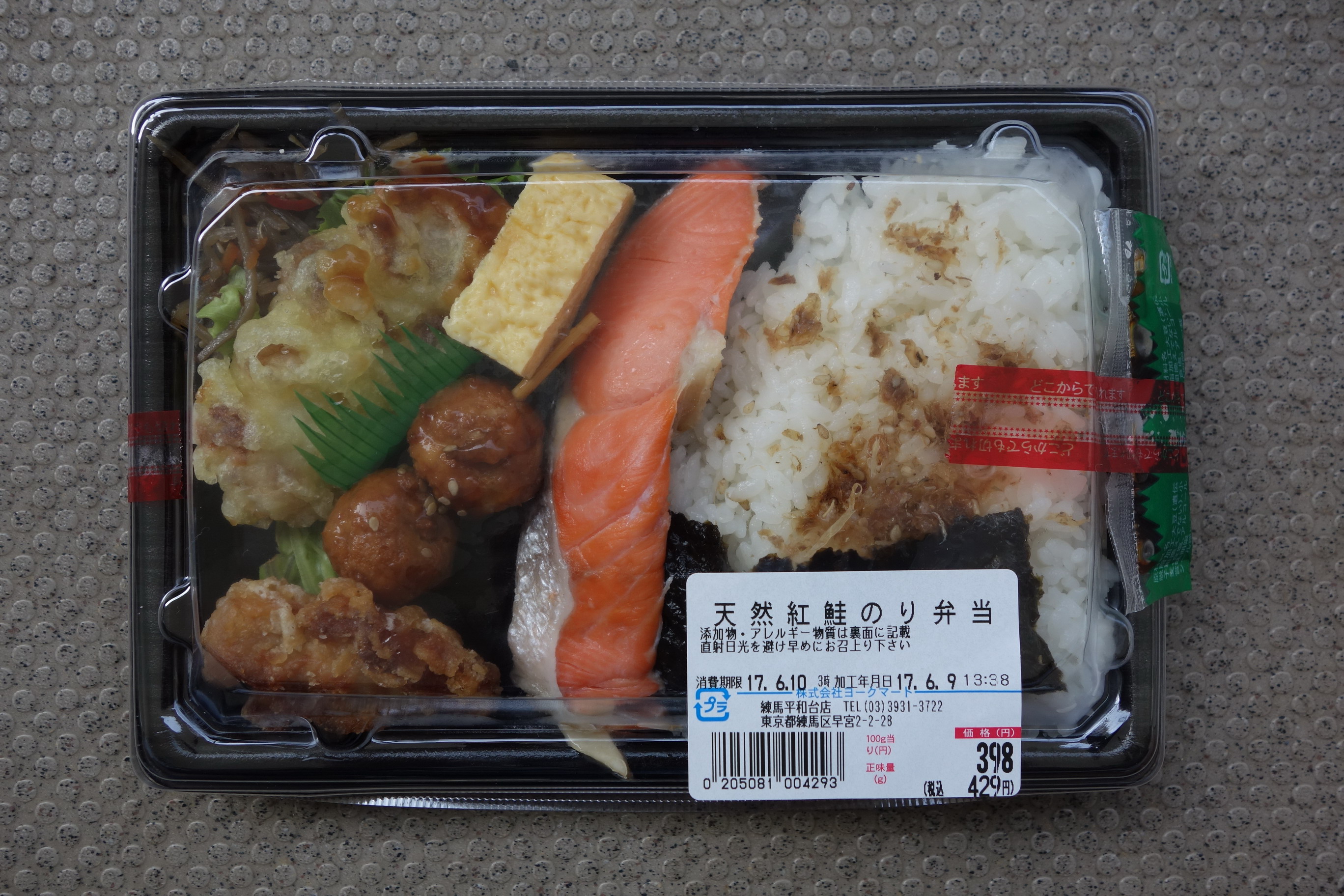前に「明太子鶏竜田揚のり弁当」というのを食べたことがあるスーパーの新作?のり弁。定価税込429円。熱量は不明で、製造者は株式会社ヨークマート練馬平和台店。添付調味料は醤油のみ。おかずの一部がご飯の上に載る半セパレートタイプで、様式としては、スーパー系に多い、白身魚フライの代わりに焼き鮭がメインのおかずとなっているもの。そのほかのラインナップは、ちくわ天、唐揚げ、肉団子と思ったら、食べてみてわかった鶏つくね、卵焼き、きんぴら、つけ合わせのレタス。ご飯部分は、上部におかかが振りかけられており、その下に海苔。この海苔がのり弁を謳っているわりにはかなり小さく、蓋をとる前は商品ラベルに隠れてほとんど見えないほど。前の「明太子鶏竜田揚のり弁当」も海苔は小さかったが2枚あったから、この部分でコストダウンをはかったのだろうか……と思いながらの実食。焼き鮭はわざとらしいくらいの派手なピンク色でやや不安を感じたが、味はまあ普通に美味しいもの。さすがにこのあいだの刷毛じょうゆ 海苔弁 山登りの鮭には負けるが、「天然」に嘘はないと思われる。ちくわ天は、衣が厚く醤油がよく染みこむタイプ。これも普通の味。唐揚げはやや乾燥気味。肉汁も少なくてあまり食感はよろしくない。串に刺さった鶏つくねは、まあこんなものかなという感想のみ。卵焼きは工場製品的なもので、お菓子のように甘い。きんぴらも甘くて少し閉口。……というわけで全体的には可もなく大きな不可もなくという感じで評価は4点(10点満点中)。税抜300円台でこの内容なら、ギリギリ許せるというレベルののり弁。