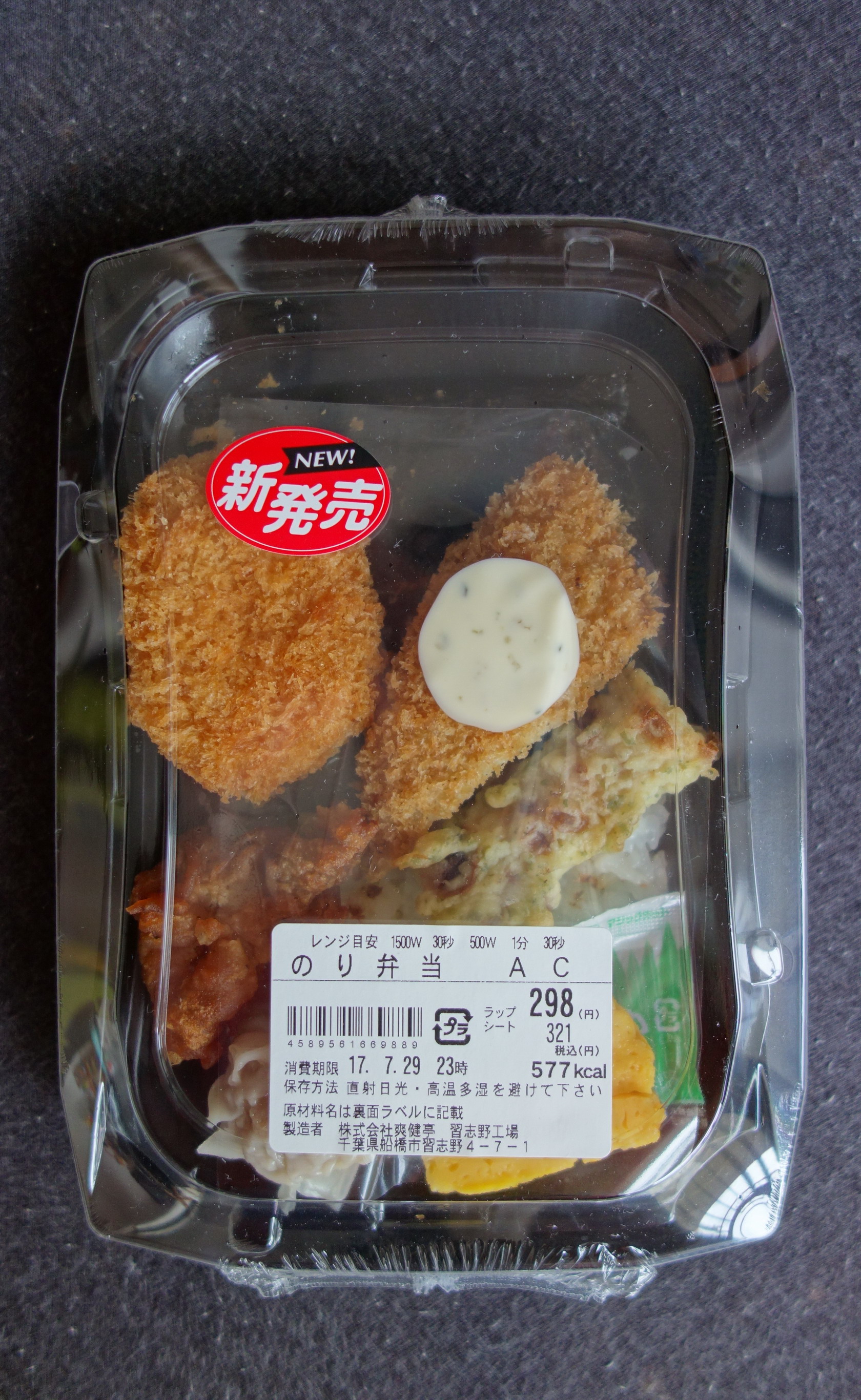 激安スーパーのアコレが、かなりひさしぶりにのり弁をリニューアルして新発売。前に食べたのり弁は相当にひどいものだったが、果たして今度のはどうか。定価税込321円、熱量577キロカロリー。製造者は株式会社爽健亭習志野工場。添付調味料は醤油のみ。ご飯の上にすべてのおかずが載る一体型で、おかずの内容は、タルタルソースのかかった白身魚フライ、ちくわ天、コロッケ、鶏の唐揚げ、焼売、卵焼きと、安価なわりには種類多め。海苔の下はおかかのみ。かなりハードルを下げた気分で、まったく期待せずに実食。白身魚フライは、乾燥した薄い身が厚い衣に挟まれているという代物で、どう考えてもこれが生きていた魚のフライとは思えない。ものすごく人工的な味。ちくわ天は、あまりにも小さく、そのせいか醤油をかけたら醤油の味しかしなかった。唐揚げも白身魚同様、衣のほうが強く主張しているものでまずい。コロッケ、焼売、卵焼きは、冷凍食品の味そのもの。特にコメントなし。……というわけで、食べ終わった感想は想像通り、値段相応のクオリティしかないのり弁という感じだが、ここまでチープさ全開だと逆にすがすがしい。この極度の安っぽさが「のり弁らしさ」を醸し出しているといえないこともないかもしれない。評価は3点(10点満点中)。「AC」はアコレの略語だろうか。