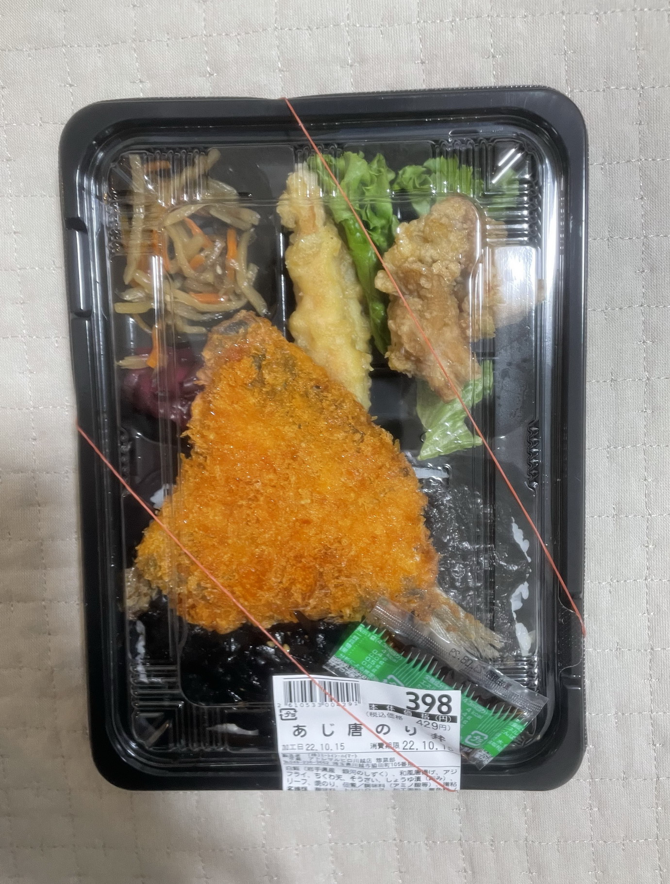 東武東上線川越駅に隣接する同百貨店地下食料品売り場で売られていたのり弁。定価税込429円、熱量183キロカロリー(!?)。おかずの一部(アジフライ)がご飯の上に載る一体型で、製造者はアトレマルヒロ川越店総菜部。添付調味料は(メインおかずがアジフライなのに)醤油一袋。おかずのラインナップは、弁当名にアナグラムのように記されたアジフライと唐揚げ、それから、のり弁だからということなのか、ちくわ天、きんぴら。さらにキュウリの柴漬け(弁当説明欄には「しょうゆ漬け」とあるがどう見ても(食べても)柴漬け)、つけ合わせのレタス一枚という布陣。ご飯のほうは、海苔とおかか、それから昆布のつくだ煮まで添えられているのは豪華といっていい仕様。この内容でたったの183キロカロリーというのはなにかの間違いではないだろうかと思いながら実食。まずアジフライは、大きさも壮観で厚みもあり食べごたえもあって及第点。ただし、自宅で食べたからソースをかけられたものの、添付の醤油だけだったらだいぶ印象は違っていたかもしれない。唐揚げは、竜田揚げ風のもので衣が分厚めなのが難だが、やさしい味で悪くない。ちくわ天は青海苔はかかっておらず、かなりあっさりしている。だが、こちらのほうには醤油をかけられたので問題はなかった。きんぴらは、ゴボウと人参のみだが、家庭的なこれもやさしい味。「岩手県産銀河のしずく」使用のご飯のほうは、おかかの量も多く、前述のとおり昆布のつくだ煮もあるため、すいすいと食べられる。全体の量、そして、おかずとご飯のバランスもちょうどよかったのではないだろうか……というわけでの総合評価は、8点(10点満点中)。川越という土地柄なのか、いかにも田舎の総菜屋がつくったようなのり弁で、身体によいものを摂ったという食後感が残る。ほかの種類ののり弁もいくつかあったので、いつかまたこの店で購入してみたい。