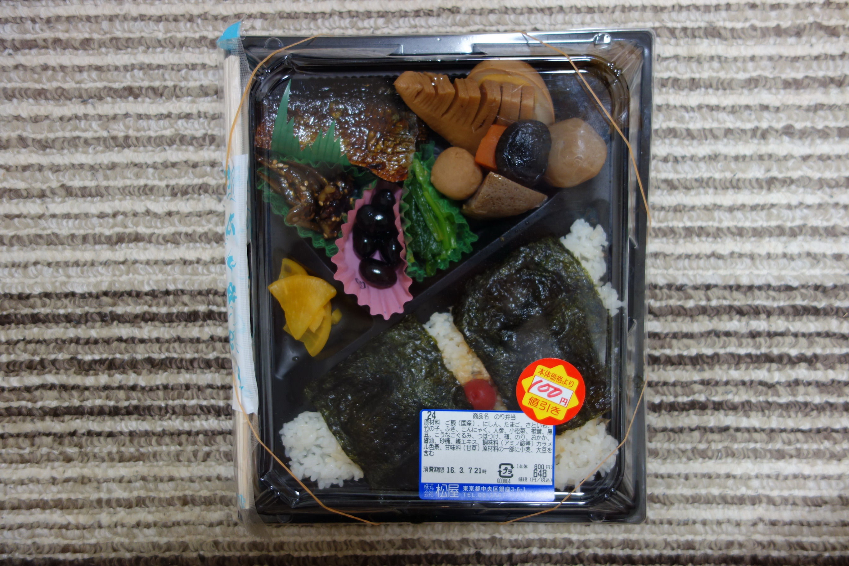 夕刻の購入だったため、定価税込648円のところ100円引きの548円。製造者、熱量は不明。ご飯とおかずが分かれた位置にあるセパレートタイプで、トランプ大の海苔が2枚載ったご飯(なぜか小梅つき)の上のスペースに、のり弁の要素ゼロのおかずが並んでいる。ニシン焼き、野菜の煮物(里芋、竹の子、人参、椎茸、コンニャク)、煮卵、コウナゴくるみ、フキと昆布の煮物、小松菜のおひたし、黒豆、大根のづぼ漬け……ってこんなの絶対にのり弁じゃない!と声を荒げたくなってしまうが、のり弁を名乗ってしまっているのだから仕方がない。釈然としない気持ちのまま実食。ニシン焼きは木のように硬く、調理後時間が経っていることを考慮してもかなりいただけないもの。野菜の煮物、フキと昆布の煮物は、上品というかやさしい味で、のり弁の持つジャンク感とは対極の方向性にある。まずくもないが美味くもない。小松菜のおひたしも同様に上品な薄味。おせちでもないのになぜ入っているのかわからない黒豆とコウナゴくるみは、海苔ご飯とも合わないし、そもそも弁当のおかずとしてどうなのか。海苔の下にちゃんとおかかを敷きつめていた点だけは評価したいが、揚げ物がいっさいないというのはやはり(のり弁として)味気がなさすぎる。いつも思うのだが、デパ地下でこのようなちぐはぐな内容のり弁をわざわざ買う人の気持ちがよくわからない。ほかにもっと美味しいお弁当がいっぱい売っているというのになぜなのだろうか。評価は1点(10点満点中)。