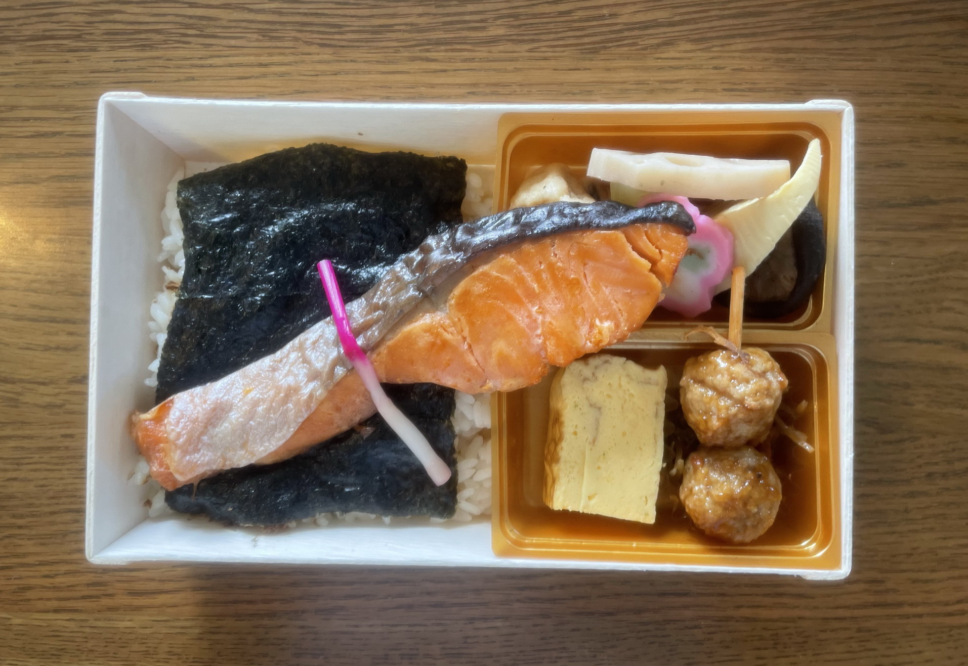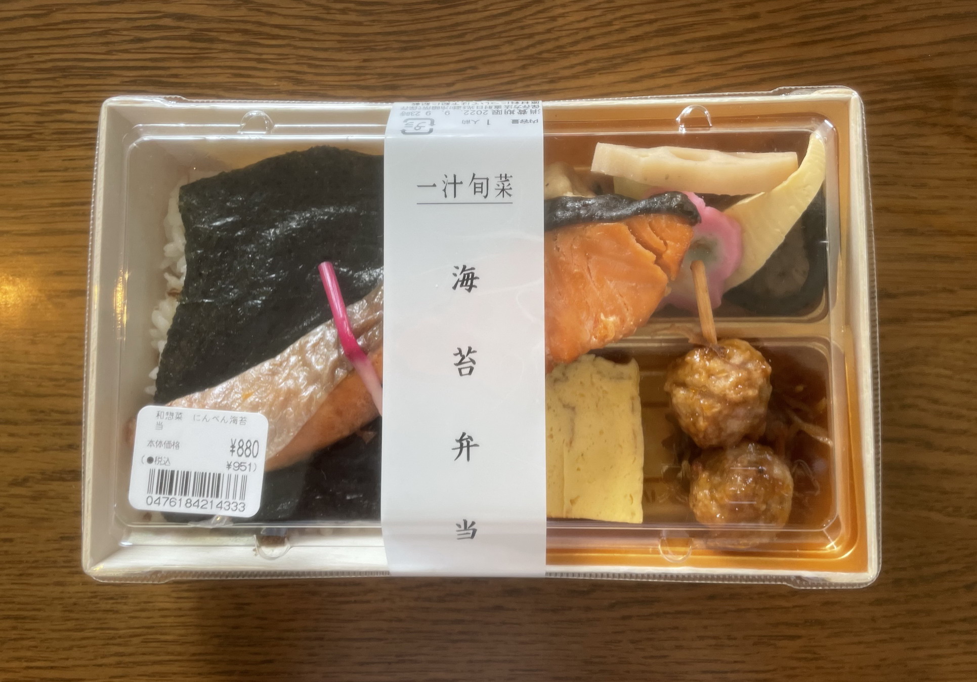 デパ地下食料品フロアで「お弁当ステーション」と呼ばれるいろいろなメーカーの弁当を売るショップで購入。定価税込951円、熱量497キロカロリー。おかずの一部(焼き鮭)がご飯の上に載る半セパレートタイプで、添付調味料はなし。製造者は株式会社にんべん。おかずのラインナップは、焼き鮭、きんぴら、卵焼き、つくね串、煮物類(がんも、椎茸、竹の子、フキ)、かまぼこ。ご飯のほうは、大判の海苔、の下におかかという内容。カロリーも低く、魚、野菜中心の、いかにもヘルシーなのり弁を実食。ご丁寧に、はじかみまで飾られている焼き鮭は、脂こそ乗っていないが、香ばしくて美味い。品質のよさが伝わってくる品。きんぴらは、ゴボウも人参もかなり細かく刻まれたもので少量。ややものたりない。卵焼きは、手焼き風の食感。味は和菓子みたいで上品。煮物類もひたすら上品な味で薄味。ちなみにフキが入ったのり弁というのを初めて食べた。つくね串のみが濃い味で、逆にのり弁としてほっとさせるものがある。絵柄のついたかまぼこはまあなくてもよかったかもしれない。ご飯のほうは、おかかの量も適量で可もなく不可もなく。全体のボリュームもそこそこであっという間に食べ終わってしまった。というわけでの評価は5点(10点満点中)。繰り返すが、とにかく上品なのり弁という感じでどちらかというと女性向け。しかも胃もたれしない食材ばかりなので身体によさそうなところを高評価する人もいるかもしれない。ただし、この内容で税込1000円近くするのはデパ地下とはいえどうなんだろうか、という疑問も残った。
