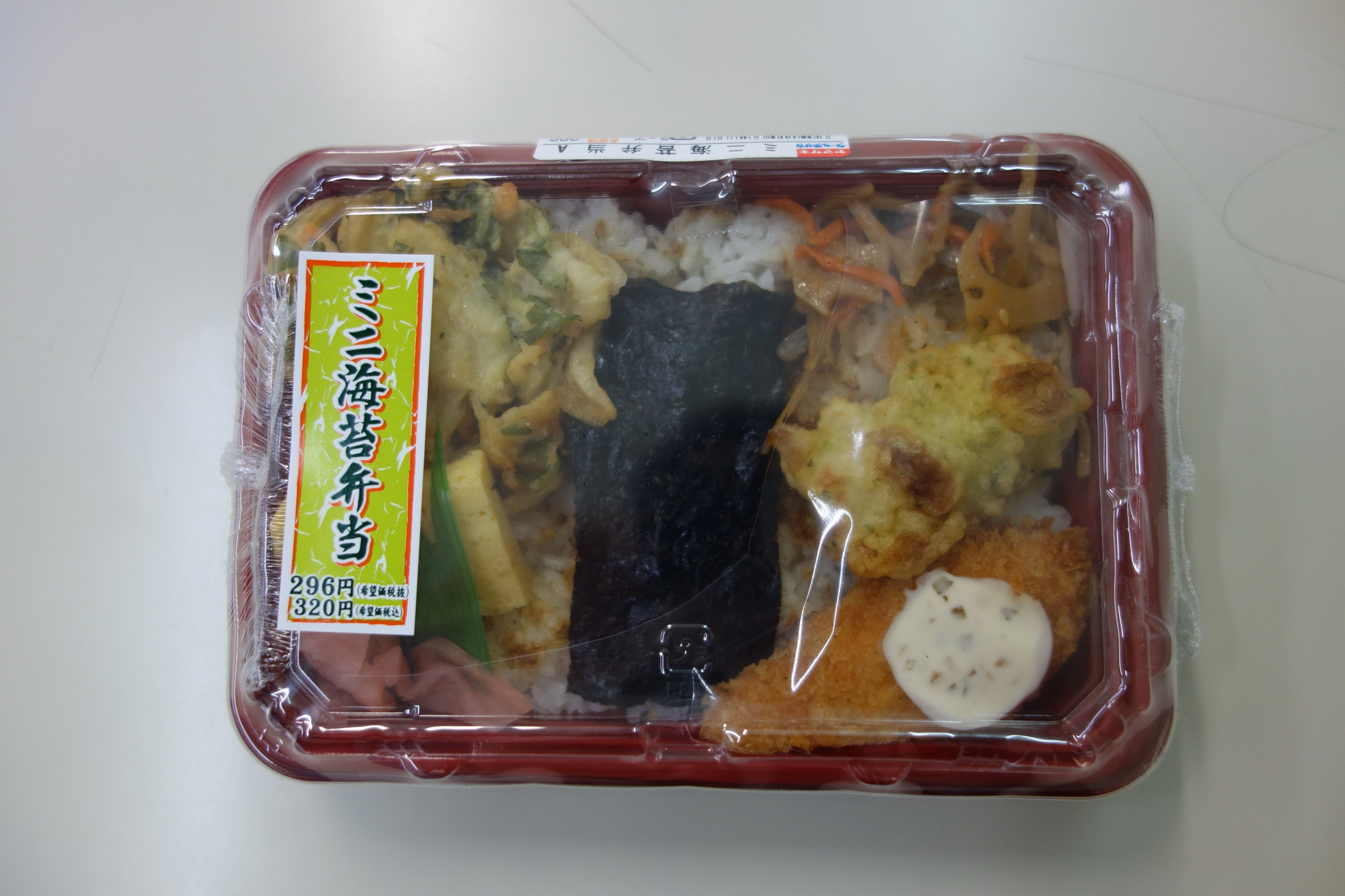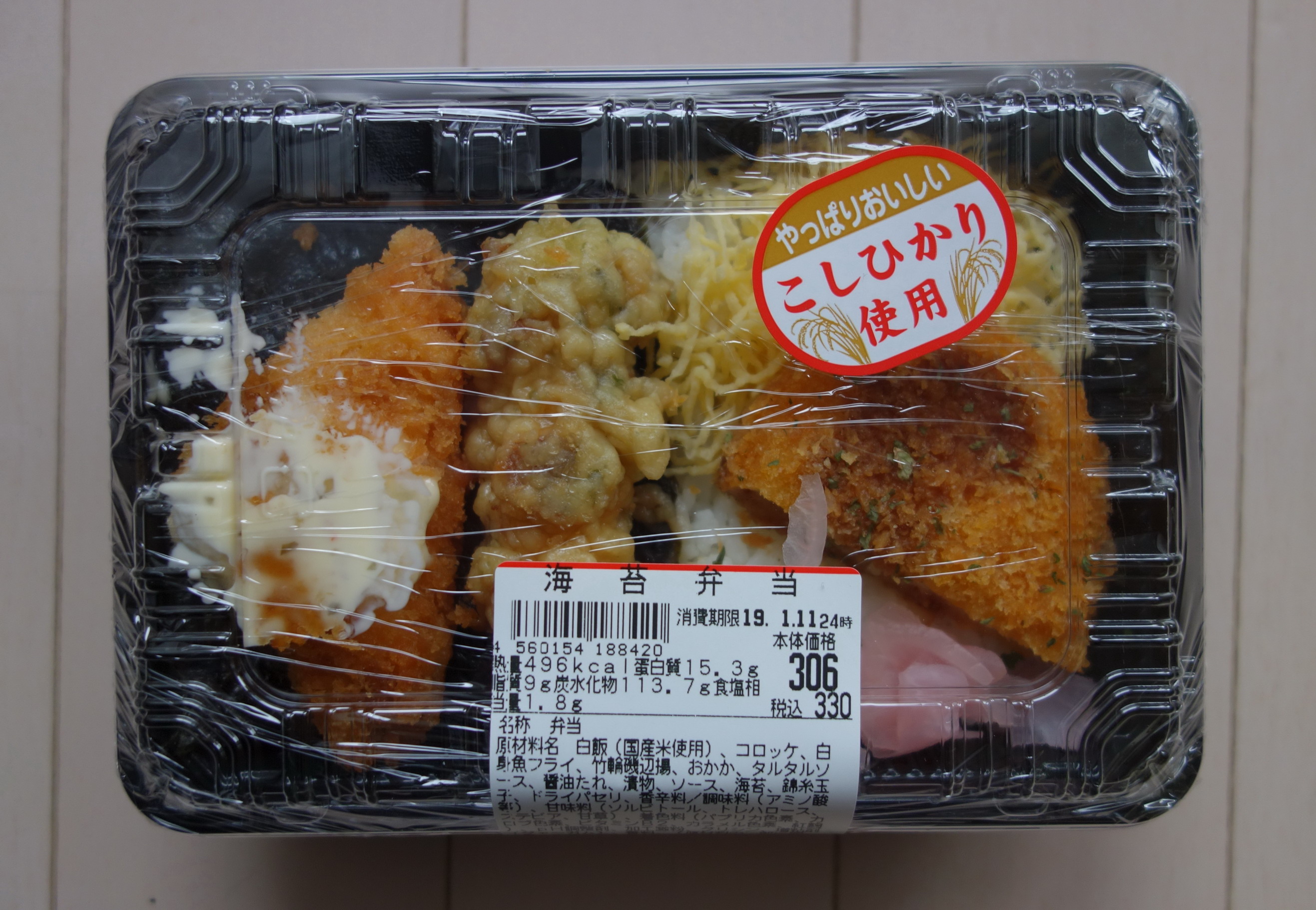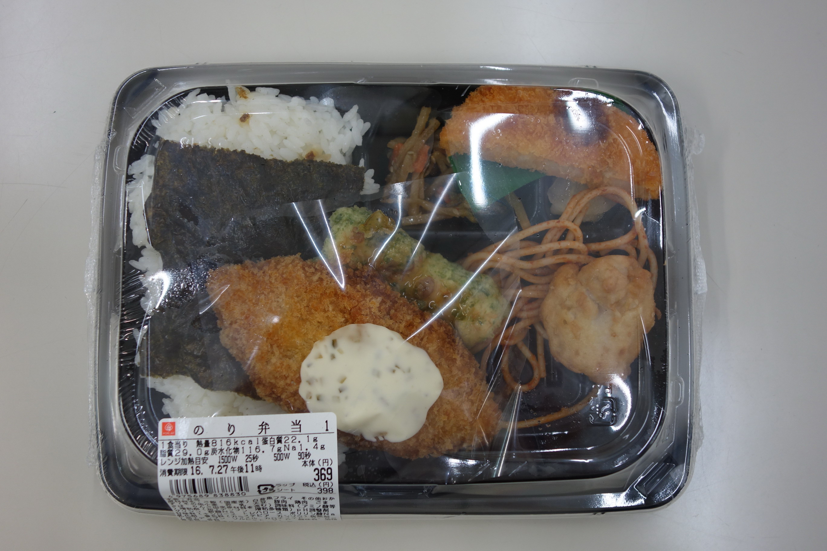 パパスなどのドラッグストアで弁当が売っていることがあるが、この薬局チェーンにも弁当やサンドイッチ類がある。定価税込398円。のはずが、なぜか40円引きにされて358円。熱量は816キロカロリー。製造者は埼玉県さいたま市の株式会社ナガイ大宮第1センター。直径10センチほどの正方形の海苔の上にタルタルソース付き白身魚フライが載り、ほかは、ちくわ天、細長いコロッケ半分(ソースが少しだけ付着)、唐揚げ1個、きんぴら、つけ合わせの具なしスパゲティ、申し訳程度の量の漬け物、という内容。値段のわりに品数が多い印象がある。実食してみると、タルタルソースとソースが少量なので、フライがとても食べづらい。なにか添付調味料がほしかった。しかも白身魚フライはパサパサしていて硬く、メインを張るおかずとしてはあまりよろしくない。唐揚げは正真正銘の冷凍食品だが、味濃いめでまあまあ美味い。ちくわ天は甘ダレがかけられている点は評価するが、小さすぎる。海苔の下のおかかの量も少なすぎて寂しいし、全体によいところは少ない感があって評価は3点(10点満点中)。おかずの数は多かったもののご飯は少なめなので、おやつ感覚ののり弁という感じ。ボリュームを求めるならカップ麺などとセットで食するべきだろう。