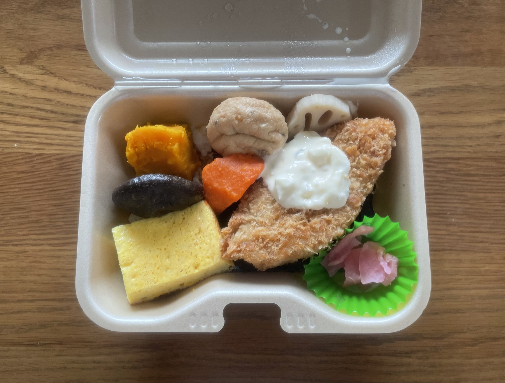 定価税込320円のはずが、今回もなぜか会計時に10%オフになって288円。普通の弁当よりひとまわり小さい「ミニ」とはいえ、熱量は多めの547キロカロリー。株式会社サンデリカ平塚事業所製。すべてのおかずがご飯の上に載る一体型で、おかずのラインナップは、白身魚フライ、ちくわ天、きんぴら、卵焼き、かき揚げ、大根の桜漬け。海苔も「ミニ」で、切符をひとまわり大きくしたぐらいの面積。添付調味料はなし(白身魚フライの上にタルタルソースが微量かかっているだけ)。ミニだから仕方ないが、白身魚フライは落胆するほど小さく、しかも衣が厚くて中身はもっと少ない。タルタルソースの量もものたりず。きんぴらも少量だが、ニンジン、ゴボウのほかにレンコン、コンニャクまで入っていてこちらのほうはやや良心的。ちくわ天は青海苔の風味も乏しく無味だったので、醤油かソースがほしかったところ。卵焼きは、甘くていかにも業務用な工場製品製で、これもがっかりだったが、唯一存在感を示してくれたのがかき揚げ。大きさもほかのおかずと比べるとビッグで食べごたえがあり、出汁の味がよく染みていて結構美味だった。最終的にミニを謳っていたわりにはボリューム感を感じる弁当だったという感想で、評価は4点(10点満点中)。「ミニ」だからといってケチらずにご飯とおかずのあいだにちゃんとおかかを入れていた点も評価したい。