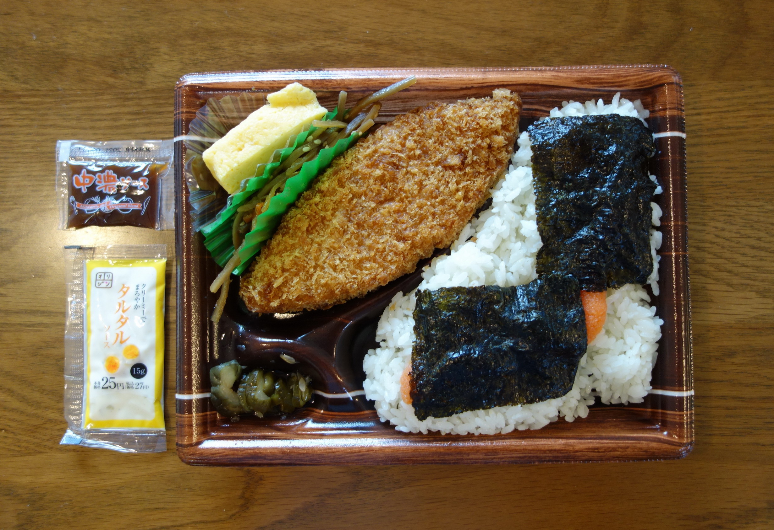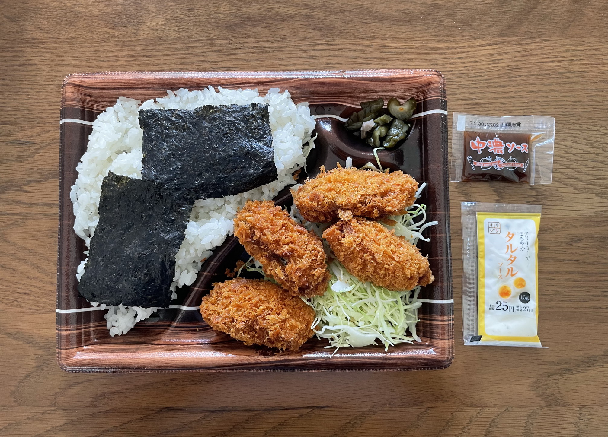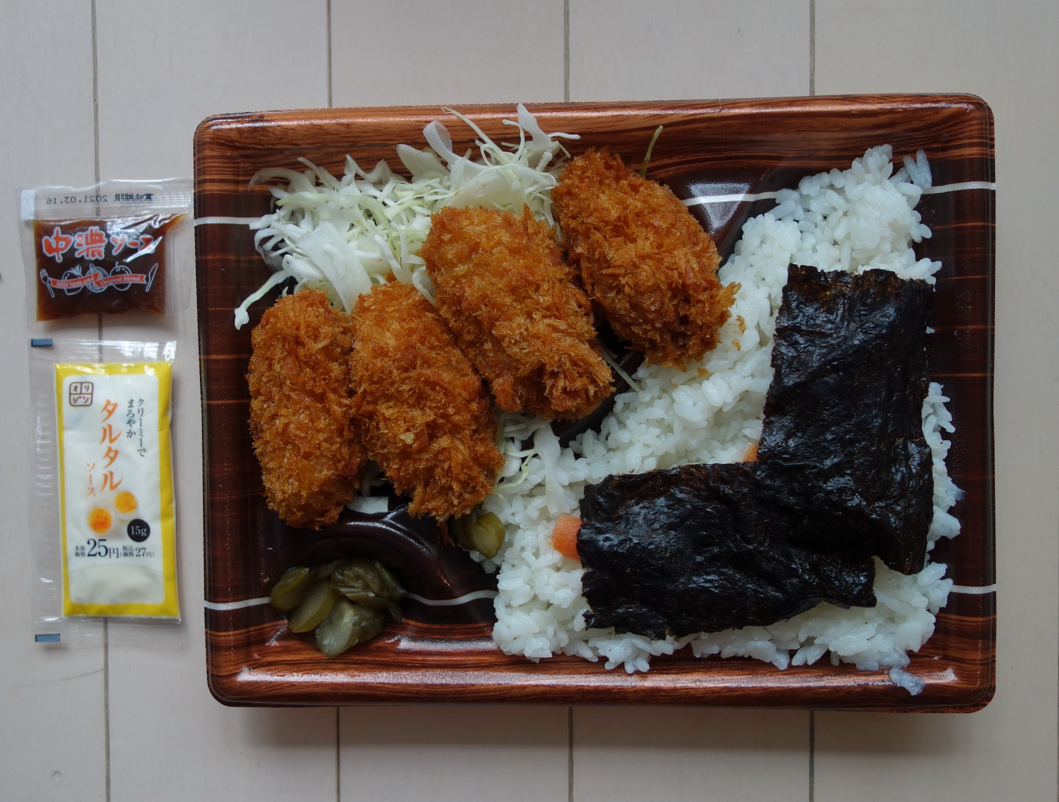 おそらく季節限定メニューののり弁。「のりおかか」と「のり明太」の2種があり、前者は税込510円、後者は税込530円。たった20円の違いなら、と「のり明太」のほうをチョイスした。おかずとご飯が分かれた位置にあるセパレートタイプで、添付調味料は、「クリーミーでまろやか」というコピーが謳われたタルタルソースと中濃ソースの2袋。店頭でオーダーしてつくってもらったものなので、熱量と製造者は不明。おかずの内容は、カキフライが4個、キュウリの柴漬け、つけ合わせのキャベツ……と前回食べた「ジャンボチキンカツ白身フライのり弁当」と違い、白身魚フライときんぴらといったのり弁を感じさせるものを完全に排除したのり弁となっている。ご飯のほうは名刺大の海苔2枚と明太子、こちらのほうも「のりおかか」ではないため、当然おかかが存在しておらず、のり弁のイメージからは遠いルックスだ。カキフライ入り(というかほぼそれがメイン)という初めてののり弁にやや緊張しながらの実食。そのカキフライ、かなり大ぶりなものだが、衣が厚いとかそういうことはなく、しっかりとした大きさのカキが揚げられたもので、かなり満足できるもの。ソースもよいが、やはりタルタルソースで食すと相当に美味い。キュウリの柴漬けとキャベツには特にコメントすることがなく、そのため、おかずのレビューはそれだけ。ご飯のほうは明太子の量がほどほどあり、安心して食べられたが、「のりおかか」にしたほうがのり弁を食べたという気になれたかもしれない。というわけでの総合評価は7点(10点満点中)。美味しいカキフライ弁当を食べたという感想しかなく、果たしてこれを「のり弁当」にする必要があったのだろうかという疑問が残った。