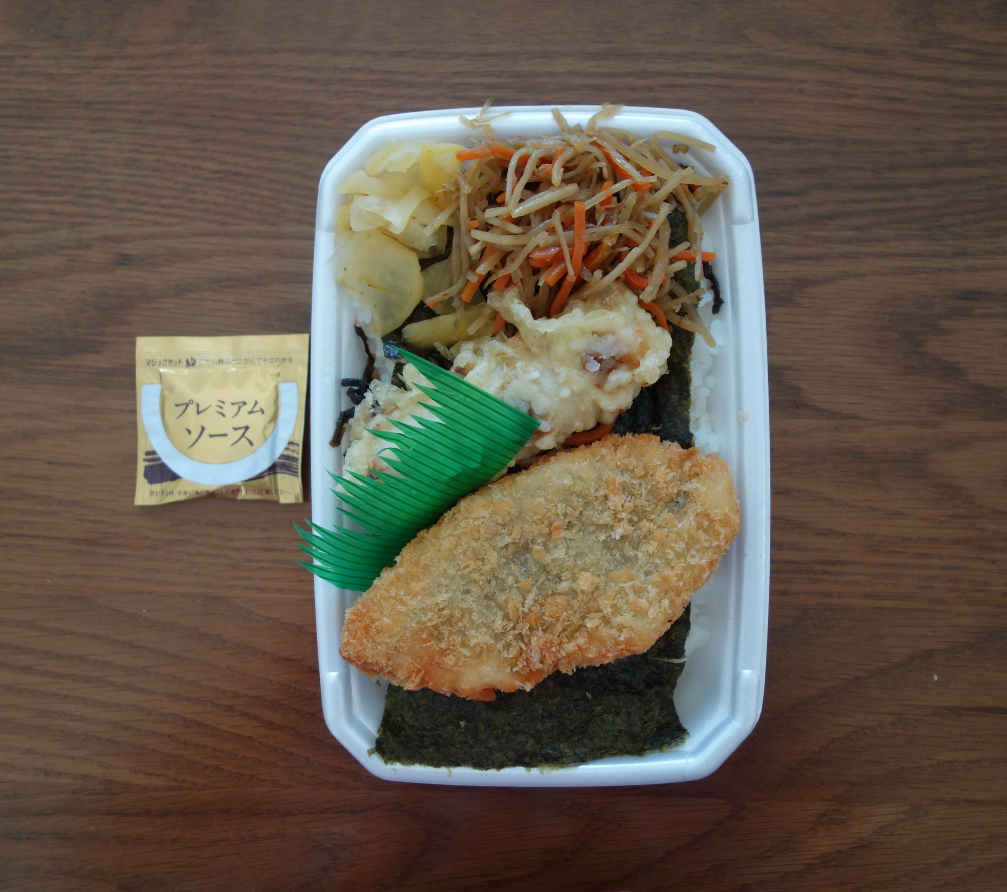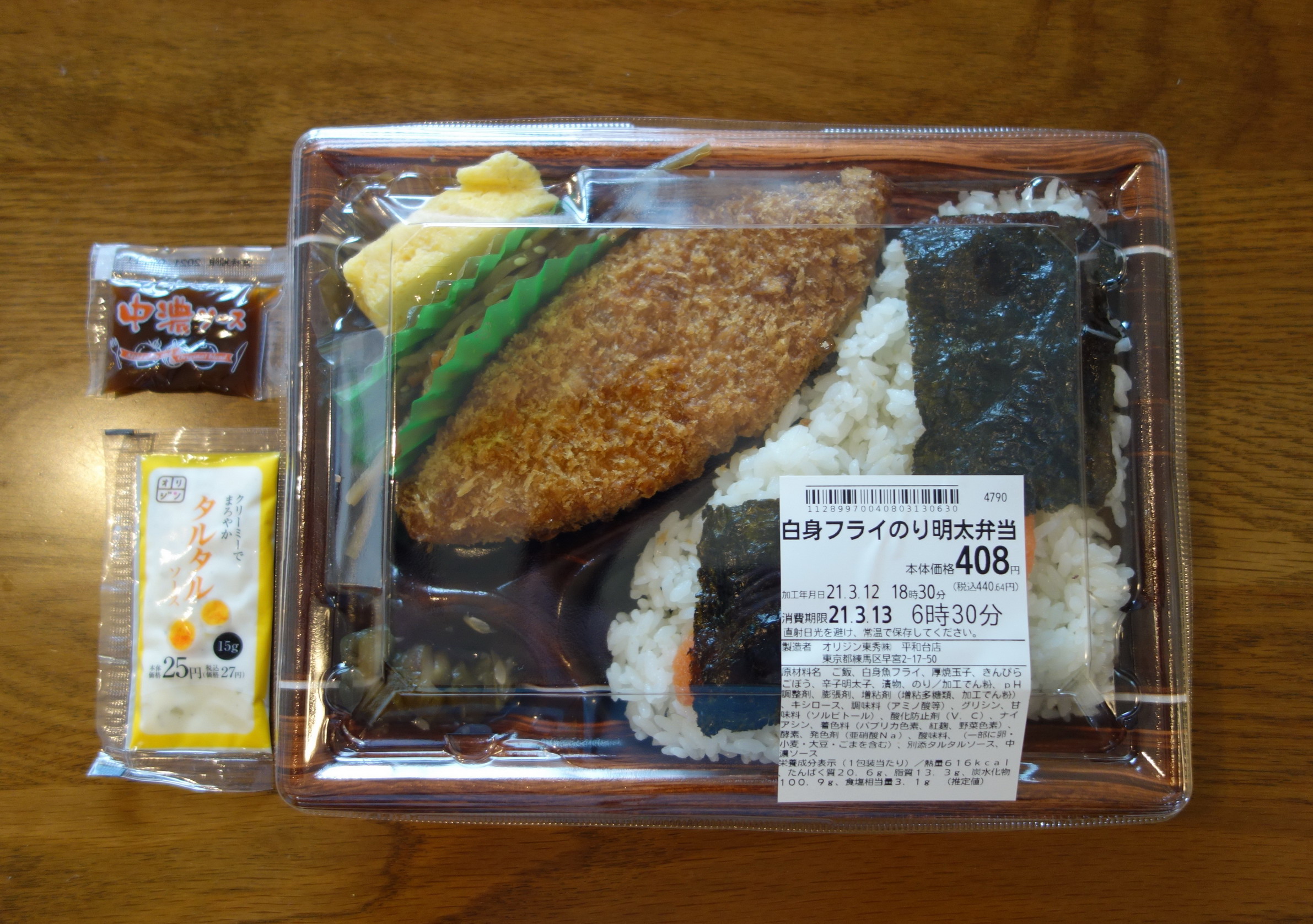 定価税込464円。熱量は記載なしで不明。製造者はオリジン東秀株式会社平和台店。添付調味料は、オリジンオリジナルタルタルソースとオリジナルではない中濃ソースの2袋。アジフライの端っこがご飯の上に載る半セパレートタイプののり弁である。おかずの構成は、真アジフライ1枚、卵焼き、沢庵、つけ合わせの千切りキャベツ。ご飯の上にはトランプ大の海苔が2枚、その下におかか……という建て付けとなっている。原価のほぼすべてを担っていると思われる巨大なアジフライに注目しながらの実食。タルタルと中濃、ふたつのソースがついているので、それら半分ずつをかけて食べたアジフライは、肉厚で食べごたえあり。ただ、買った直後なのに熱々ではなかった(揚げ置き?)のと、特に「真」を感じず、普通のアジフライとの差がなかったのが残念。卵焼きはいつものオリジンのそれそのもの。甘い味。沢庵は細切れに切ったものが少量で、アリバイで入っている感じでちょっとさびしい。ご飯のほうは、結構こんもりとボリュームがあり、おかかの量も多いので好感が持てる。しかし、おかずがほぼアジフライのみであり、そのご飯がやや持て余し気味になってしまうのは問題だ。総合評価は5点(10点満点中)。やはりおかずの種類が少ないというのは、のり弁ならではのワクワク感は欠ける。ただしアジフライ好きにはお薦め。