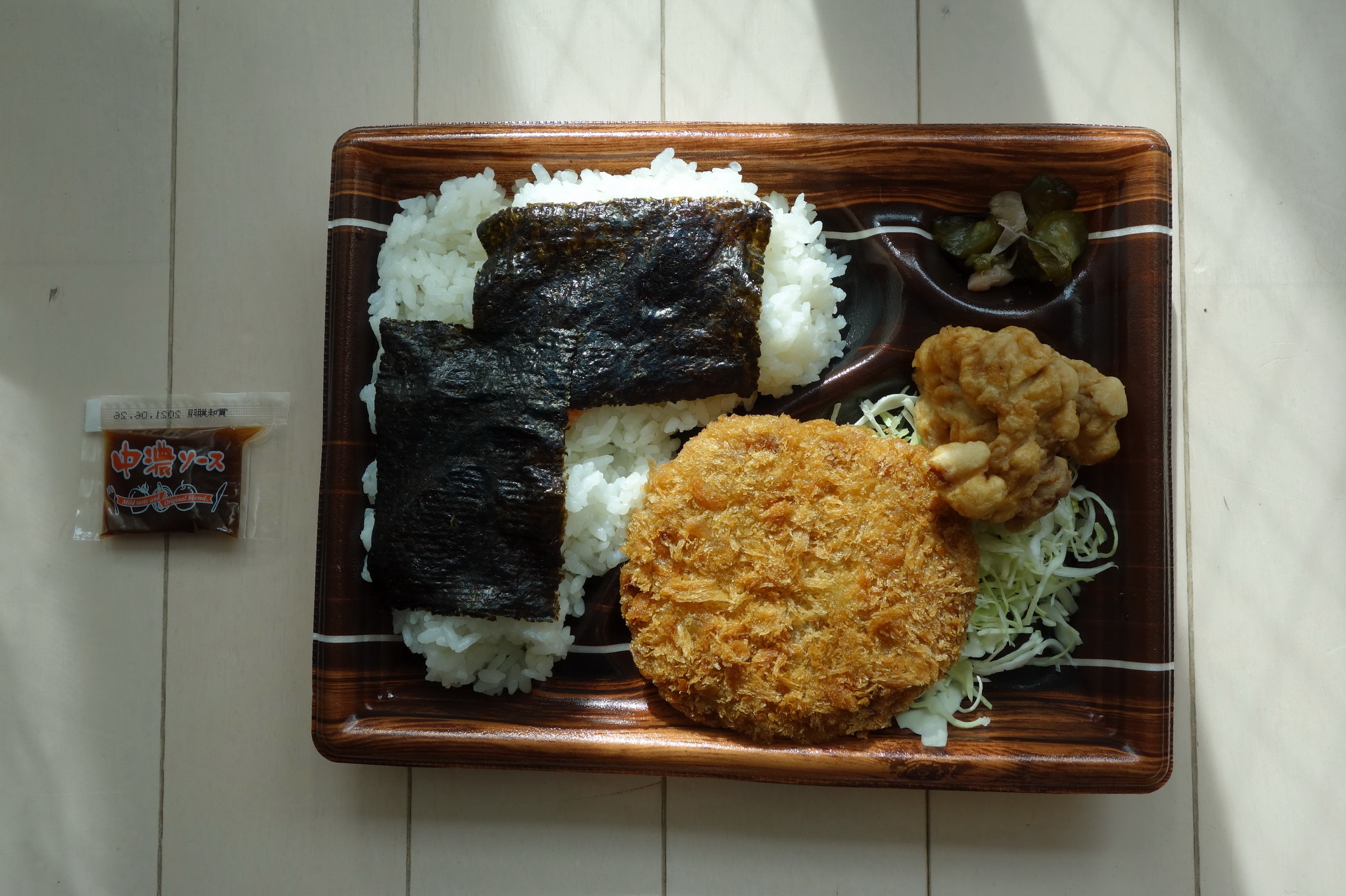 定価税込487円、製造者は不明。熱量は商品には記載なしだったが、同社のホームページによると805キロカロリー。「のりおかか」か「のり明太」が選べるということで後者をチョイス。おかずとご飯が分かれた位置にあるセパレートタイプで、添付調味料は小さめの「中濃ソース」が一袋。おかずは、キャベツ入りのメンチかつ、唐揚げ1個、つけ合わせの千切りキャベツ、キュウリの漬け物とやや寂しい内容か。ご飯サイドのほうは、トランプ大の海苔が2枚、その下に辛子明太子という布陣。まずメインのキャベツメンチかつから食してみると、キャベツの量がたっぷりなため具が柔らかく、肉汁も豊富で美味い。ただ、直径12~13ミリはあろうかというジャンボサイズなので、ソースの量がやや足りない。唐揚げは、同店の看板商品だけあってニンニク風味が効いた、身も衣も合格点な品で素晴らしい。だからたったの1個しか入っていないのが非常に残念だが、もしかしたらこれは次回の唐揚げ(弁当or単品)購入に誘導させるためかもしれない。つけ合わせのキャベツは前述のとおり、ソースをメンチかつに使いきってしまったので、そのまま食べた。これはマイナス点。漬け物はごく普通だが、量が少なすぎて食べ手を寂しい気持ちにさせる。一方、ご飯のほうは、海苔の風味もよく、明太子も少なくない量で安心感があった。が、のり弁を謳うなら海苔の面積はもっと広くてもよかったのでは?という気もする。で、食後の総合評価は6点(10点満点中)。さすがはオリジン、メンチカツと唐揚げのクオリティは素晴らしいが、そのぶん、のり弁らしさが希薄となり、結果として、弁当としての立ち位置が中途半端になってしまったのが残念。もう少しおかずの種類を増やして、のり弁ならではの「とっちらかった感」が出してほしかった。