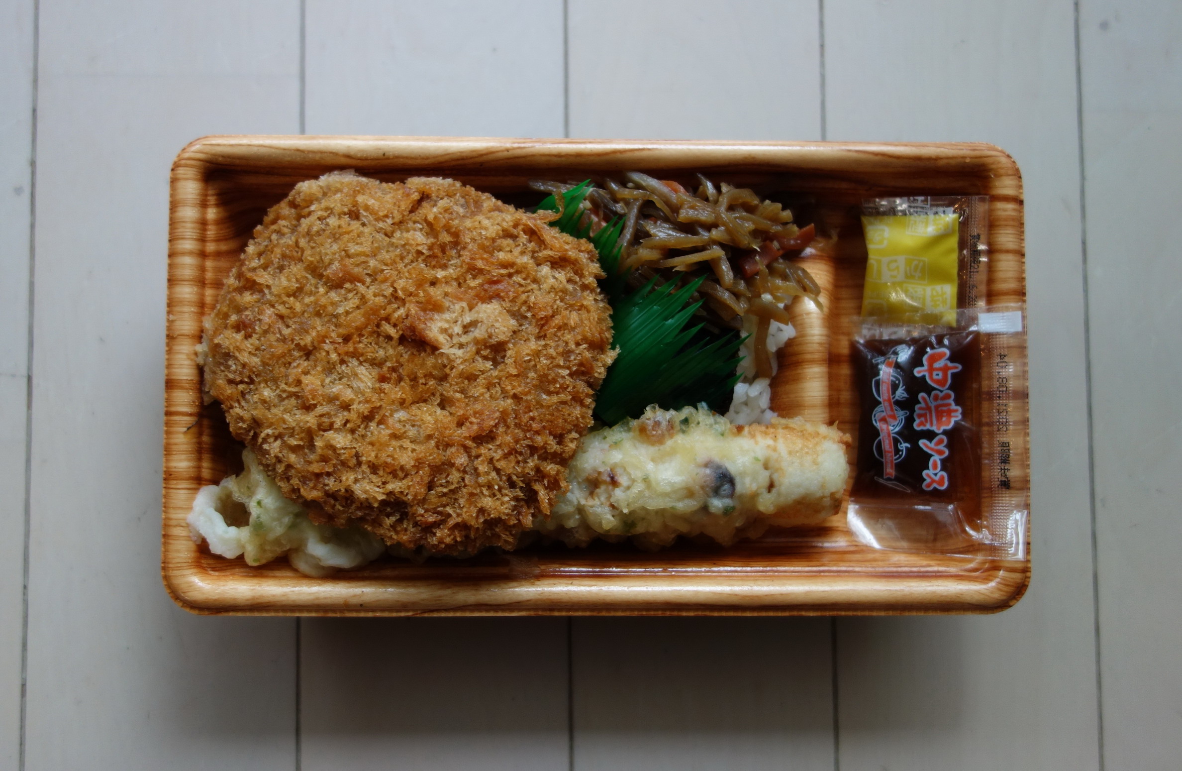 定価価税込378円、熱量753キロカロリー。製造者はオリジン東秀株式会社平和台店。すべてのおかずがご飯の上に載る一体型で、添付調味料は中濃ソースが一袋。先月食べた同店の「キャベツメンチかつのり弁当」のスピンオフともいえる商品で、形態としては基本ののり弁から白身魚フライを抜き、代わりにキャベツメンチかつを入れたスタイル。かつ以外のおかずは、ちくわ天、きんぴらのみで、漬け物もなし。ご飯には面積広めの海苔が敷かれ、その下におかかがたっぷり。前に食べたキャベツメンチかつが秀逸だったので、期待しながらの実食。で、そのキャベツメンチかつ、今回も肉汁に溢れていてキャベツのサクサク感もよいアクセント。美味い。だが、このジャンボサイズに対してソースの量がやはり足りなかったのが残念。ちくわ天、きんぴらはいつものオリジンクオリティで満足できるもの。さんざん当ブログで評しているので詳細は割愛。ご飯のほうもおかかが大量なので安心して食べられ、海苔もこんなに品質がよかっただろうかと思うほど分厚くパリパリで、「磯感」を感じるものだった。というわけでの評価は8点(10点満点中)。白身魚フライは装備されていないが、前述の「キャベツメンチかつのり弁当」(ただしこちらには唐揚げが入っていた)よりも100円安いので、メンチかつが好きならかなりお薦めののり弁といえる。キッチンオリジンののり弁は節操がないといえるほどバリエーションが豊富だが、こういうスピンオフ商品なら今後も大歓迎だ。