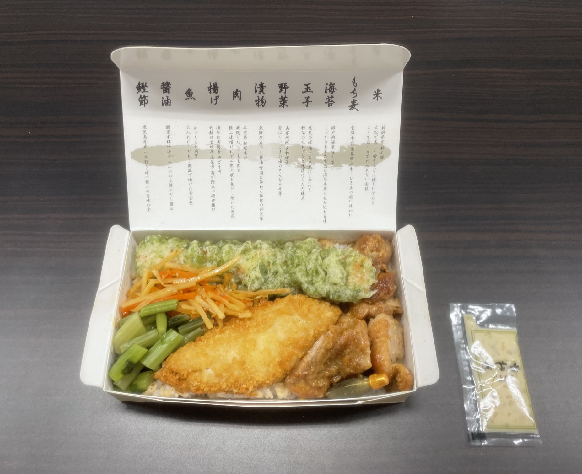 “高級海苔弁当専門店”として話題の同店ののり弁を、靖国通り本店でようやく購入。定価税抜1080円+レジでおすすめされたタルタルソース50円+レジ袋5円で、合計税込1135円。製造者はおそらく同店店内、熱量は不明。おかずがご飯の上に載る一体型で、添付調味料は金の鯛の容器(!)に入った醤油がひとつ。おかずの種類を裏蓋に書かれた説明文とともに紹介。まず「ふっくらと肉厚 火入れにこだわり低温で揚げた黄金色」の白身魚フライ、「海苔は青海苔 四万十川 竹輪は宮城県塩釜市 海が際立つ磯辺揚げ」のちくわ天、「美容同源 食物繊維 香ばしいごまの油にきんぴら牛蒡」のきんぴら、「三重県松坂名物 厳選したとりもも肉を極上味噌だれで二度三度と焦がし焼いた逸品」の鶏の唐揚げ、「魚沼産煮干し醤油 雪国に伝わる伝統の」野沢菜、そして「元気の源 極上の半熟にこだわり秘伝のたれでひと晩煮込んだ珠玉」の味玉の計6種。その仰々しい説明もさることながら、手に持ってみるとずっしりと重たいその迫力にややビビりながらの実食。白身魚フライは、「火入れにこだわり低温で揚げた」せいか、確かに身が驚くほどソフトでしっとり。元は冷凍品なのだろうが、それを感じさせない特別な美味さがある。ちくわ天は、香ばしい青海苔がたっぷり、ちくわ自体もしっかりとした魚の味を感じさせるもので非常に良い。きんぴらはごま油がかなり効いているタイプのもの。量が多めなのもうれしい。鶏の唐揚げは、ずいぶんとパンチのある味噌味で美味しいが、この弁当の中では存在が異質でやや浮いている印象あり。野沢菜も唐揚げ同様、漬け物としては濃いめの味。ご飯のお供というより酒のつまみに合いそう。ご飯の中に埋もれていた味玉は、確かに絶妙な半熟で、海苔とご飯との相性はバッチリ。量的には半玉ではなく全玉ほしかったところ。で、ご飯のほうは、白米ともち麦がブレンドされたものになっており、「新潟県産新之助 大粒で美しく嚙むほどに優しい甘みとこくを感じる忘れられない余韻」の白米も、「食欲 食感 栄養満点 香りひき立つ高い味わい」のもち麦も、薀蓄どおりのクオリティの高さを感じさせる味わいだ(単に説明文に洗脳、感化されただけかもしれないが)。海苔も「瀬戸内海産 浮き流し しっかりとした食感に海苔本来の包み込む旨味」がそう言われれば感じられないこともない。というか、磯の風味がしっかりあって、安っぽい海苔ではないことだけは確かだ。海苔の下のおかかの量も多めでうれしい。というわけでの今回のこの高級のり弁、総合評価は8点(10点満点中)。値段相応の満足感は確実にある。ちなみに、ご飯の量も多く、食べごたえがあるが、どのおかずも味濃いめにチューニングされているので、1回の食事というよりは酒のつまみとして向いているのり弁といえそうだ。