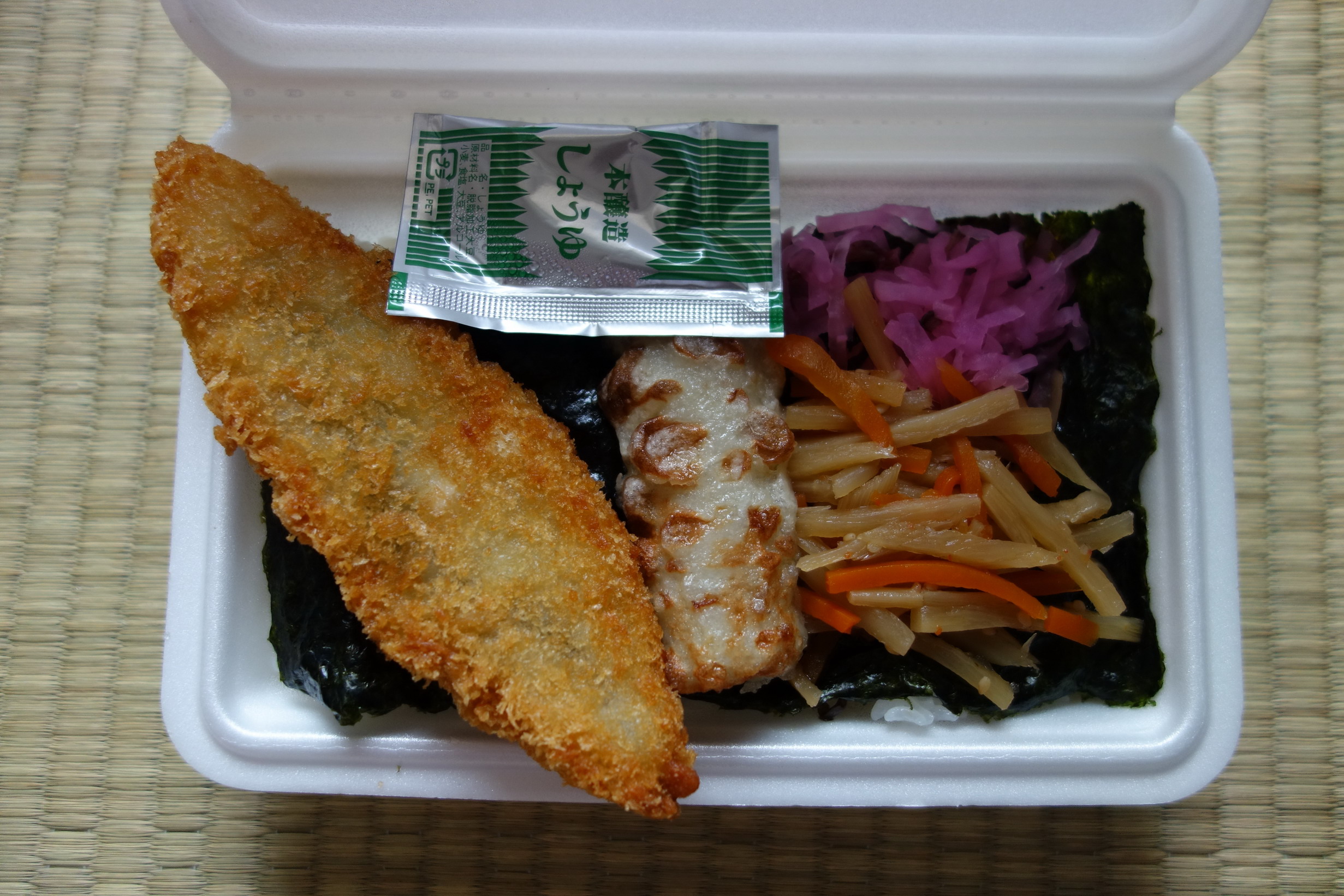 自宅から徒歩圏内にある弁当店だが、これまで一度も利用したことがなく、てっきり個人経営店と思っていた。しかし今日よく見たら、看板の片隅に145号店とあったからチェーン店であるらしい(家に帰ってからネットで調べてみたがそのチェーンに関する情報はいっさい出てこなかった)。年配の女性(レジ)と年配の男性(調理担当)という人員構成なので、夫婦で経営している店のようだ。買ったのは、のり弁当370円(税込)。カロリーは不明。注文を受けてから男性がフライヤーにフライを投入したのでおっと思う。ランチタイムであるにもかかわらず作り置きはしない方針のお店のようだ。結果として相当待たされたが、揚げたてのフライが食べられるのかーと期待感を高めつつ帰宅。そして実食。容器は発砲スチロールのフタと弁当箱部分がくっついている、今では少数派となったもの。ご飯の上におかずが載る一体型タイプで、全面に敷きつめられた海苔オンザご飯の上に白身魚フライ、ちくわ天、きんぴら、大根の桜漬けが置かれた典型的なオールドスタイル。ちくわ天は小さめ、白身魚フライもやや細身だが、きんぴらと大根の桜漬けが多めなのがうれしい。海苔の下はこれも定番のおかかと昆布のつくだ煮。これも量がやや多め。調味料は醤油のみだが、同行者が買った鮭のり弁当(フライの替わりに焼き鮭が載っている以外はのり弁と同じもの)には、添付されていなかったので、これはフライのみにかけるものと解釈し、あえてちくわ天には使用しなかった(そのちくわ天、だからなのか、ほんのり甘い味つけがついていた)。で、やはり白身魚フライがとても美味かった。普段のり弁において、まずいとも思わないがとりたててすごく美味いと思ったことのない白身魚フライだが、揚げたてはこんなに柔らかでジューシーなのかと大げさではなく舌を巻いた。きんぴら、大根の桜漬け、おかか、昆布のつくだ煮の量が多めなのも功を奏しており、後半はそれらのものがご飯ととともに容器の中でカオス状態となっていくのも非常によかった。やはりのり弁はセパレートタイプでないほうが美味い。そんな当たり前のことにも気づかせてくれたということで、フライのクオリティとも合わせて高評価の8点(10点満点中)を与えたい。また食べたい。
