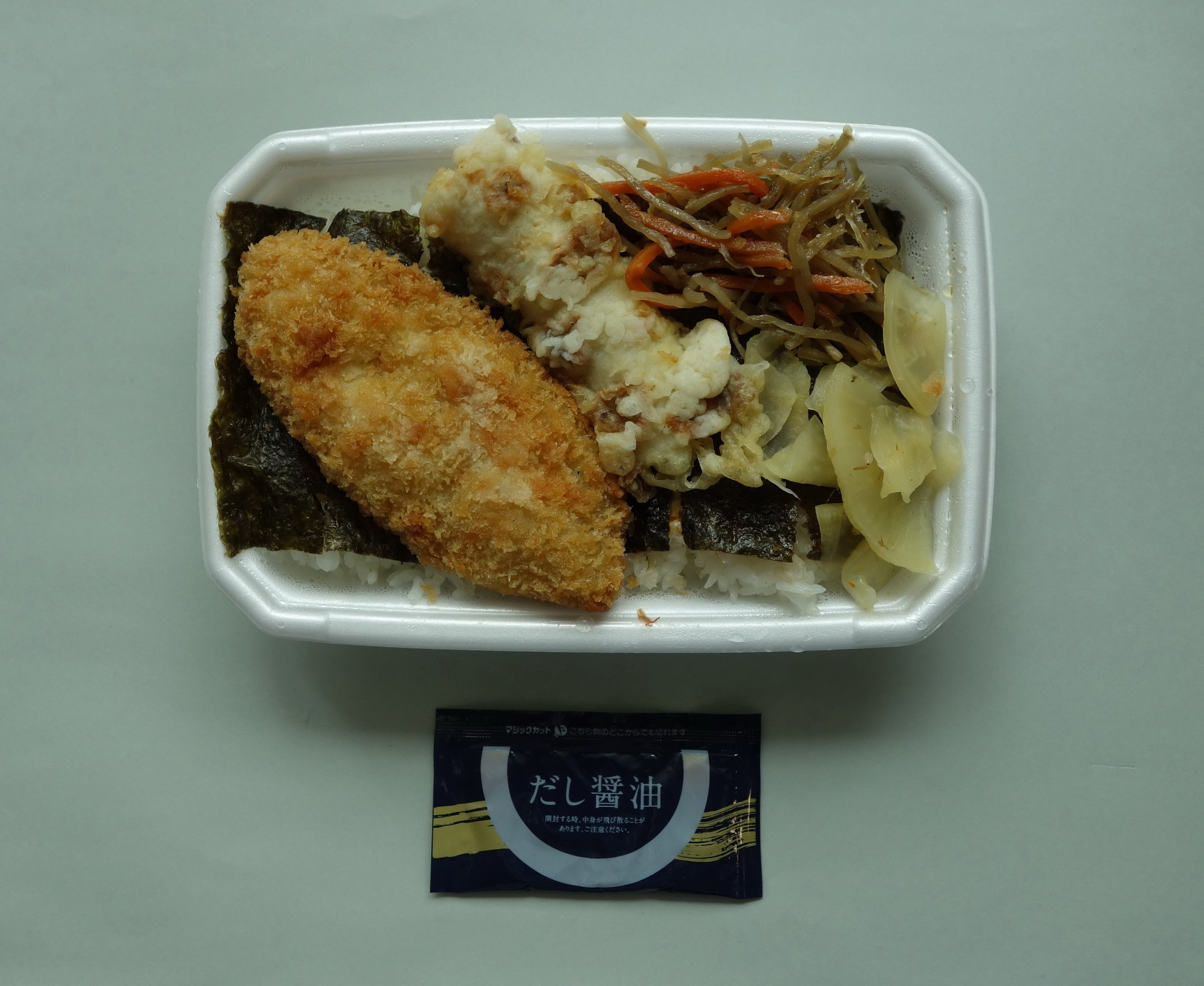 6月から同弁当チェーンののり弁が完全リニューアルという、衝撃的なニュースがのり弁界に飛び込んできた。「白身魚が120%にボリュームアップ」し、添付調味料も「芳醇なプレミアムソースと魚介の旨みが効いた、だし醤油、選べる2つの新ソース」になったらしい。さらに基本の「のり弁当」に加え、「チーズおかかのり弁当」「特のりタル弁当」「新・BIGのり弁当」の3種が新たにメニューイン、と大変な事態になっている。というわけでさっそくその中の「チーズおかか弁当」を実食。定価税込390円、熱量724キロカロリー。すべてのおかずがご飯の上に載る一体型で、製造者は有限会社シオン。選べる添付調味料は「だし醤油」をチョイスした。おかずの内容は、白身魚フライ、ちくわ天、きんぴら、大根の漬け物……と基本ののり弁と同様だが、海苔の下にチーズが混入されているというのがポイントとなっているらしい。食べてみると、白身魚フライは確かに若干巨大化しているような気がするが、ほっともっとののり弁を食したのは相当前なので正直よくわからない。ただし、揚げ方、身の柔らかさ等、さすがはメジャー弁当店といったクオリティの高さで相当に美味い。対して、ちくわ天はこんなにちっちゃかったかしらと思える貧弱さでちょっと残念。味も普通に思われた。きんぴらは逆にかなり大量で食べごたえあり。大根の漬け物も大きく切ってあってボリュームがある。一方、ご飯のほうは、チーズがグワッと主張してくる感じではなくほんのりチーズ感を感じさせるもので、おかずもご飯も邪魔しない。チーズ好きにはものたりないかもしれないが、バランスはちょうどよい。海苔の面積が広く、しかも食べやすいよう細かく切ってあるのもポイントが高い。それから、最後にどうしても付記しておきたいのが「だし醤油」の素晴らしさ。「厳選した本醸造醤油に、かつおやさば、昆布の旨みを効かせた豊かな味わい」だそうだが、確かにその通りの美味しさ。色も黒でなく黄金食。白身魚フライにかけてもちくわ天にかけても最高だった。総合評価は9点(10点満点中)。次はぜひプレミアムソースのほうを試してみたい。