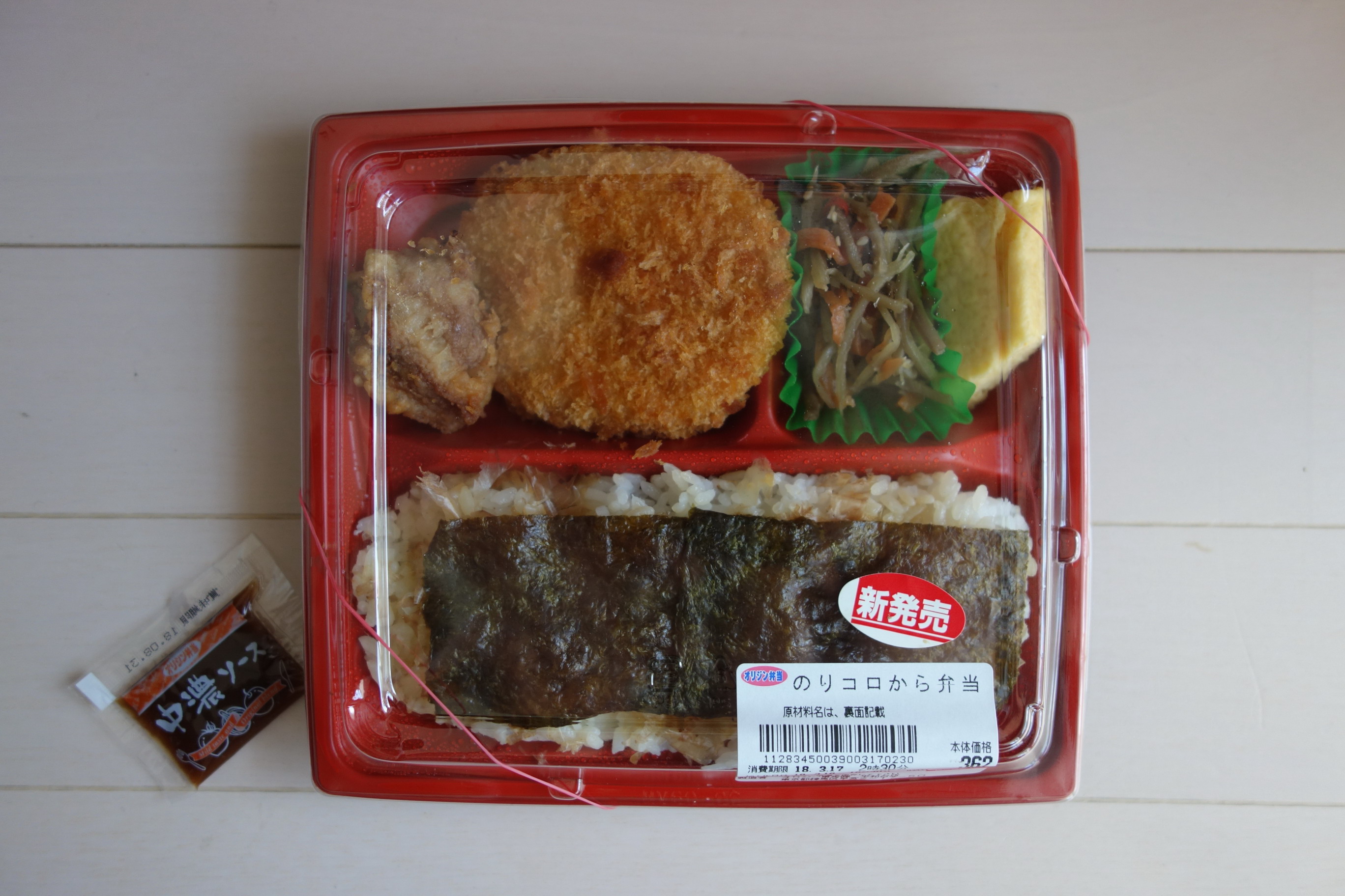 早口言葉みたいなネーミングののり弁が同店から新発売。さっそく買ってみた。定価税込390円。熱量は不明。製造者はオリジン東秀平和台店。ごはん部門とおかず部門が分かれた位置にあるセパレートタイプで、添付調味料は中濃ソース一袋のみ。おかずの種類は多くなく、巨大なコロッケ、唐揚げ1個、きんぴら、卵焼きという布陣。で、実食してみると、コロッケは、かなりしっかりした食感で食べごたえがあるもの。そして、見た目どおりにソースが足りないくらいのボリュームがある。唐揚げは、唐揚げ弁当からの流用と思われるが、濃い味つけで安定の美味しさ。きんぴらは、シャキシャキした食感がめずらしい品で、ずいぶんと薄味。だが、揚げ物が中心なので箸休めにはちょうどいい感じ。卵焼きはいかにも工場でつくられたものではあるが、味は意外と優しめ。一方、ご飯サイドに目を転じれば、おかかの量が多いのが特徴的で、この点はプラスに評価したい。が、総合的な評価は低めの4点(10点満点中)。やはり白身魚フライではなく、コロッケが主役というのが、なんとも華がないというか意気が上がらないというか、地味な印象が拭いきれない。その地味な印象を唐揚げ1個では挽回できなかった感がある。次の新商品に期待したい。