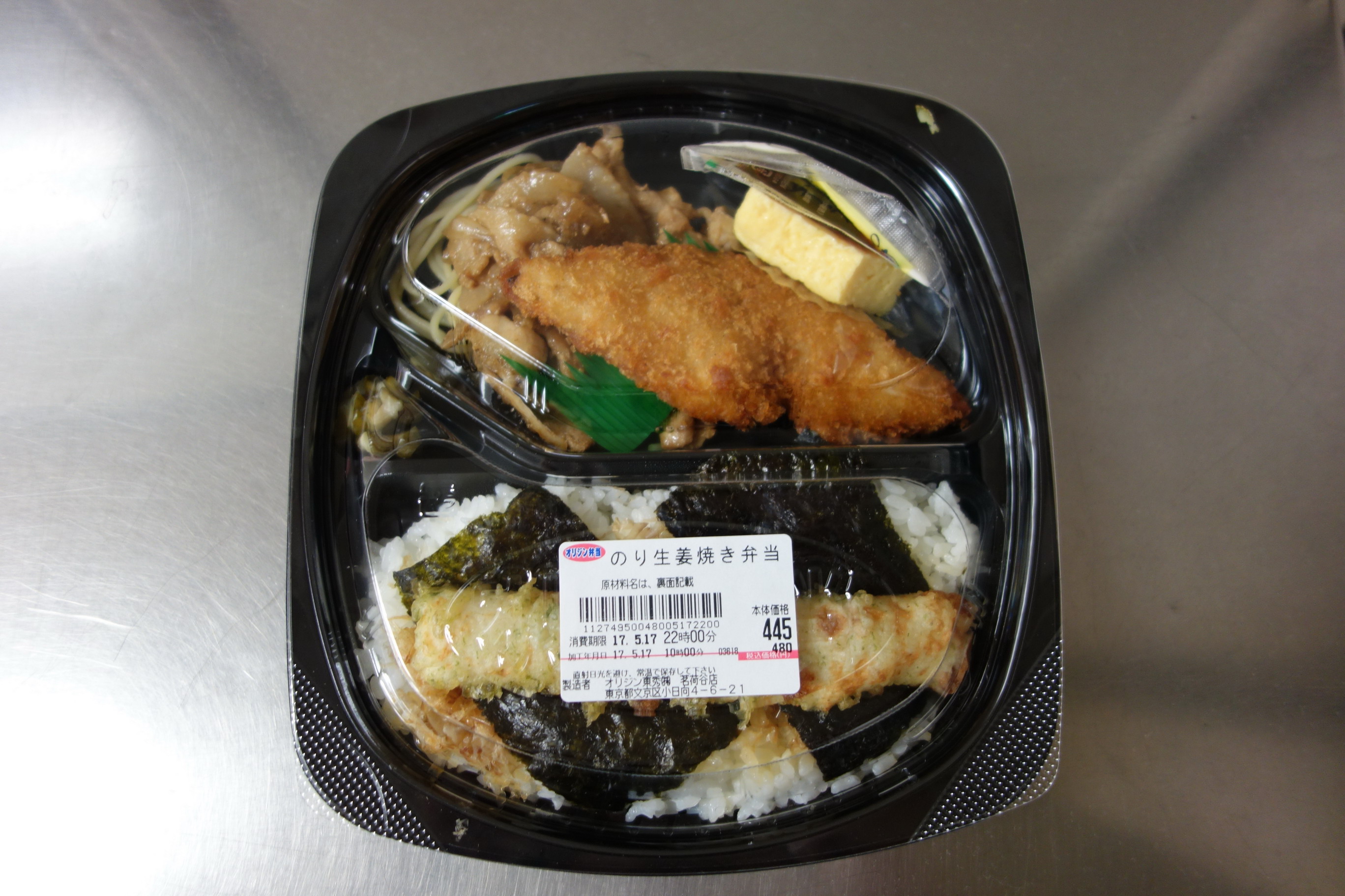 定価税込480円。熱量は不明。製造者はオリジン東秀株式会社茗荷谷店。おかずとご飯が分かれているが、海苔の上にちくわ天が載っているので完全なセパレートとも言えず、ハイブリットタイプと呼ぶべきかもしれない。そのほかのおかずは、白身魚フライ、卵焼き、キュウリの漬け物、つけ合わせの具なしスパゲティ。添付調味料は、醤油とタルタルソース(オリジン東秀オリジナル)の2種。生姜焼きは好きなので期待しながら実食。白身魚フライは、やわらかくジューシー。タルタルソースの量も多めで美味しい。ちくわ天は、細くてたよりないものだが、香ばしくしっかりした味。対して、期待していた生姜焼きは割と普通な感じで、弁当名に入れるのならもっと量がほしかったところ。卵焼きは、工場製品で可もなく不可もなく。総じて、量にはやや不満があったが、のり弁当に生姜焼きが入っているのは食べごたえ感が増すし、全体のバリューがワンランクアップしたような気になる。評価は7点。前回の「のりチキン竜田弁当(きんぴら)」同様、海苔とご飯のあいだのおかかが、多めだったのもうれしい。