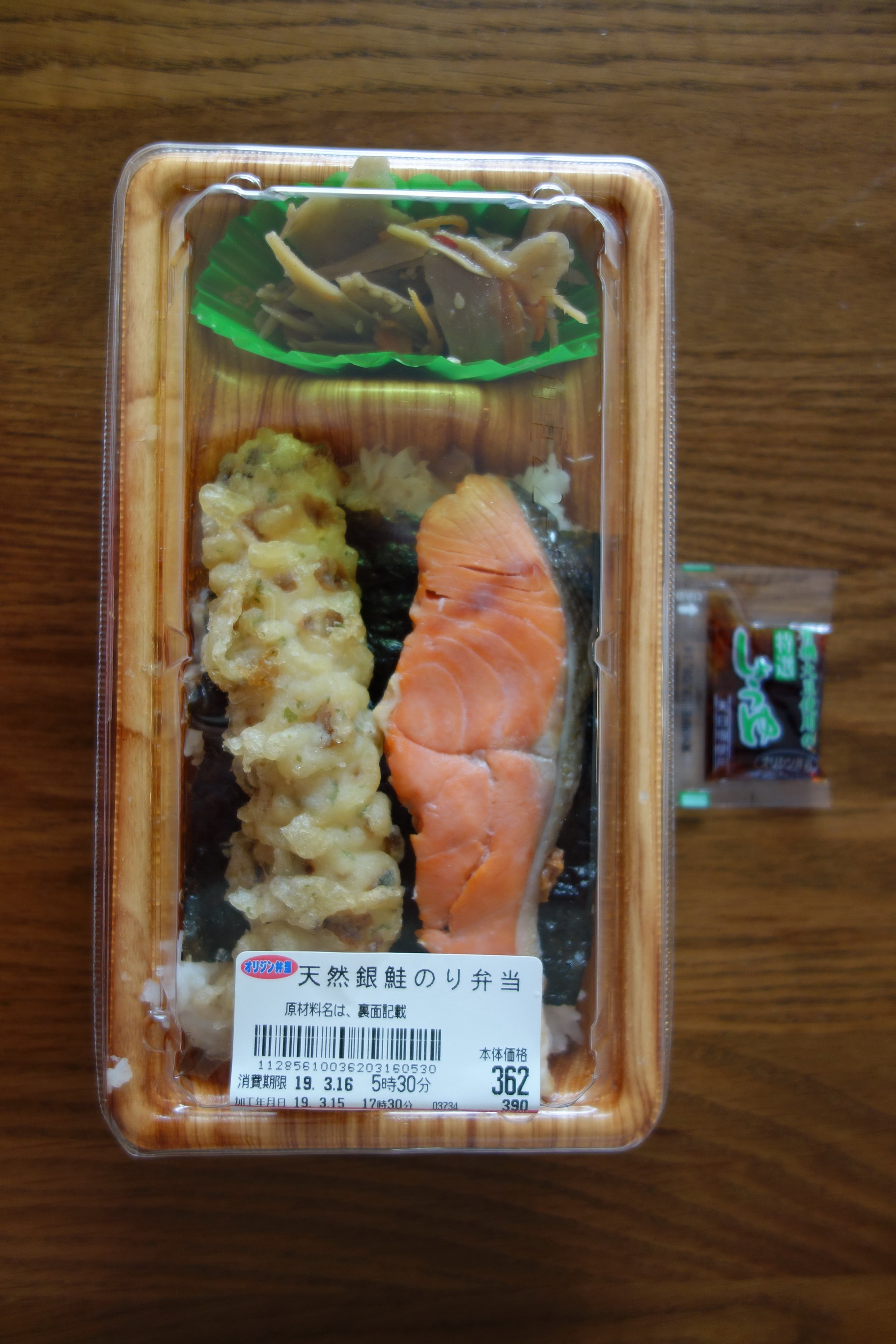 定価税込390円。熱量は記載なしで不明。製造者はオリジン東秀株式会社平和台店。ご飯の上におかずが載る一体型で、添付調味料は醤油(有機大豆使用の特選)のみ。焼き鮭を使ったのり弁は、同店においてこれまでありそうでなかった一品だ。ただ、そのほかのおかずはちくわ天ときんぴらだけで、要するに基本形ののり弁の白身魚フライが焼き鮭に替わっただけの芸のないのり弁ともいえる。ということもあり、たいして期待もせずに実食。焼き鮭は「こんなものか」程度の味だが、わりあいビッグサイズである点を評価したい。ちくわ天のほうもかなり長さのあるもので、これはいつものように量的な満足感がある。きんぴらも量が多く、厚めに切られたゴボウの食感が楽しい。海苔とご飯のあいだに挟まれているものはおかかのみで、ここは昆布のつくだ煮もほしかったところだが、まあ贅沢は言うまい。というわけで、最終的な評価は6点(10点満点中)。焼き鮭がメインであるものの全体的なボリューム感があるので、白身魚フライ版と比べてのものたりなさはあまり感じなかった。