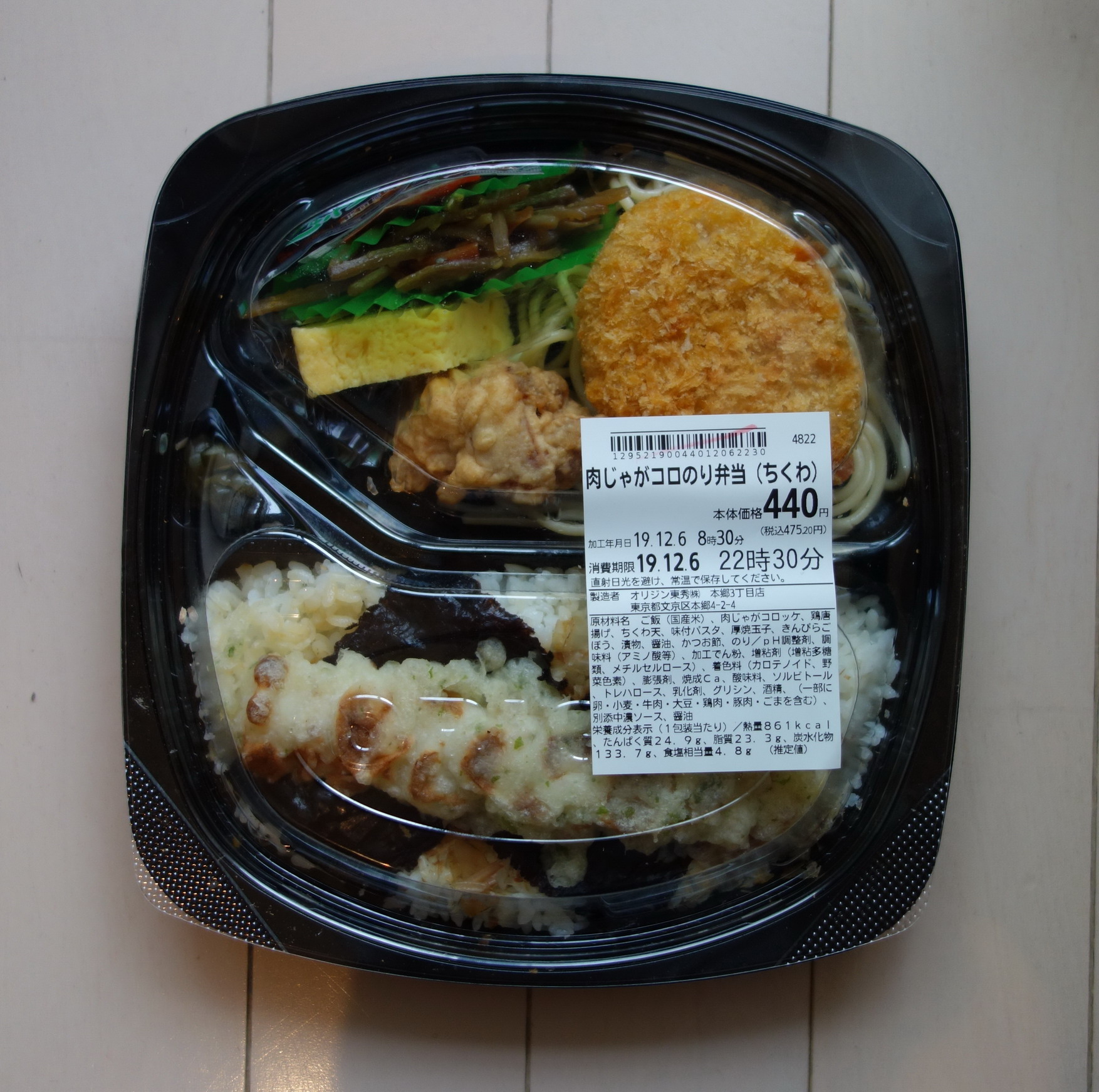 定価税込475円、熱量は不明、製造者はオリジン東秀株式会社本郷三丁目店。おかずの一部(ちくわ天)がご飯の上に載る半セパレートタイプで、添付調味料は「オリジン弁当オリジナルの特選しょうゆ」と「中濃ソース」の2種。弁当名だけ見ると、肉じゃかの入ったのり弁かと思ってしまうが、さにあらず、肉とじゃがいも入りのコロッケが入ったのり弁ということらしい((ちくわ)とわざわざ表記してあるということは、違うバージョンの肉じゃがコロのり弁当も存在するのだろうか?)。そのほかのおかずは、ちくわ天、きんぴら、鶏の唐揚げ、卵焼き、キュウリの漬け物、つけ合わせの具なしスパゲティという布陣。肉とじゃがいもの入ったコロッケなんて考えてみればごく当たり前のコロッケの仕様であり、なんでわざわざそれを強調した弁当名にしたのだろうと思いながらの実食。添付の中濃ソースをかけて食べたコロッケは、前述のとおり挽肉とジャガイモだけのごく普通のコロッケという感じで、それ以上の感想はなし。ちくわ天は、さすがのオリジンクオリティで、からっと揚がっていて海苔の風味も香ばしい。きんぴらも同様にコクがあって安定の美味さ。唐揚げは衣が厚くイマイチな品。卵焼きは甘くなくさっぱりとした味で、いつものオリジンのものとは違う印象がある。漬け物とスパゲティについては割愛。ご飯のほうは、いつも通りおかかがたっぷり目で、これもうれしいオリジンクオリティ。ブレだとは思うが、ご飯が硬めに炊けているのも個人的にはありがたかった。というわけでの総合評価は6点(10点満点中)。全体的には普通に美味しいのり弁という感じだったが、単なる普通のコロッケをメインに持ってきたのはやや強引だったのではないかという感想を抱いた。