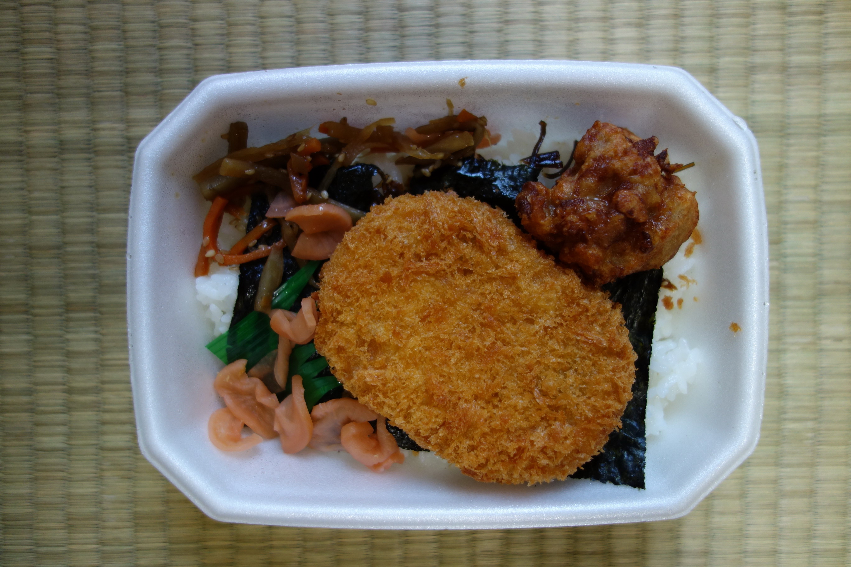 同店は西友系列の持ち帰りお弁当チェーン。最寄り駅の近くにある店が明日で閉店するということがわかり慌てて購入しに行った。海苔の上に載るものがキャベツメンチか野菜コロッケかを選べる「のり弁当」と、白身魚フライが載る「のりタルタル弁当」の2種類ののり弁があり、前者は定価税込270円、後者は定価税込280円。本当は後者が食べたかったのだが、このブログのためにあえて基本形である「のり弁当」のほうをチョイスした。ただし、キャベツメンチは売り切れとのことで、載せ物は強制的に野菜コロッケということになってしまった。カロリーは不明。ちなみに閉店前日だからか、そのほかの弁当もほとんど売り切れ状態となっていた。弁当の内容は、野菜コロッケ、唐揚げ1個、きんぴら、大根の桜漬けのみという極めてシンプルな構成で、海苔の下も意外性まったくなしのおかかと昆布のつくだ煮。調味料は容量少なめのソースのみ。本位ではなかった野菜コロッケは、グリーンピースやコーンなども入り、ホクホクしていて、期待値が低かったせいかまあまあの美味しさ(でもコロッケ自体大きめなのでもっとソースがほしい)。唐揚げ、きんぴらは普通。全体的に270円ならこんなものかなという感想しかないが、コロッケを注文を受けてから揚げていた点を評価して5点(10点満点中)。このように毎度揚げたてであるのなら閉店前に白身魚フライのほうもぜひ試してみたかった。