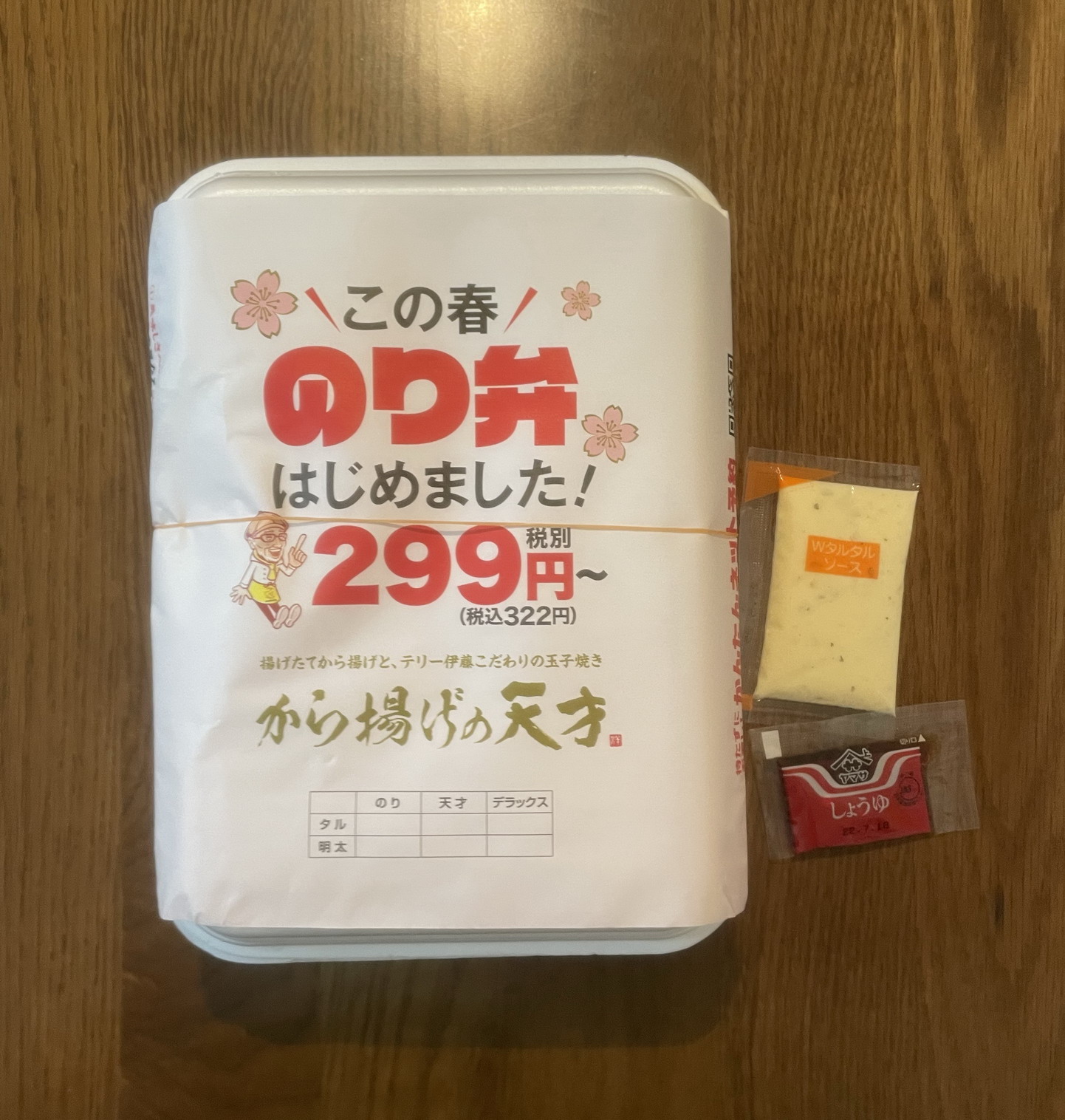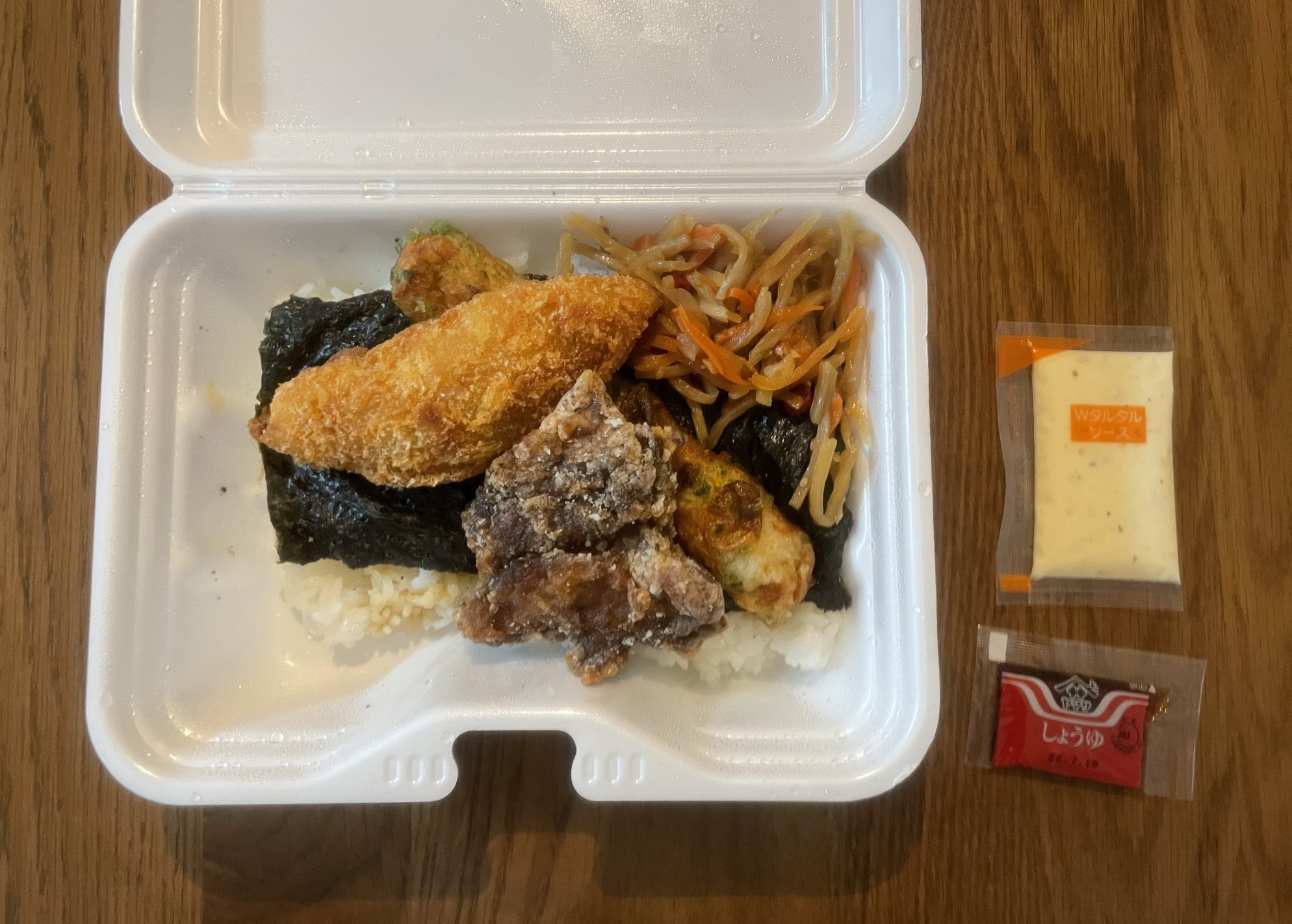 テリー伊藤がプロデュース(社長?)している同店が、この春から、欧風カレーに続いて、のり弁の販売を開始。唐揚げ専門店であったはずなのにこうした方向転換をするというのは、いろいろ大変だからなのか、あるいは業績好調のさらなる事業拡大のためなのか。定価税込463円、熱量は記載なしのため不明。製造者はおそらく同店店内。すべてのおかずがご飯の上に載る一体型で、添付調味料は、Wタルタルソース(なにがWなのかは不明)とヤマサ製の醤油、がそれぞれ一袋。基本形ののり弁税込322円(白身魚フライ、ちくわ天、きんぴら)に、タルタルソースと同店自慢の揚げたて唐揚げ「デカから」が一個追加されているという仕様だ。これにさらにクリームコロッケが加わると、税込571円の「タルタルデラックスのり弁」になるようだ(そのほかのり弁には全10種類のバリエーションがあり)。テリー伊藤こだわりの味、という触れ込み、そして意外に大きな容器に期待しながらの実食。さっそくフタを開けてみると、容器の大きさに対して中身の量がそれほどでもない。そのため持ち帰り時に片寄ってしまったせいで、残飯のように見えるのがとても残念。そしてまず手をつけた白身魚フライは、かなり小ぶりだが2枚重なっているのではと思うほど厚みがあり、食べごたえはある。タルタルソースのWというのは量のことだったのだろうか。フライの大きさに比してソースをやや持て余した。ちくわ天は、かなり細くひょろっとしたもの。厚さも薄くペラペラ。しかも揚げすぎたのか硬くなっていてがっかりな品。青海苔の風味もすっかりとんでしまっている。きんぴらは、量が多めのはいいとして、味がほぼしない。鷹の爪の輪切りも入っているのになぜだか辛味も感じなかった。そして期待の鶏の唐揚げであるが、これも揚げすぎなのかなんだか妙に硬いもので、火を通しすぎた竜田揚げのような品。これが看板メニューなのか、とずいぶん拍子抜けしてしまった。ならば、とご飯のほうに箸を進めると、それなりに広い面積の海苔、の下には、おかかのみならず、昆布のつくだ煮も少なくない量で挟まっており、こちらのほうはなかなかよかった。……というわけでの総合評価は4点(10点満点中)。のり弁自体のクオリティはまあ普通といえるが、肝心の唐揚げに満足感がなかったのは致命的。もしかして「外はサクサク、中はジューシー。秘伝のタレに丸1日つけこんだもも肉を丁寧に2度揚げした本格から揚げ」の事前情報に感化され、ハードルを上げすぎてしまったのだろうか。