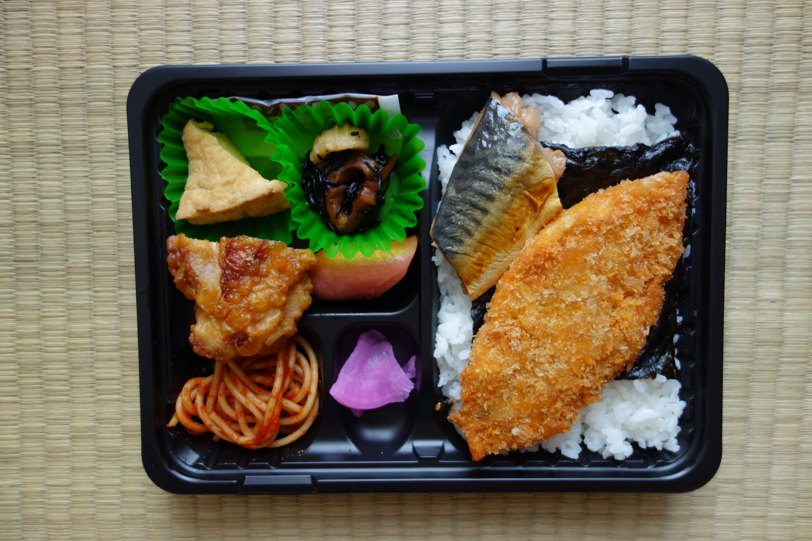 近所の商店街にある小さな総菜店。コロッケや唐揚げなどの惣菜を対面販売しており、それを利用した弁当も一緒に売っている。ロースとんかつ弁当、焼肉弁当、唐揚げ弁当などは一律400円均一で、のり弁当だけが300円(税込)。カロリーは不明。内容は、海苔オンザご飯の上に白身魚フライと鯖の塩焼き一切れ。おかずに、唐揚げ、ウインナー、厚揚げ煮、ひじきと竹輪煮、スパゲッティのケチャップあえ、大根の桜漬けという布陣。調味料はソースのみ。一見ボリュミーに見えたが、容器の底が浅く量はそれほどでもない。ただし、ご飯がほんのりと温かかったので、作ってからそれほど時間が経っていないように思われた。一見のり弁に見えないのは、海苔の面積が小さめなのとちくわ天の替わりに海苔の載っているのが鯖の塩焼きだから。その鯖の塩焼き、脂がのっていて美味だが、やはりこれがあることによってのり弁のイメージが薄れてしまい、幕の内弁当を食べているような気分にもなってしまう。唐揚げ、ウィンナー、厚揚げも美味しいが、その美味しさも逆にのり弁としてのあるべき調和(ジャンク感)を壊している。総菜店の特色を生かした弁当ではあるのだが、ここはシンプルな内容ののり弁に徹したほうがよかったのではないかと思った。というわけで評価は辛めの4点(10点満点中)。肝心の白身魚フライはいかにも業務用を揚げただけといった感じの食感で、揚げ物をメインに扱う総菜店のそれとしては非常に残念なものであった。