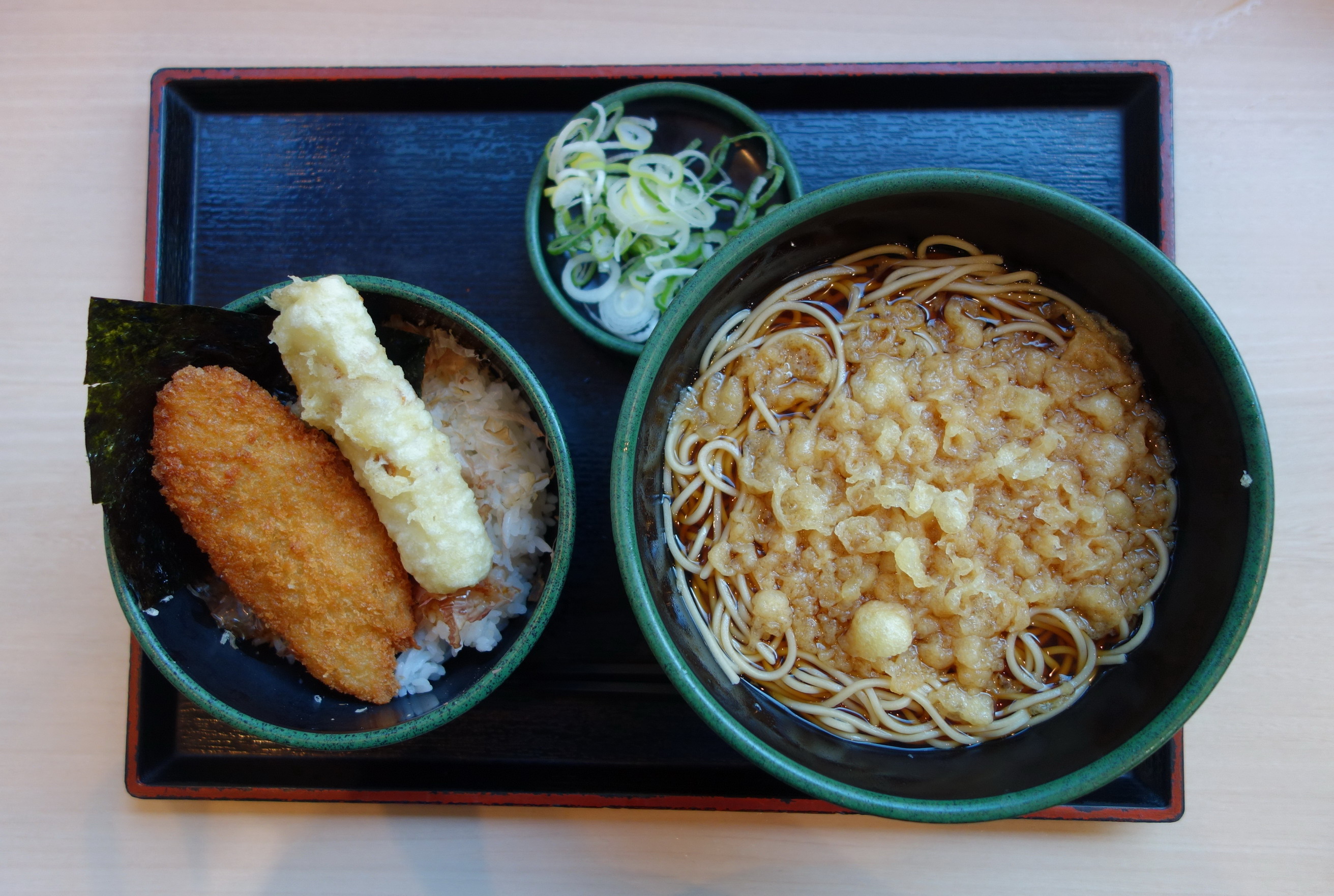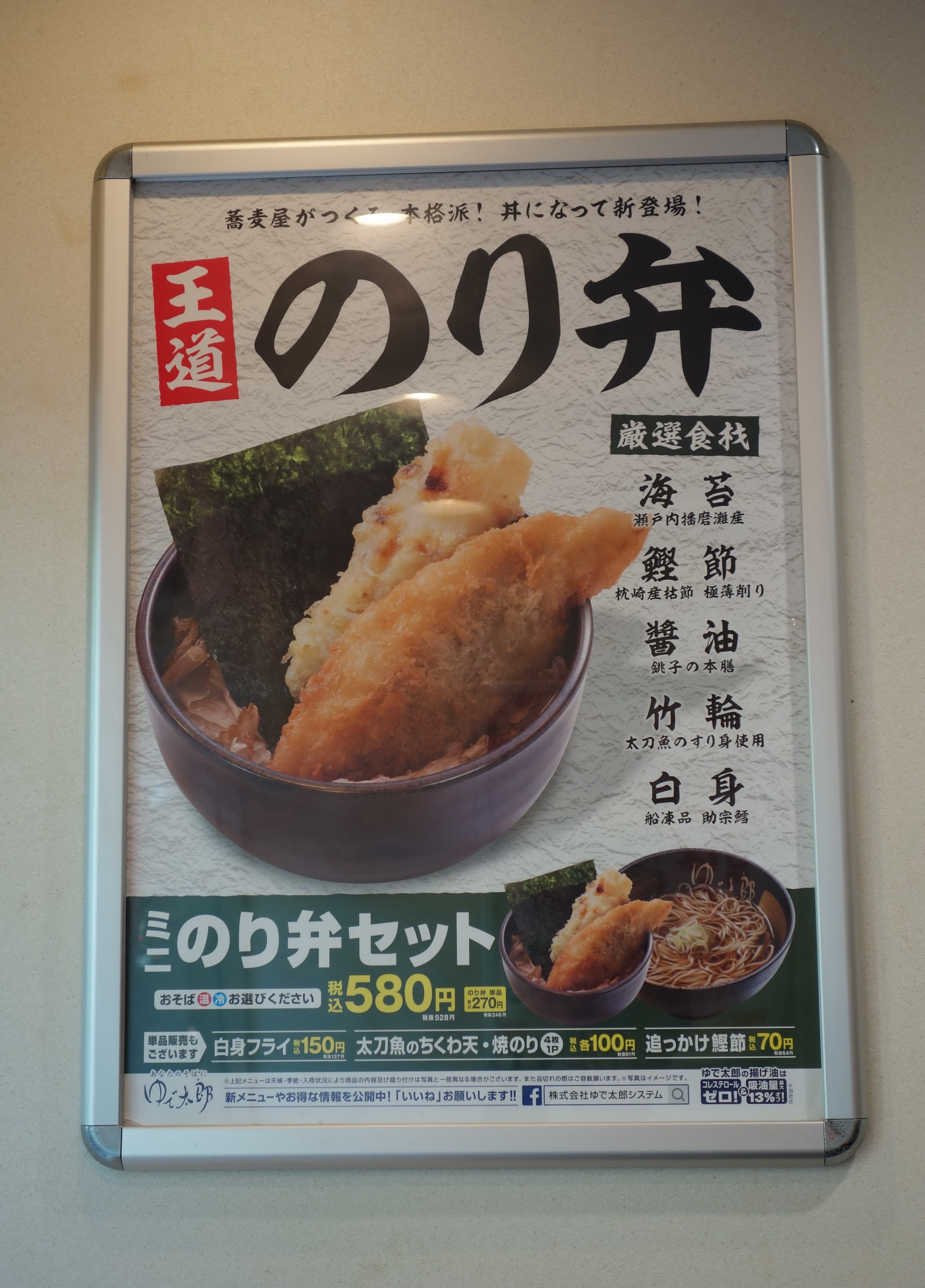 なんとびっくり、立ち食いそばチェーンのゆで太郎が期間限定?でのり弁を新発売。テイクアウトはしておらず店内飲食のみなので厳密には「弁当」ではないのだが、それでもなぜか頑なに「のり弁」を謳っている。単品で270円でも販売されているけれど、そばとのセットが基本らしいので、それをオーダー(冷たいそばと温かいそばを選べるので後者を選択)。定価税込580円。すべてのおかずがご飯の上に載る一体型で、熱量は不明。製造者も不明。添付の調味料はないが、料理を受け取るカウンターにソースと醤油があるので、それを使用した。おかずの内容は、白身魚フライとちくわ天の2種のみ。それが大きめカットの海苔の上にのっけられ、海苔の下のご飯の上にはおかか、という丼の構成になっている。厳選食材のこだわりが店内のポスターに掲示されていて、それによると、海苔は瀬戸内播磨灘産、鰹節は枕崎産鰹節の極薄削り、醤油(件のカウンターの醤油ではなく、おかかと混ぜ合わせている醤油)は銚子の本膳、竹輪は太刀魚のすり身、白身は船凍品の助宗鱈を使用しているのだという。どうして立ち食い蕎麦屋がのり弁を? そしてこの本気のこだわりぶりは一体?? と頭をはてなマークでいっぱいにしながらの実食。白身魚フライはふんわり柔らかめの仕上がりで、身もつまっていて普通に美味い。冷めていたが揚げたてならもっと美味かったろう。竹輪は青海苔なしのシンプルなもので、味も淡泊。上品さが感じられるテイストで及第点。海苔は品質のよさが実感できるパリッパリの食感で、磯の味がとても濃く口の中で広がった。これはすばらしい。極薄削りのおかかはとてもシルキッシュ。ご飯ともよくからんでいい働きをしてくれた。というわけで総合評価は8点(10点満点中)。飲食店の店内でのり弁を食べたのは初めての経験だが、奇をてらったものではない本気のメニューであることが伝わってきた一品だった。ただ、ひとつ、欠点としてわかったことは、のり弁は「そばと合わない」ということ。白身魚フライとちくわ天の揚げ物パワーがそばの繊細な味を邪魔してしまうのだ。……と筆者はそう感じたのだが、昼時で混みあう店内で割と多くの客がこのメニューを食べていたのが意外に思えた。