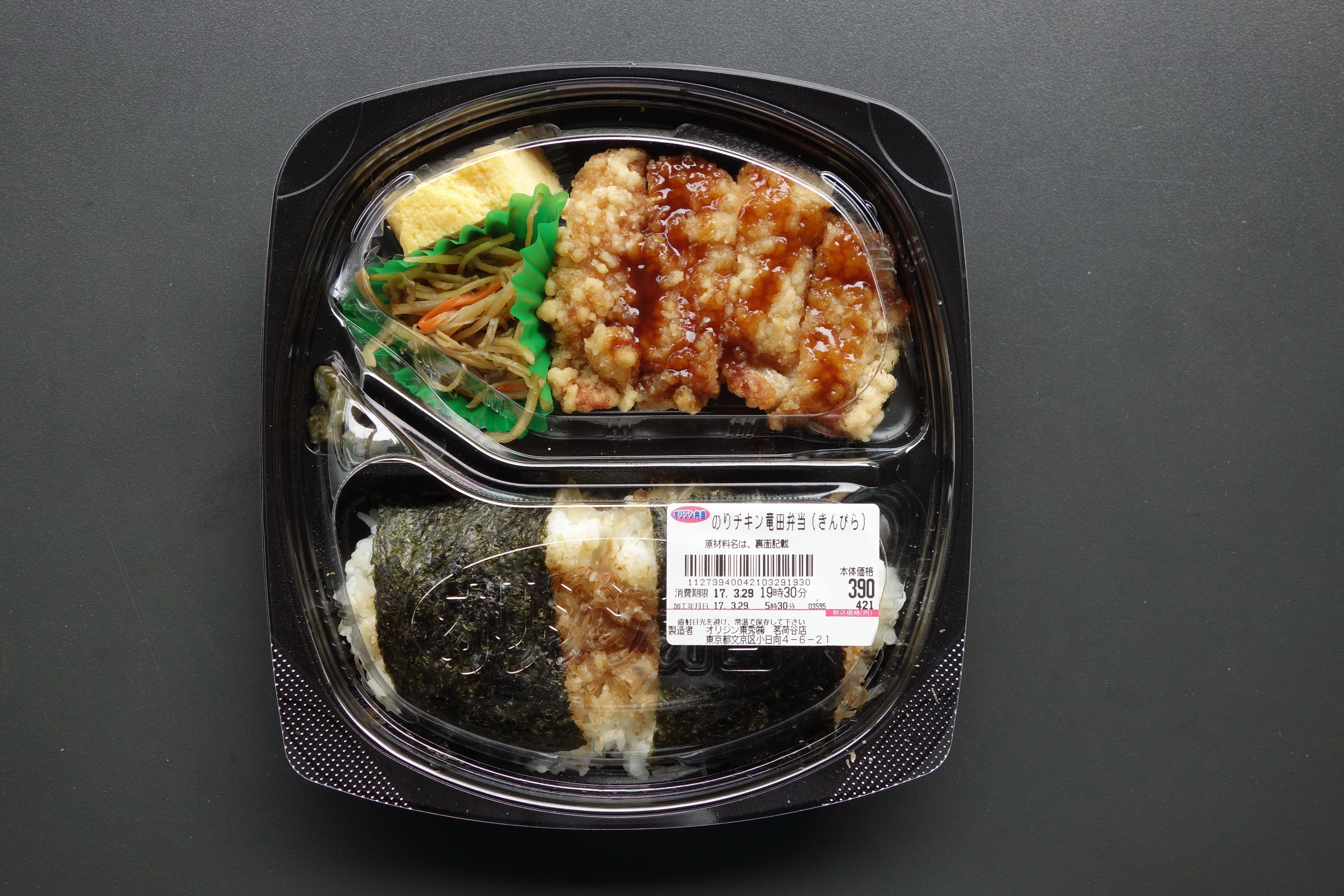 定価税込399円、熱量は不明。製造者は、オリジン東秀株式会社茗荷谷店。おかずとご飯が分かれたセパレートタイプで、おかずは、半分に切られた大きなハムカツが1枚、鶏の唐揚げ、卵焼き、きんぴら、キュウリの漬け物と、かなりボリューミーな感じのもの。ご飯の上には海苔が2枚。その下のおかかがたっぷりなのは、これまでのキッチンオリジンののり弁当と同じ。このボリュームで300円台はなかなかかもしれない……と思いながらの実食。メインのハムかつは、中身のハムが結構な厚さで、ハムかつなんてひさしぶりに食べたが、かなり満足できるもの。鶏の唐揚げも、同店の唐揚げ弁当からの流用だろうが、大ぶりで食べごたえがあって美味い。卵焼きは例によって工場製品で、コメントなし。きんぴらは、味は極めて普通だが、かなりの量に驚かされた。というわけで、総じての評価は高評価の8点(10点満点中)。マイナスポイントは、巨大なハムかつに対してのソースの量が足りなかったことくらい。味、量ともに全体的な満足感は高かった。